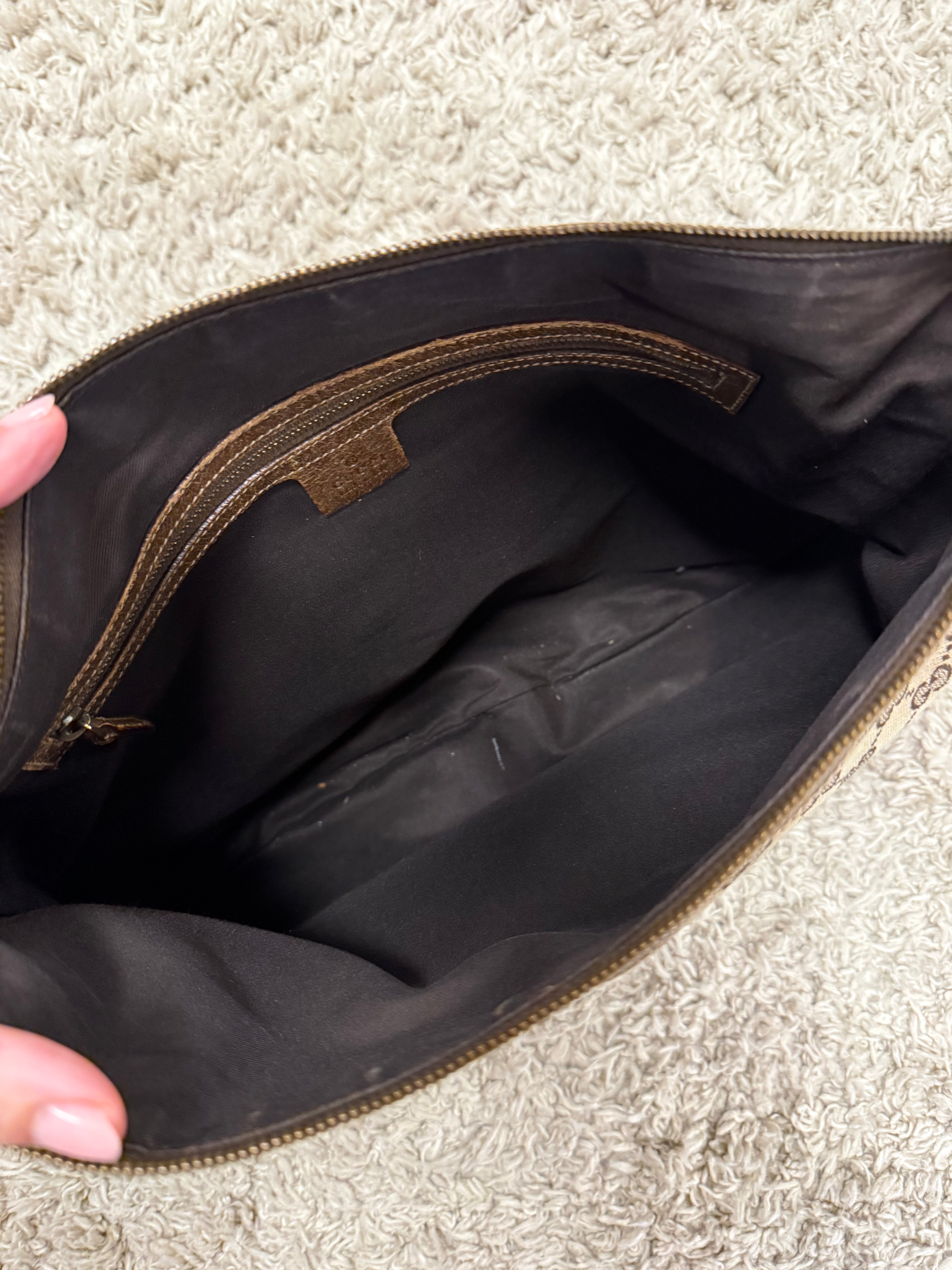 Schoudertas/crossbody tas met monogram. De hoeken en het leer vertonen wat gebruikssporen, verder is de tas in goede staat.