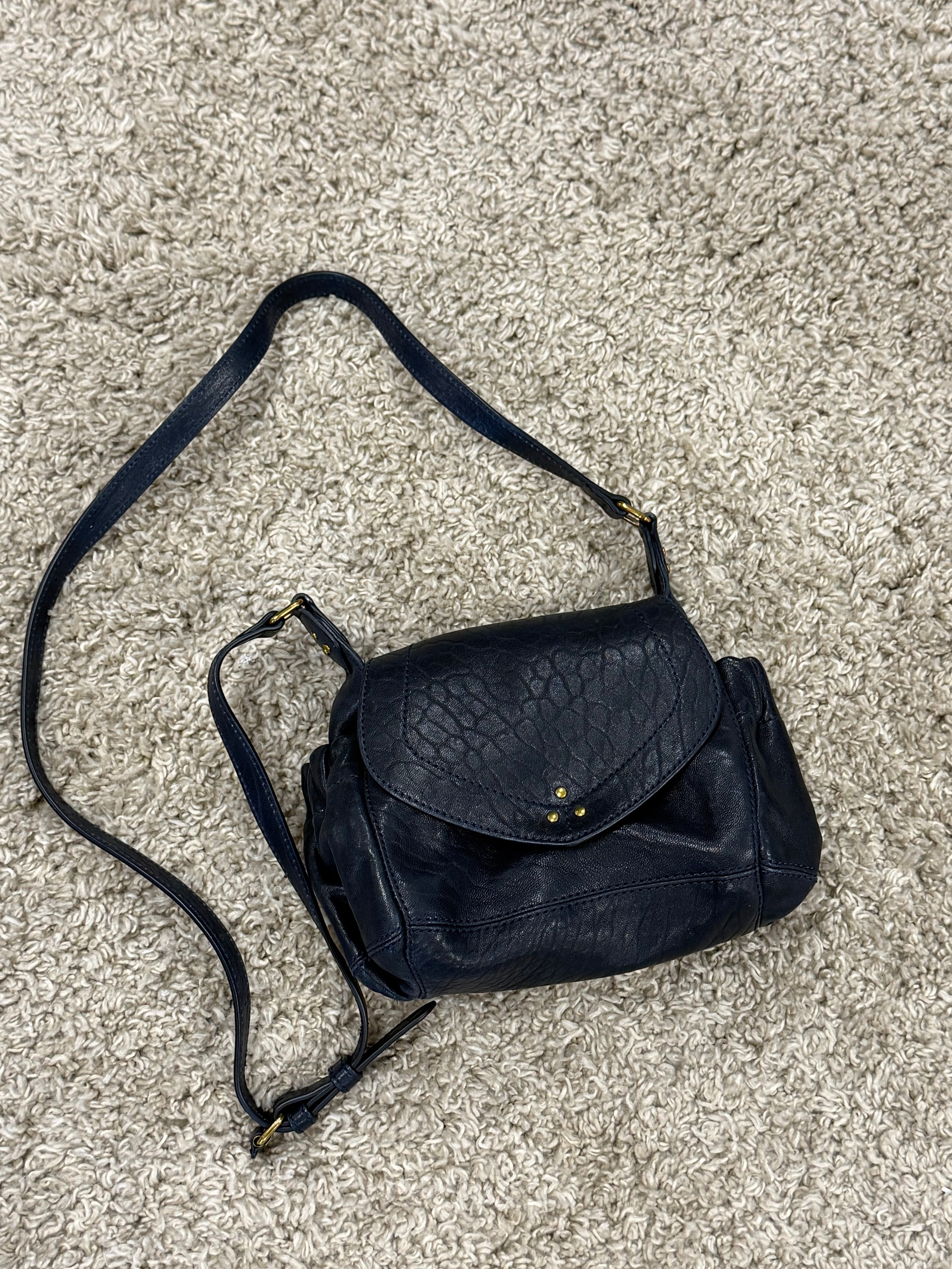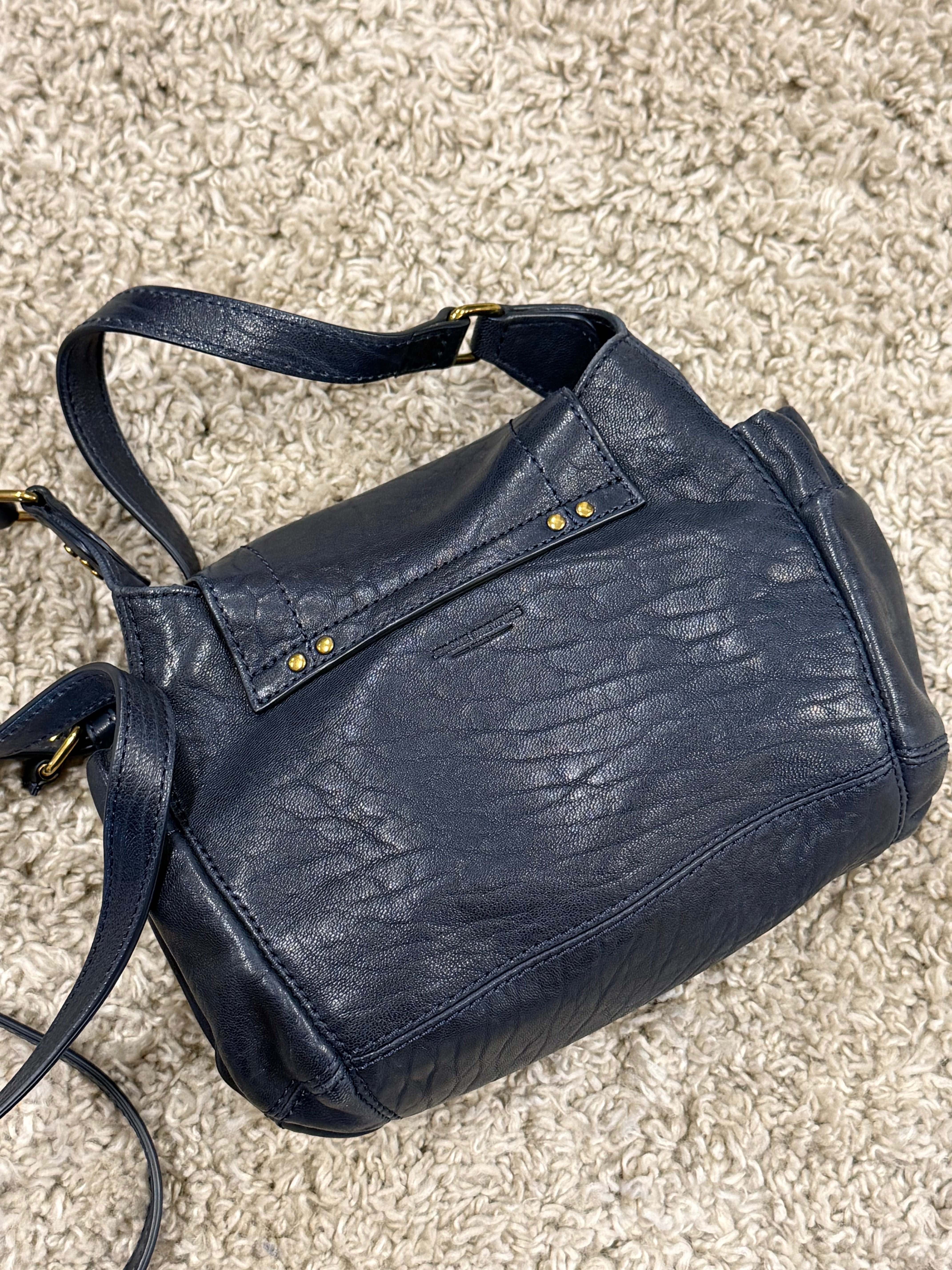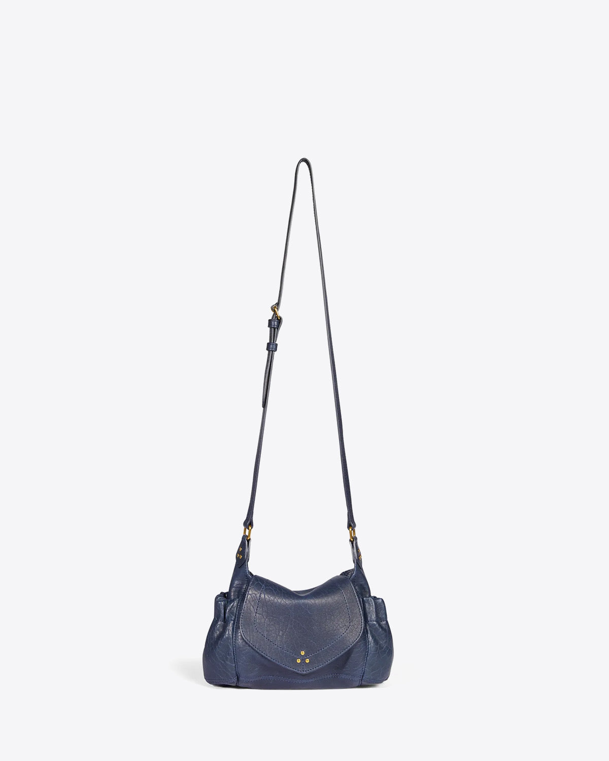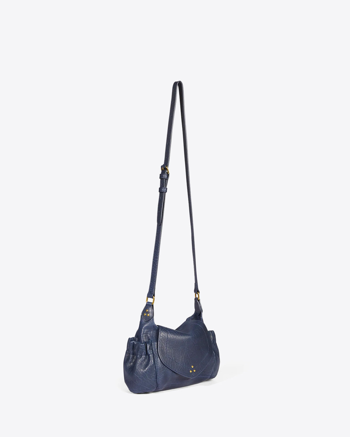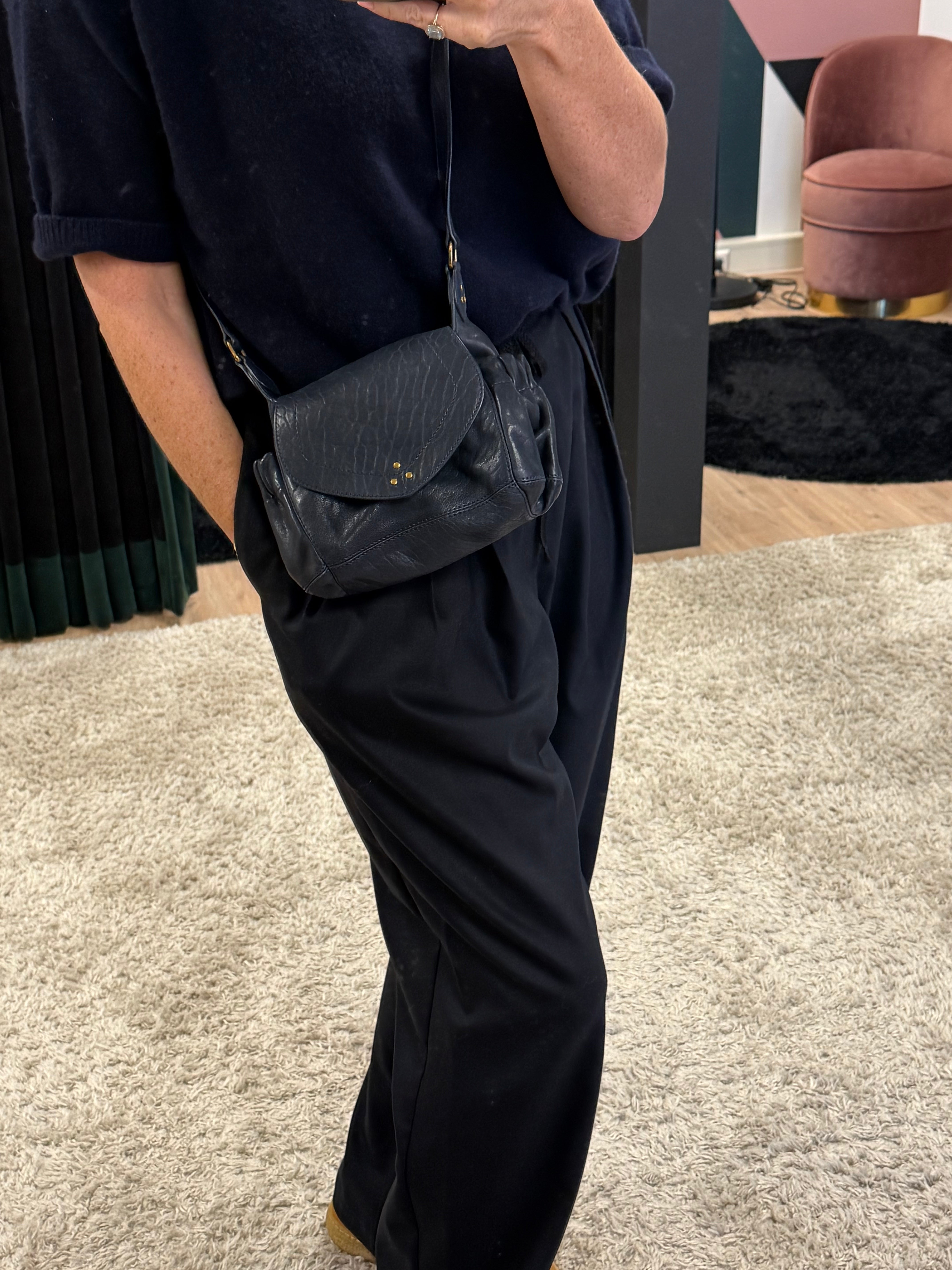 Donkerblauwe leren crossbody tas met een klep met magneetsluiting, binnenvak met klein vakje en verstelbare strap.