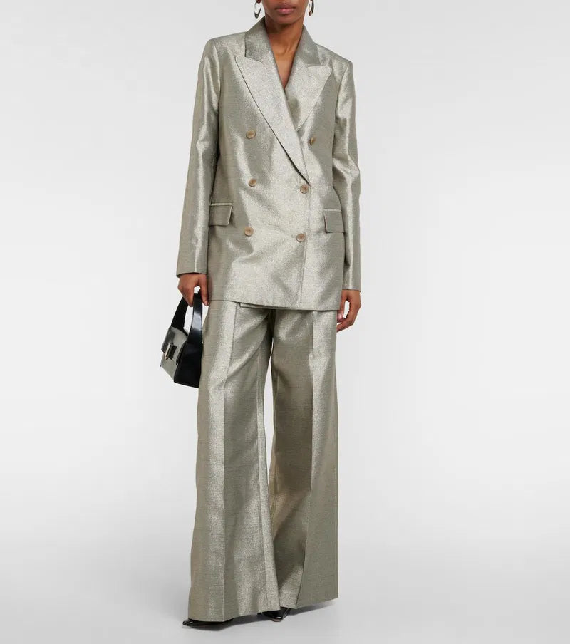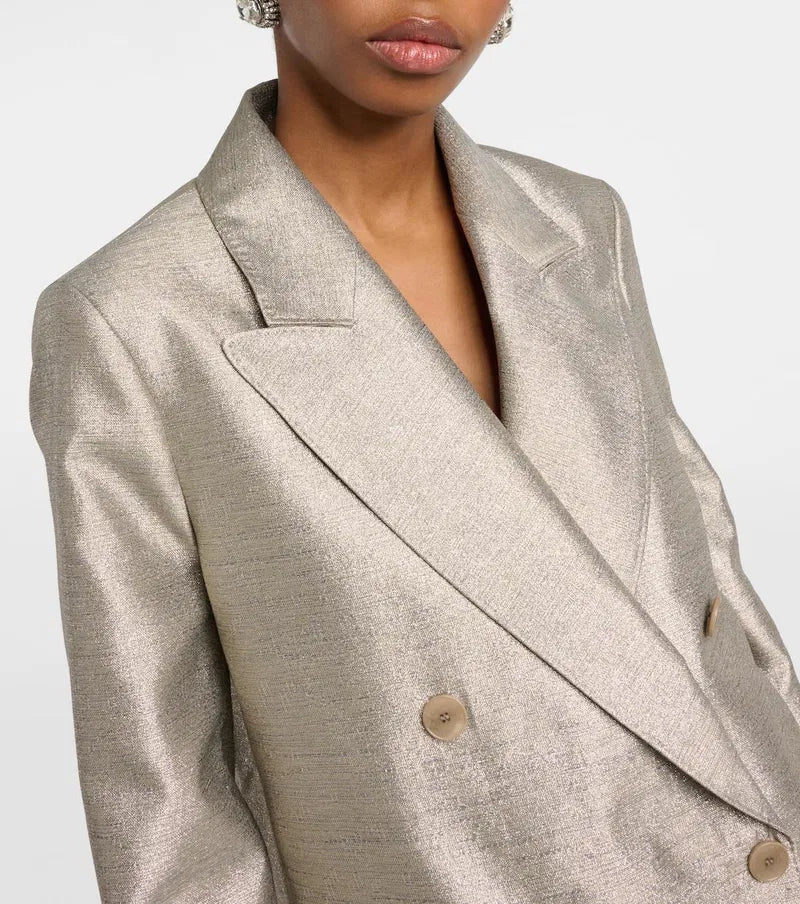 Goud metallic oversized lange blazer met lange mouwen, schoudervulling, double breasted, en klepzakken.