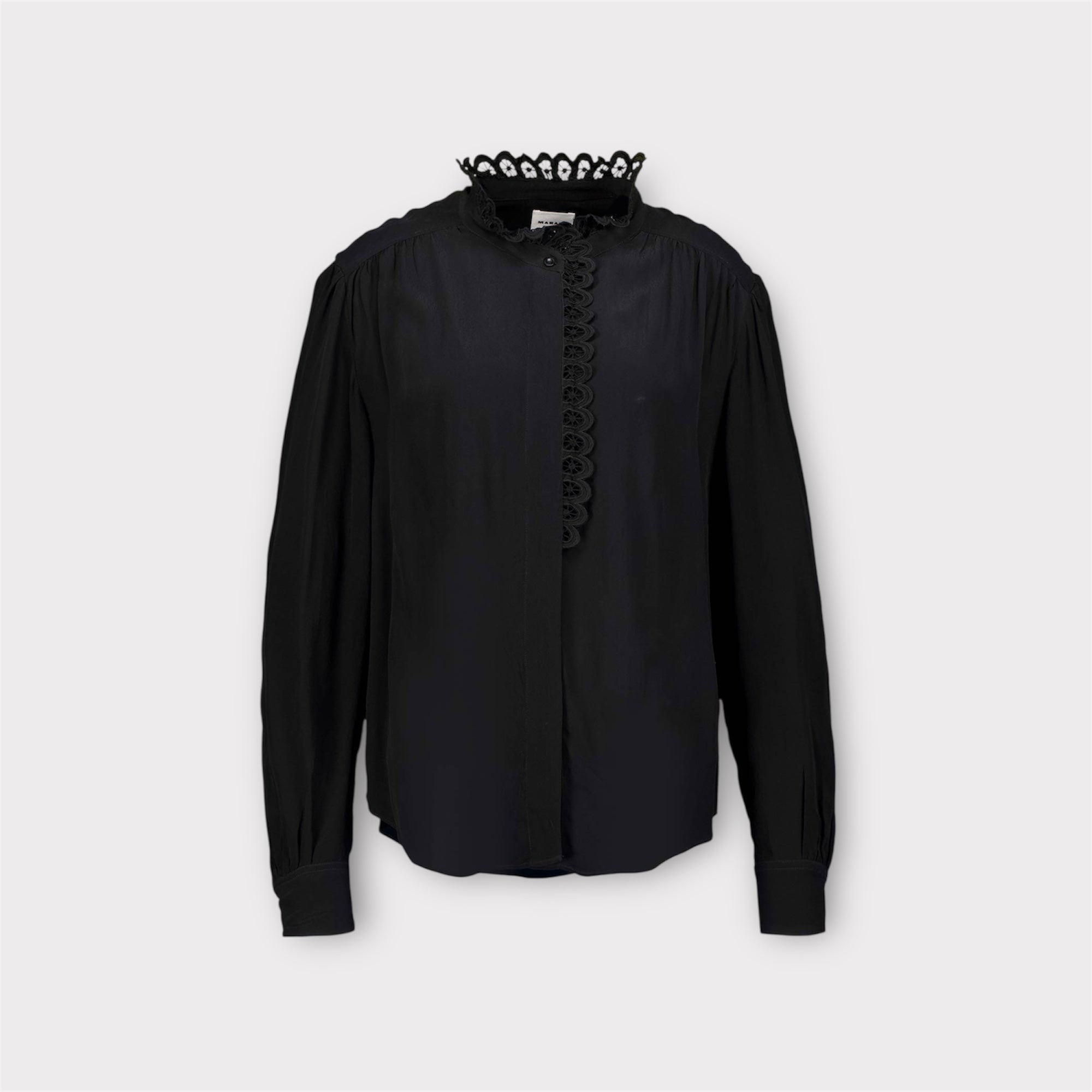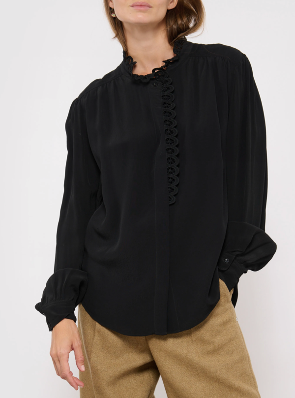 Zwarte top/blouse met lange mouwen, een opstaande boord en knoopsluiting.