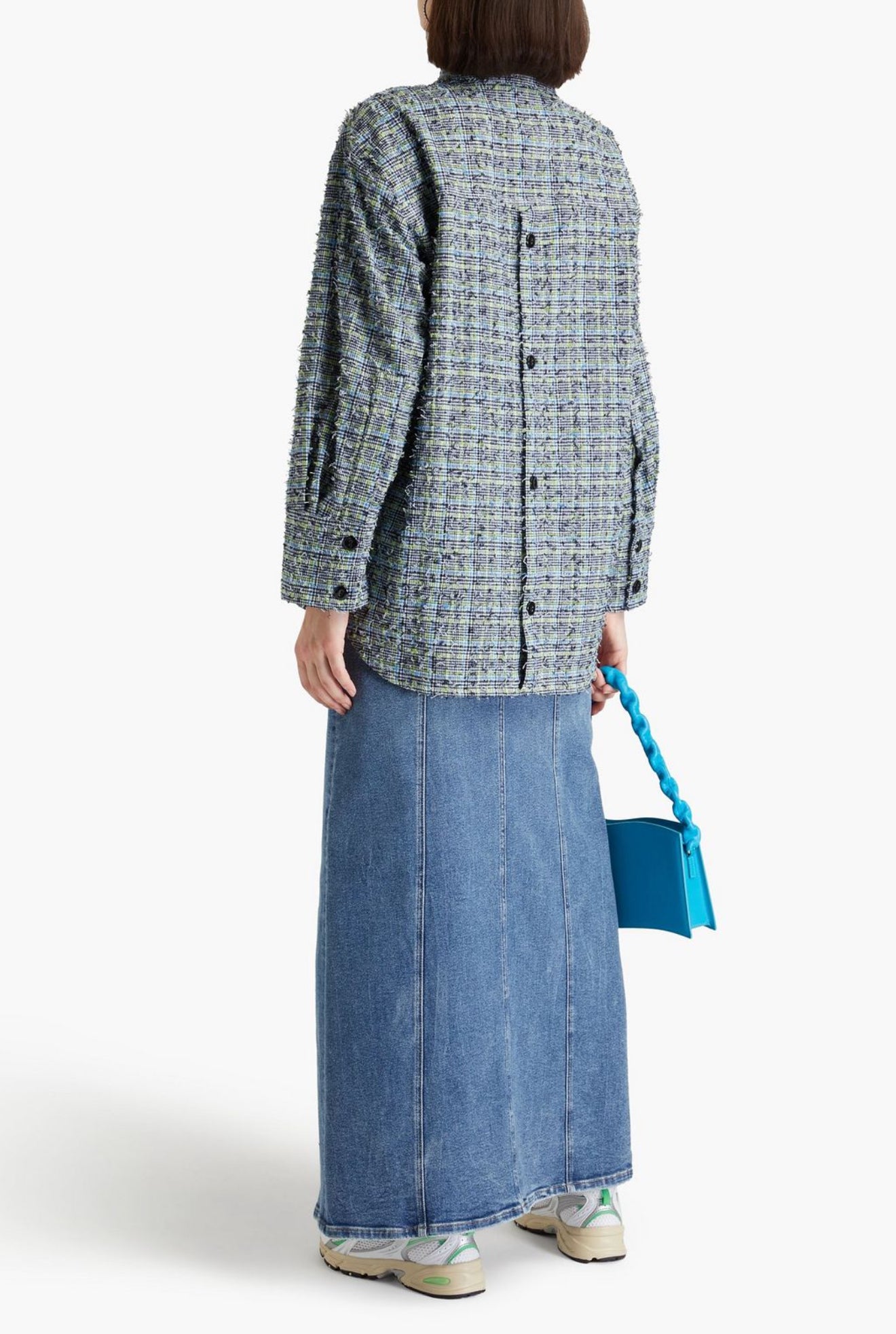 Oversized tweed shirt in een ruitje van lime, groen en zwart met lange mouwen, een kraag, knoopsluiting en knoop detail op de achterkant.