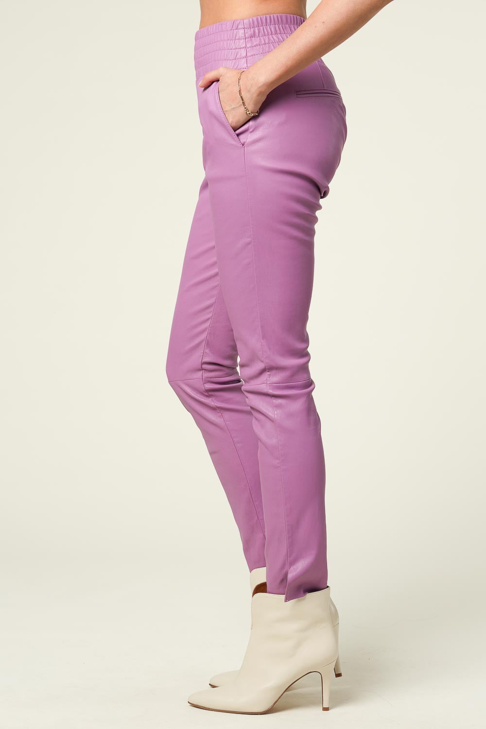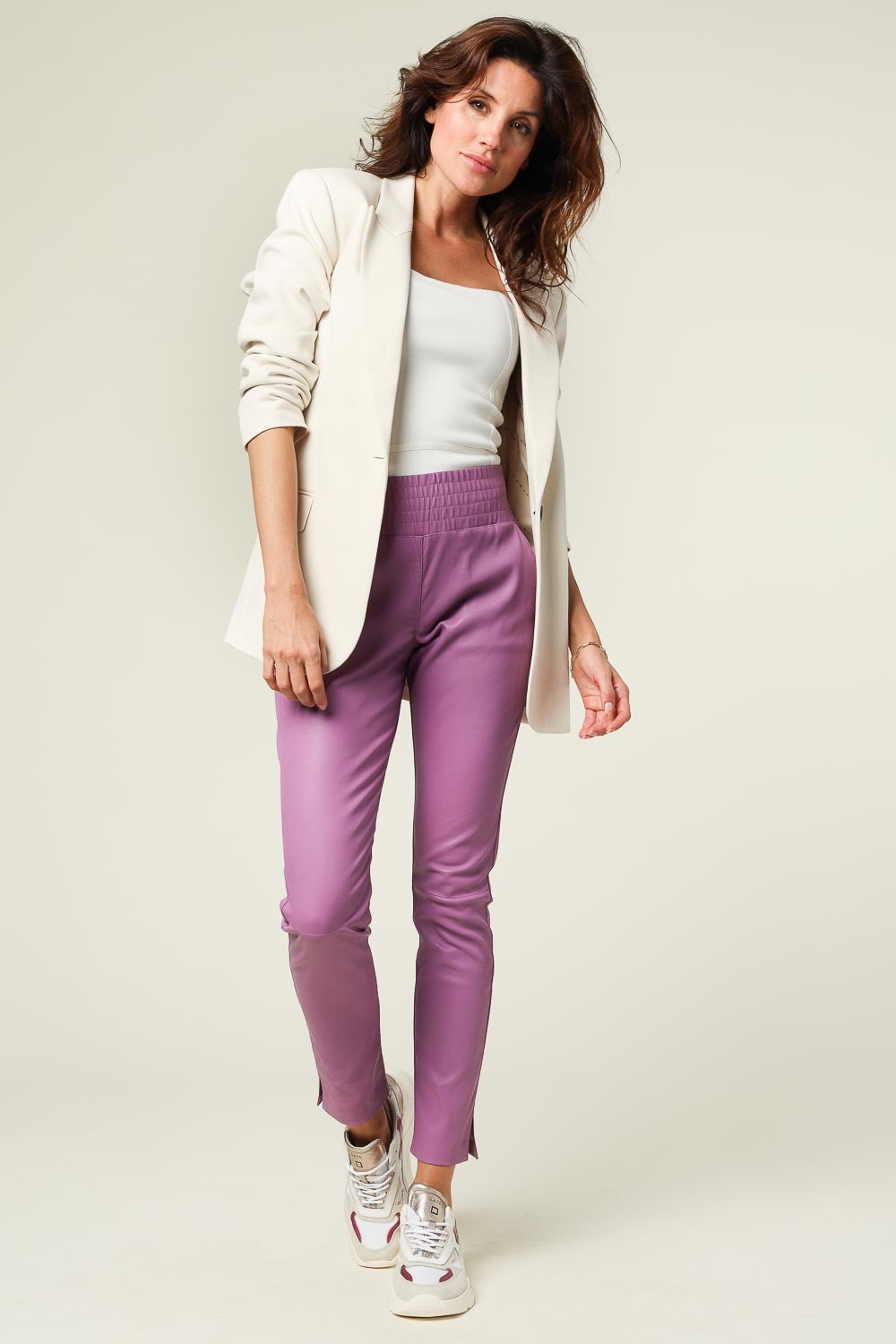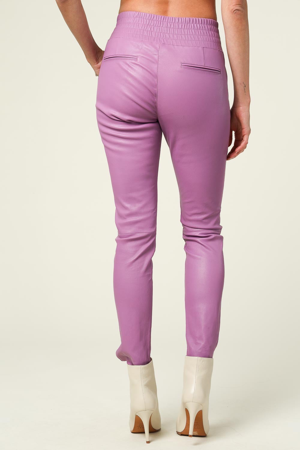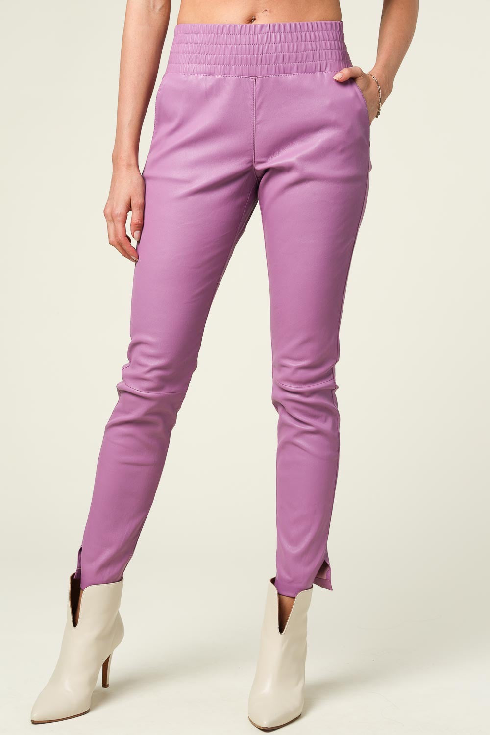 Stretch leren broek in het paars met een elastische tailleband, zijsplits bij de enkels, steekzakken en heeft een aansluitende fit.