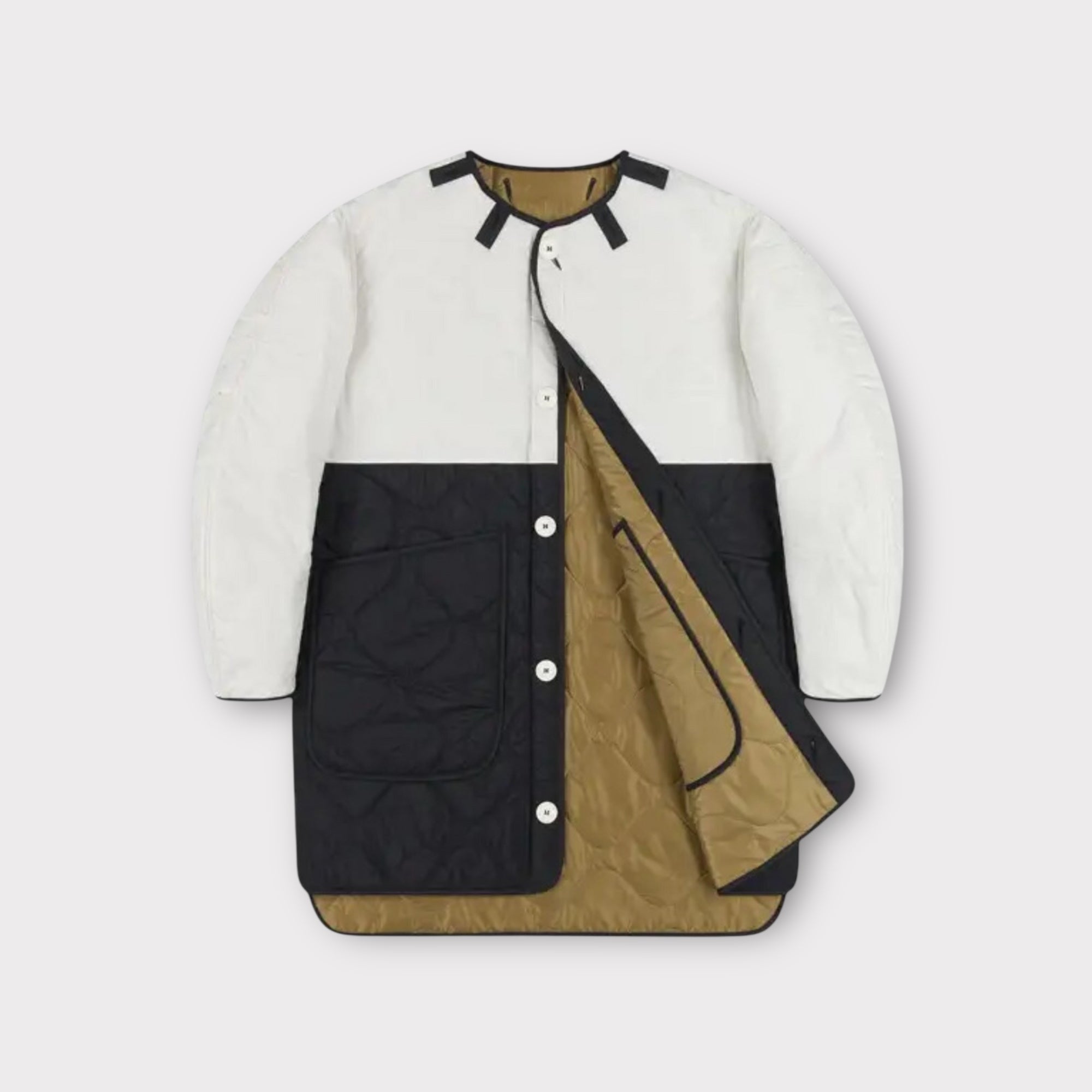 Reversible colourblock quilted jas met lange mouwen, een knoopsluiting, zakken en een kraag welke los gemaakt kan worden.