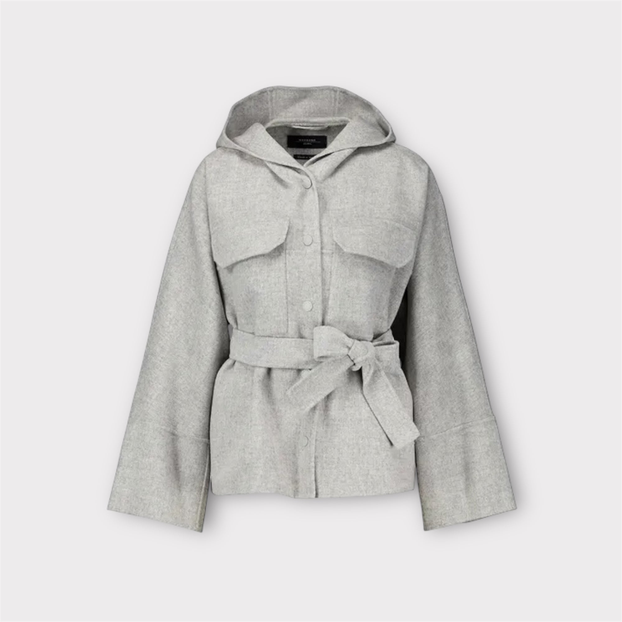 Lichtgrijze korte mantel met capuchon, drukker sluiting, bijpassende ceintuur, steekzakken en lange mouwen.