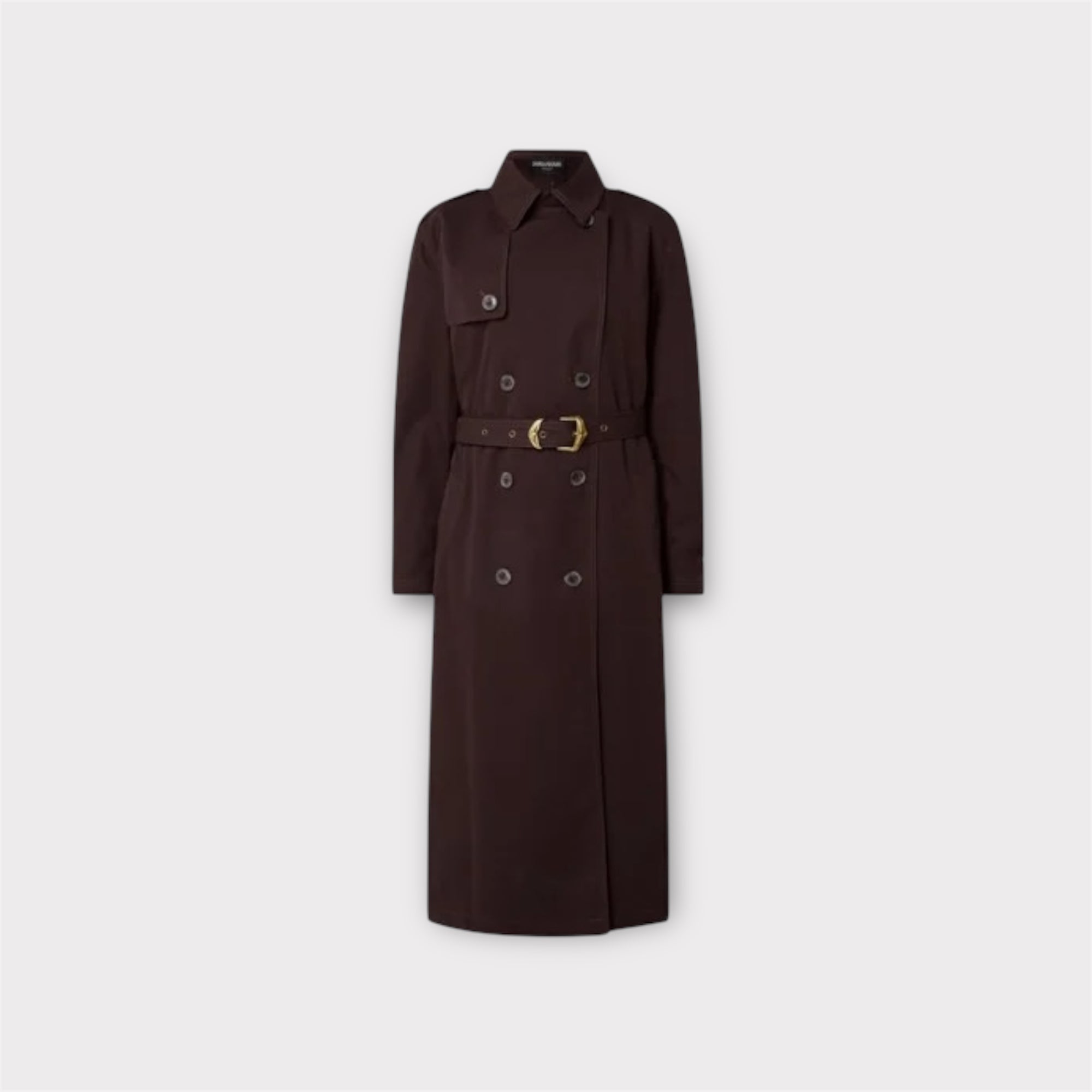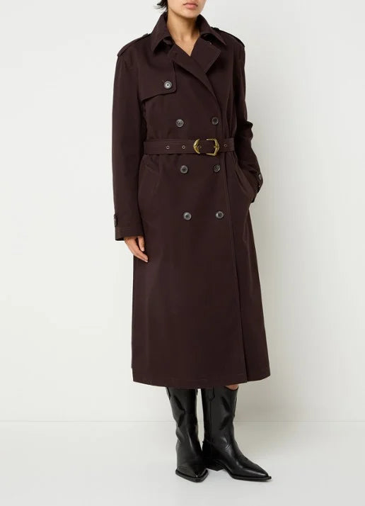 Donkerbruine trenchcoat met steekzakken en een ceintuur.