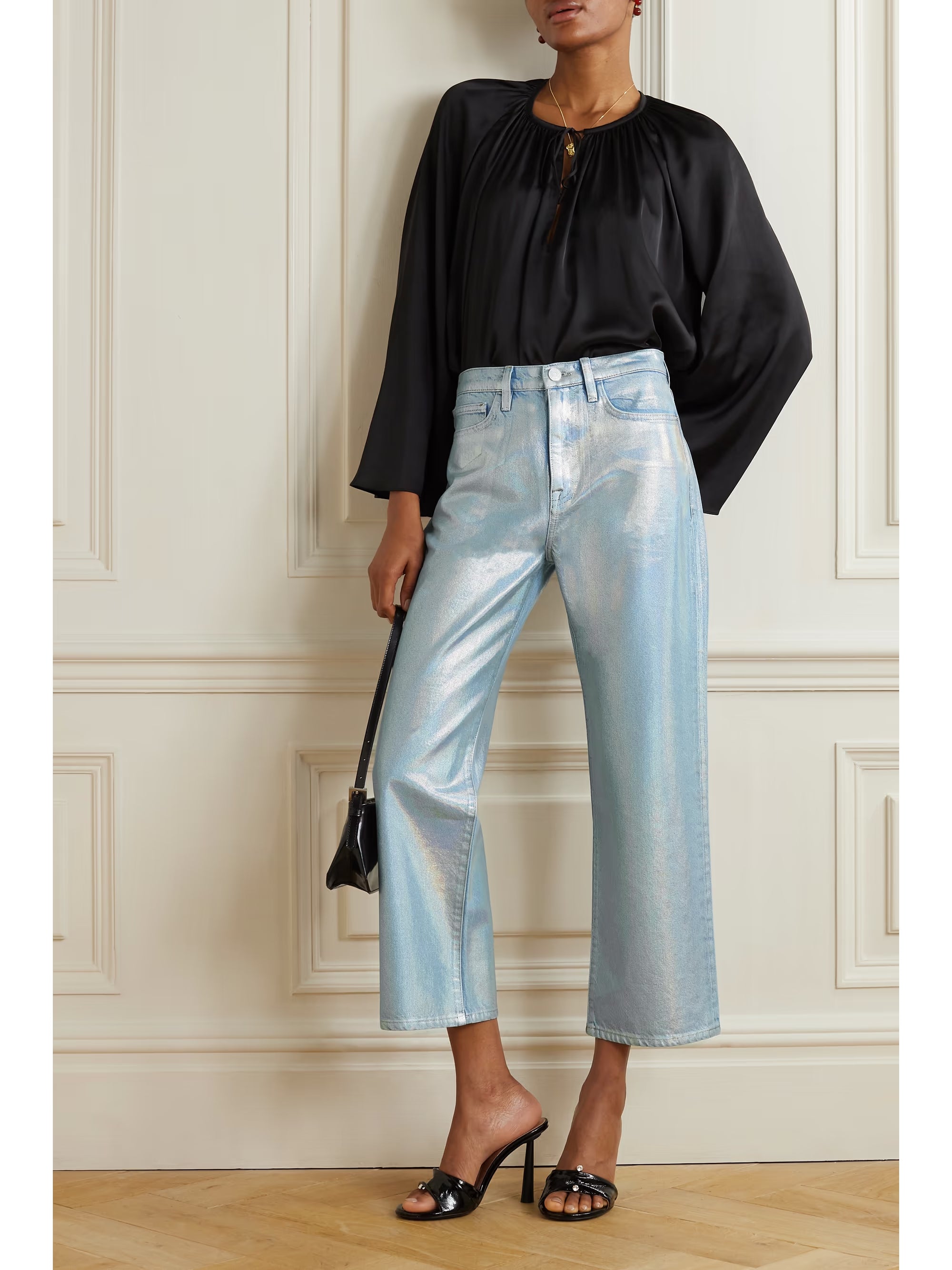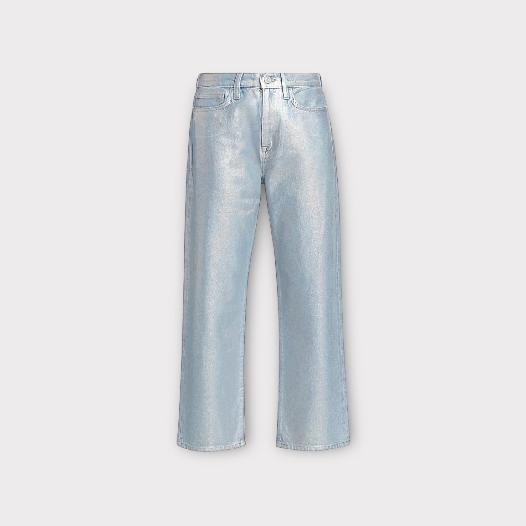 Blauwe jeans met een metallic finish, cropped lengte, riemlussen, 5 pocket en een rits- en knoopsluiting.