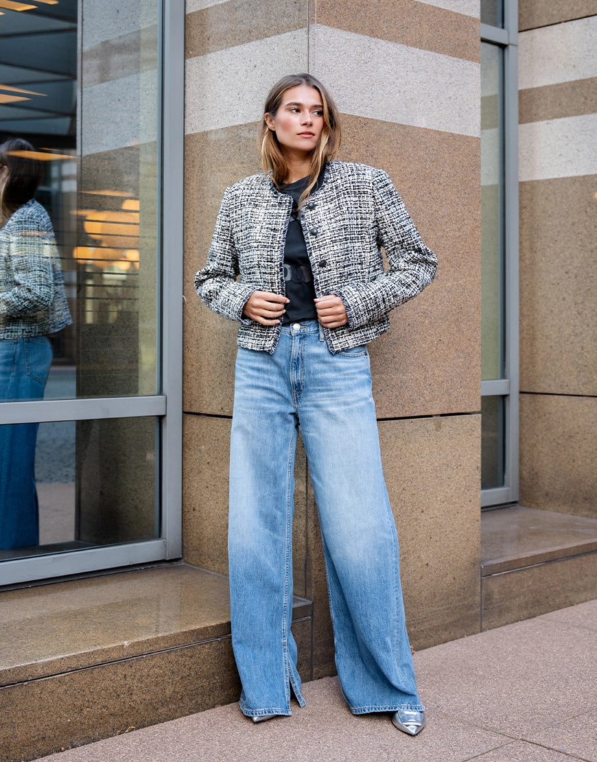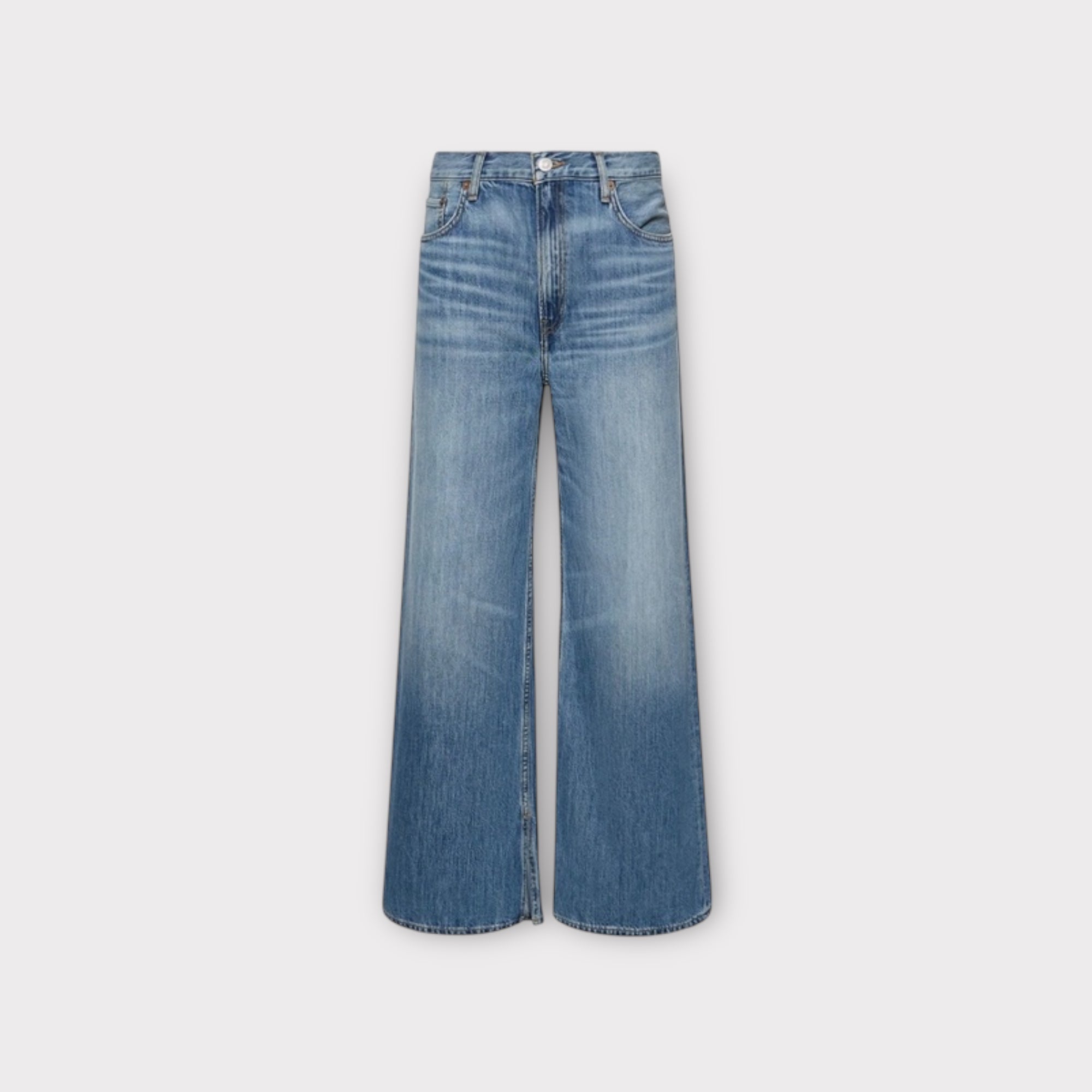 Blauwe jeans met een rits sluiting, splitjes bij de enkels, loose fit en wide leg.