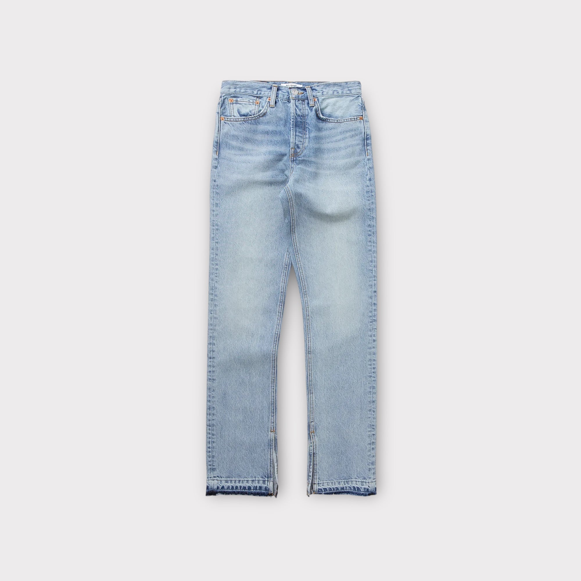 Blauwe high waist skinny boot jeans met splitjes bij de enkels, riemlussen en een knoopsluiting.