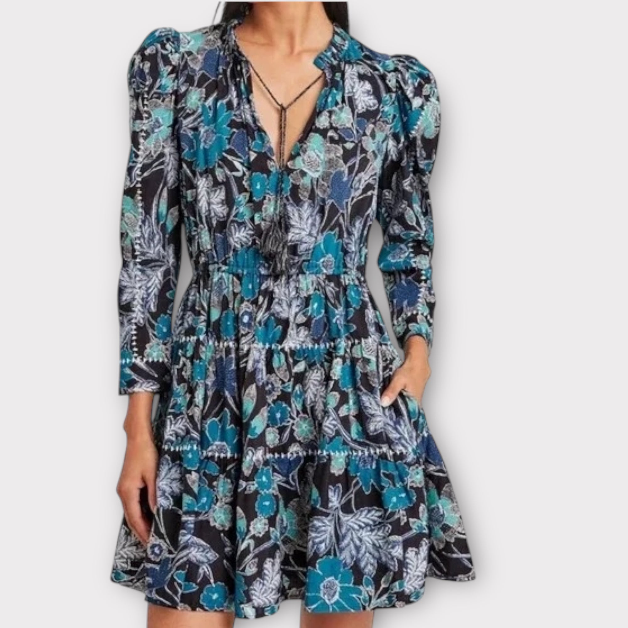 Blauwe print minijurk met lange pofmouwen, een V0hals met koordjes en elastiek in de taille.