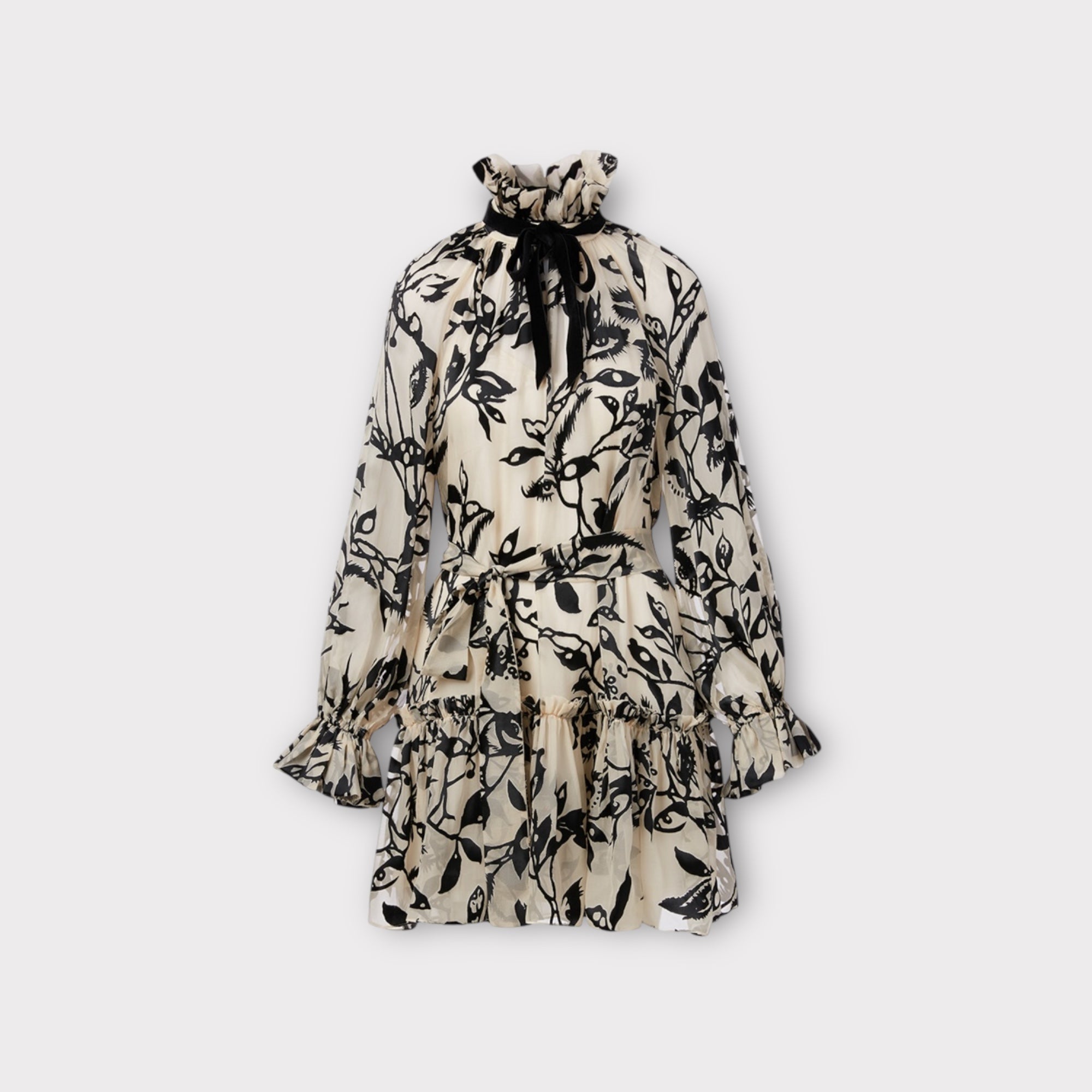Minijurk met ruffles bij de kraag, lange mouwen met elastische manchetten, lint bij de nek en bijhorende ceintuur. De jurk heeft een losse onderjurk.