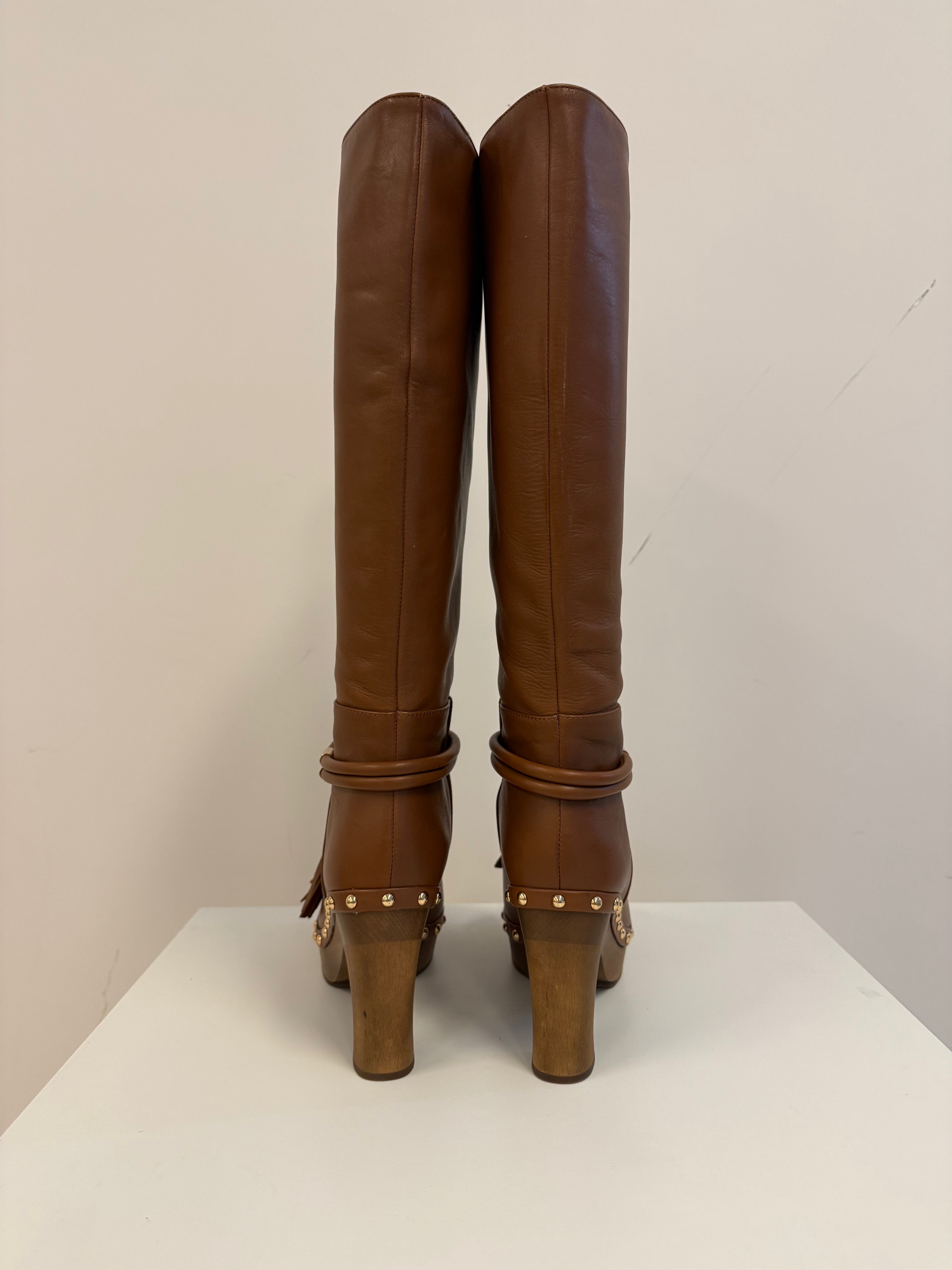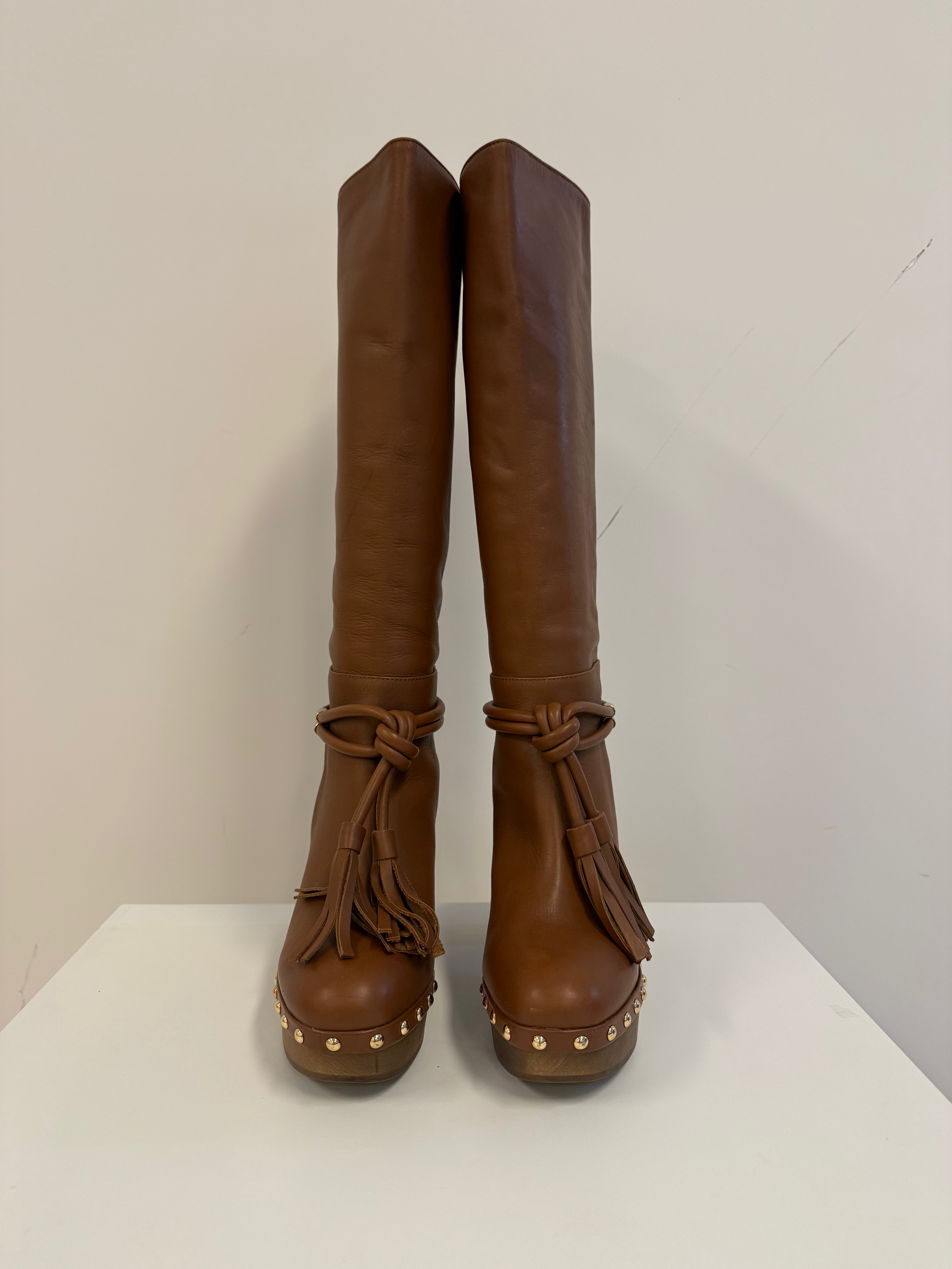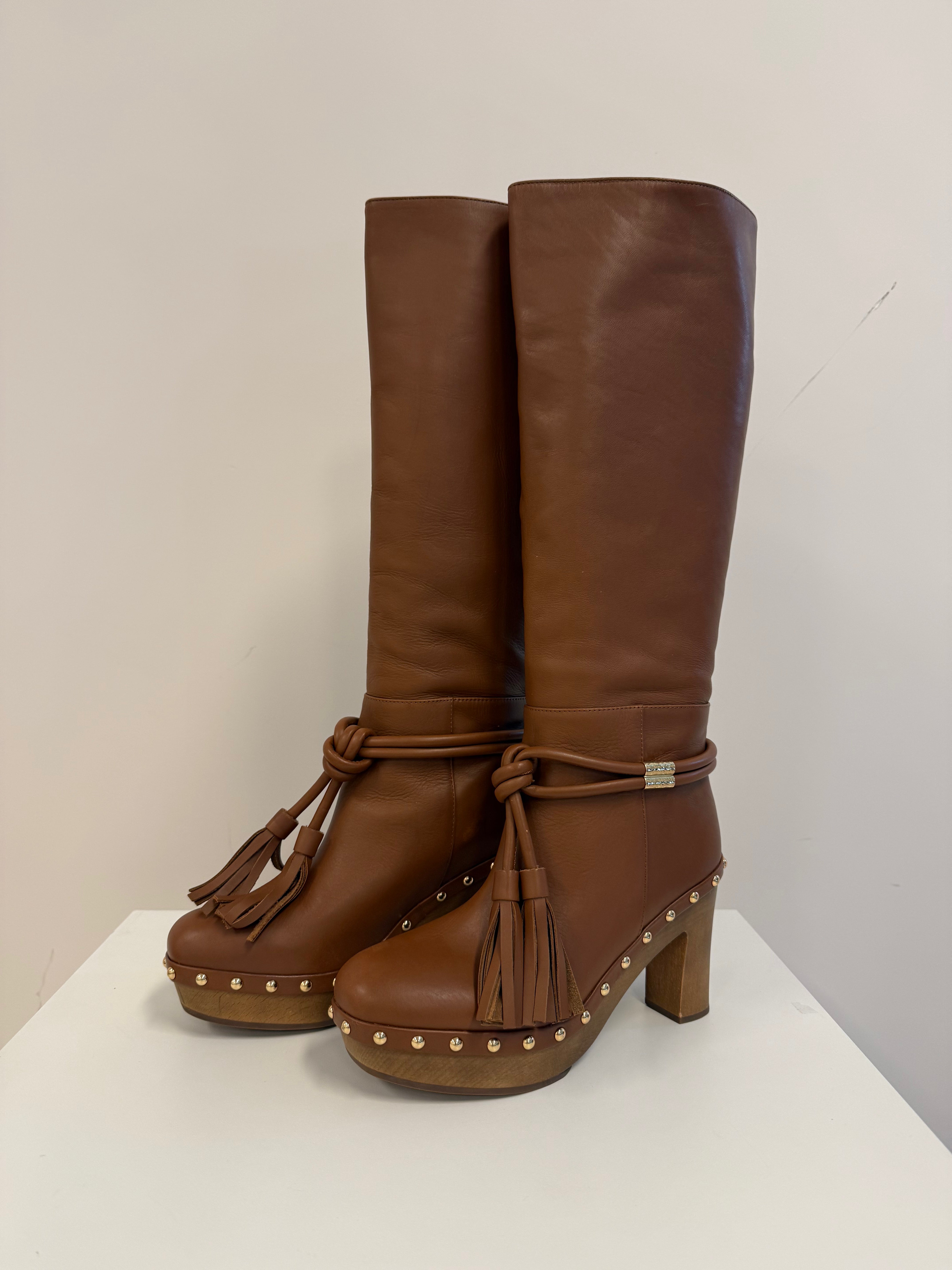 Cognac kleur hoge laars met goudkleur details en houden zool en hak.