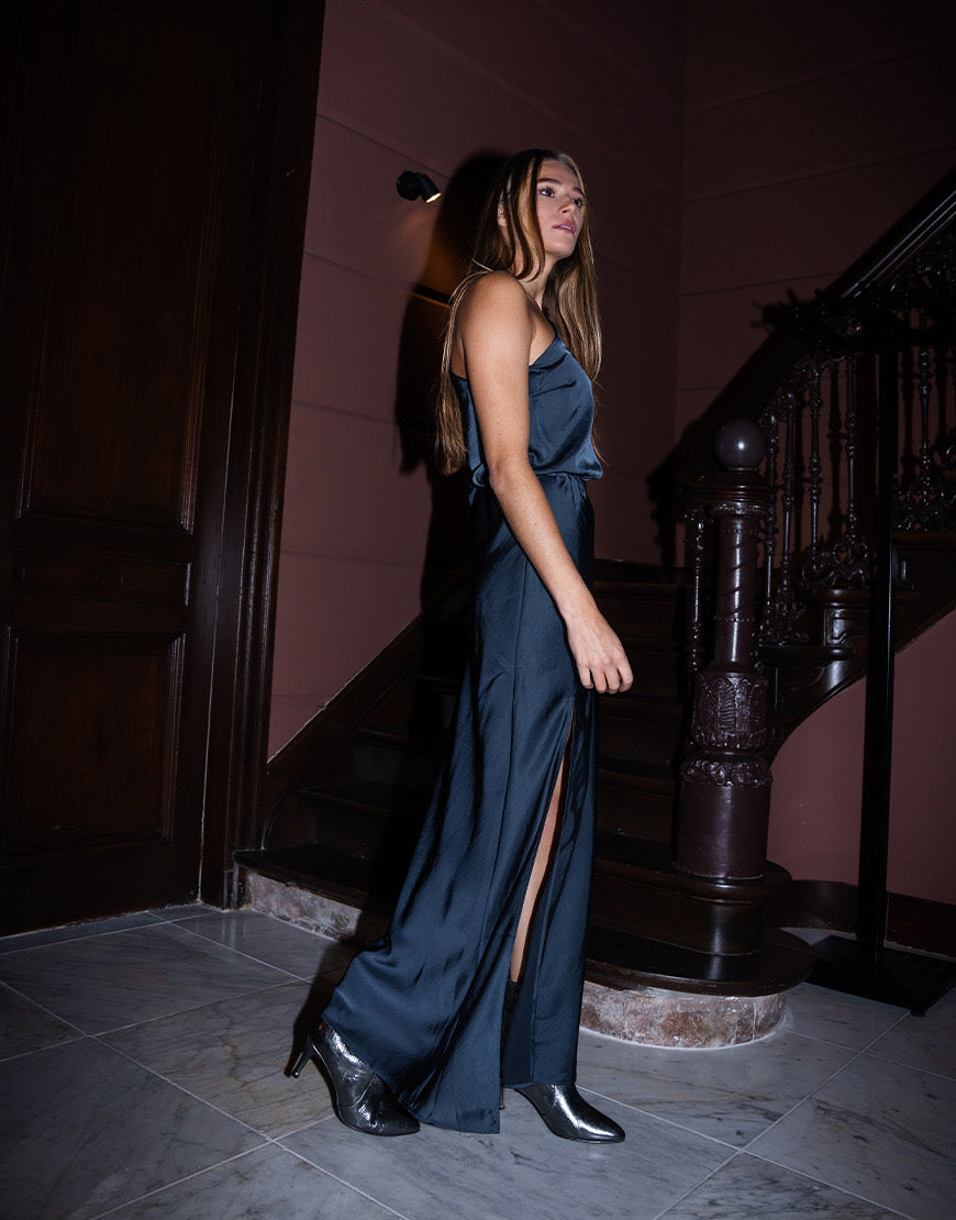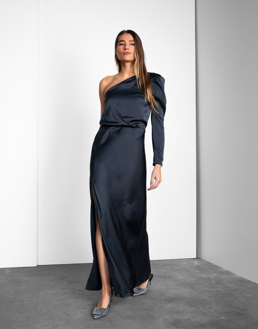 Donkerblauwe one-shoulder jurk met een split en elastiek in de taille.
