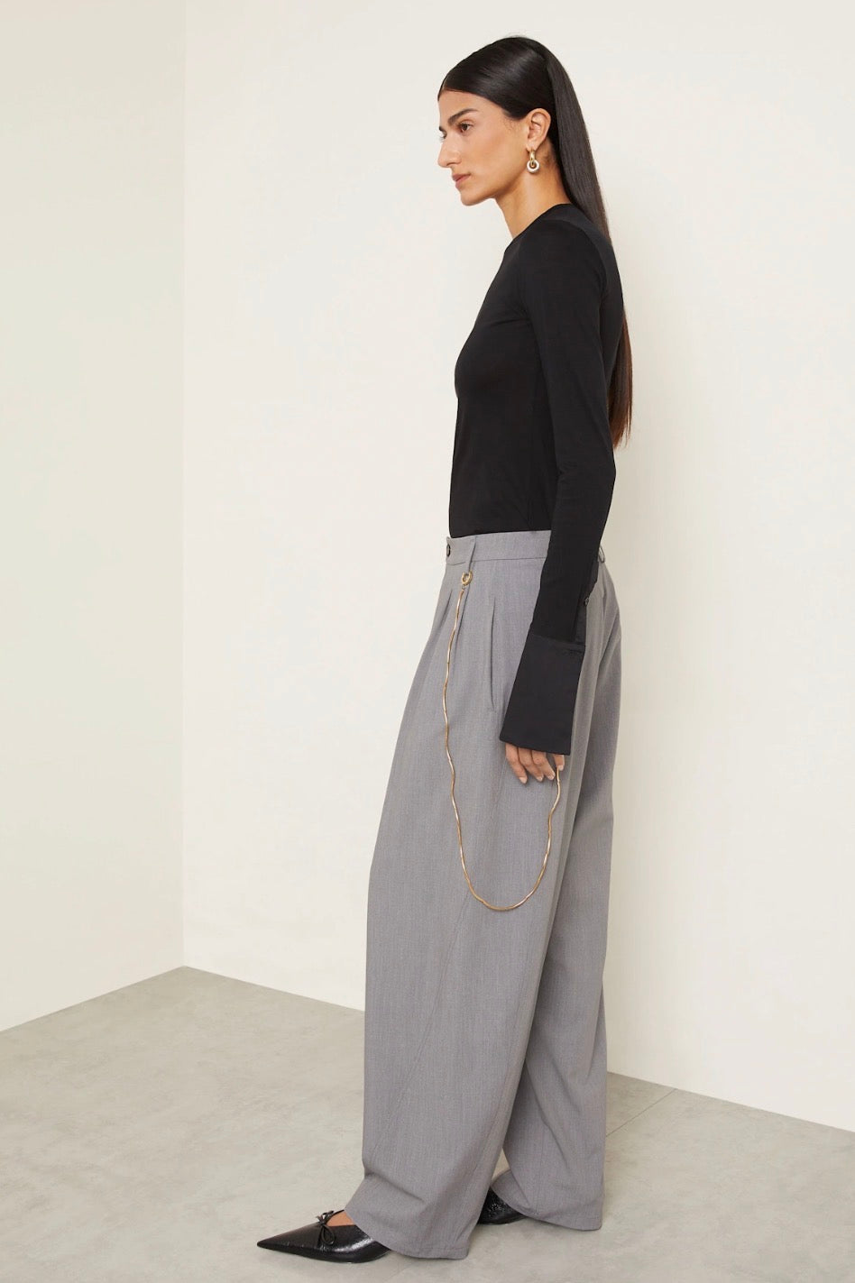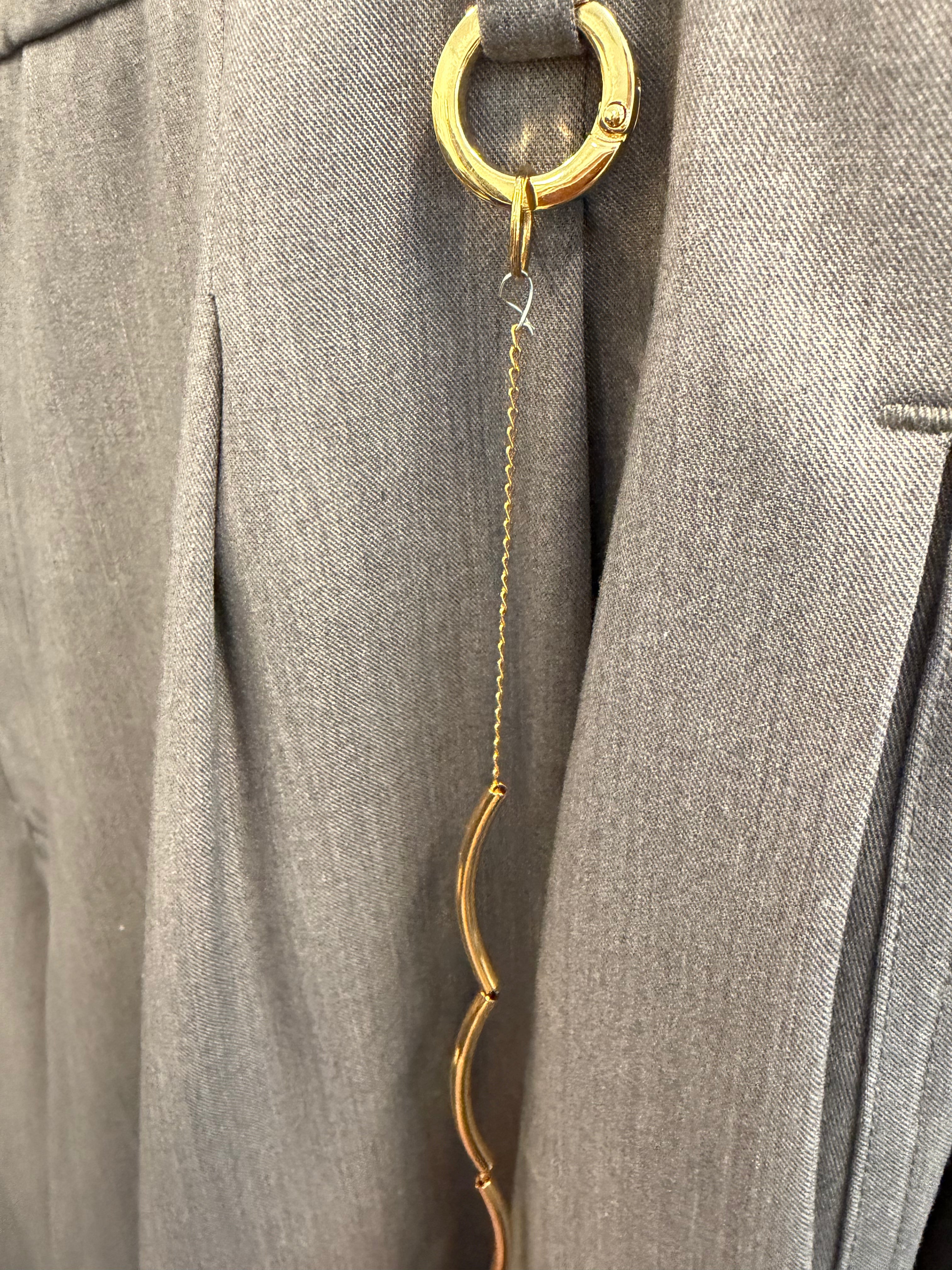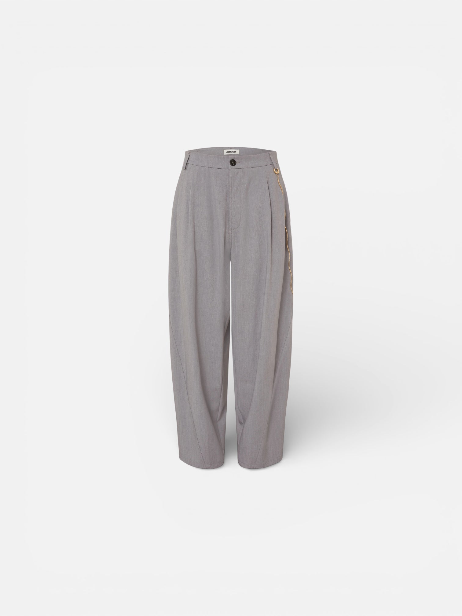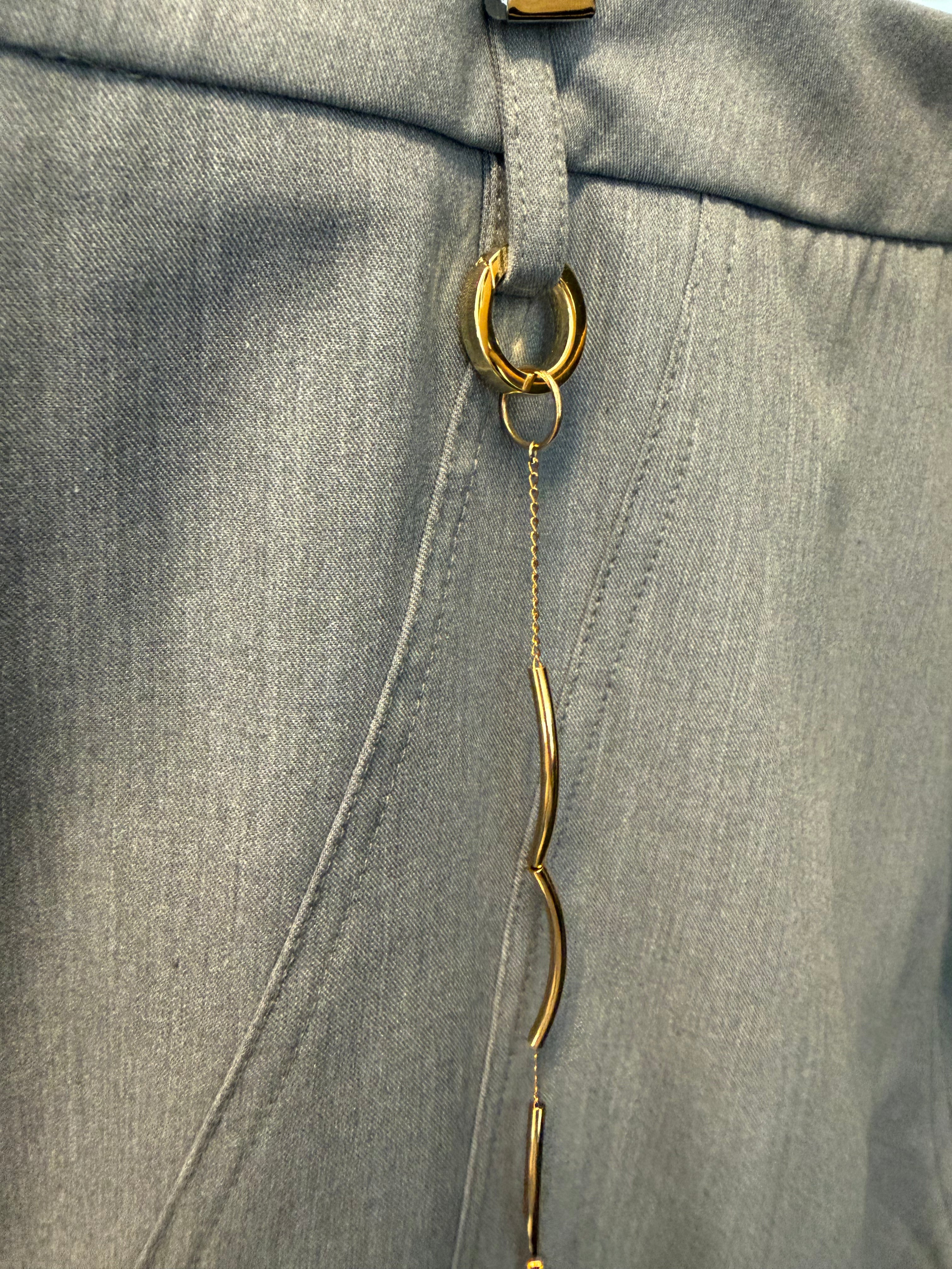 Lichtgrijze taps toelopende broek met een gouden ketting aan de zijkant. Deze ketting is eenvoudig los te maken van de broek.