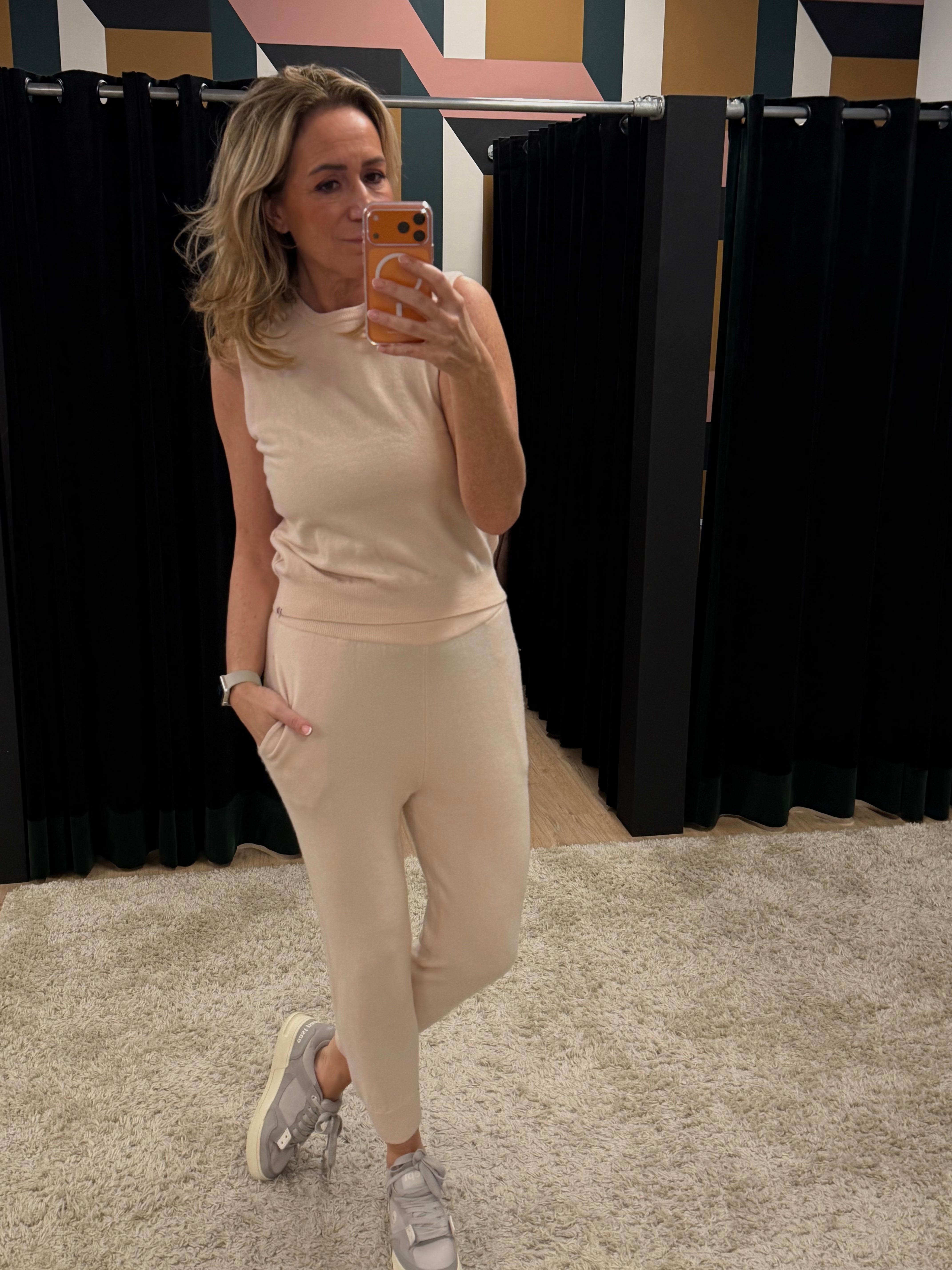Cashmere set in het poederroze van een mouwloze top met ronde hals en een broek met elastische taille, steekzakken en een relaxte boyfriend fit.