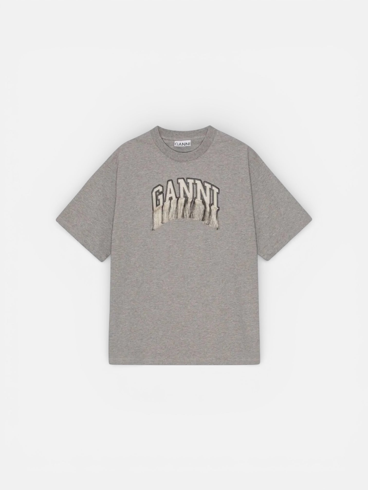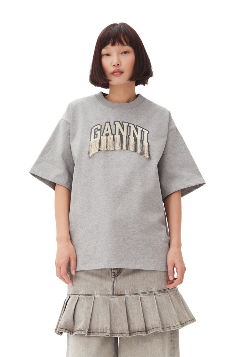 Grijs T-shirt met een korte mouw, stevige kwaliteit katoen, ronde hals en geborduurd logo detail op de voorzijde met franje.