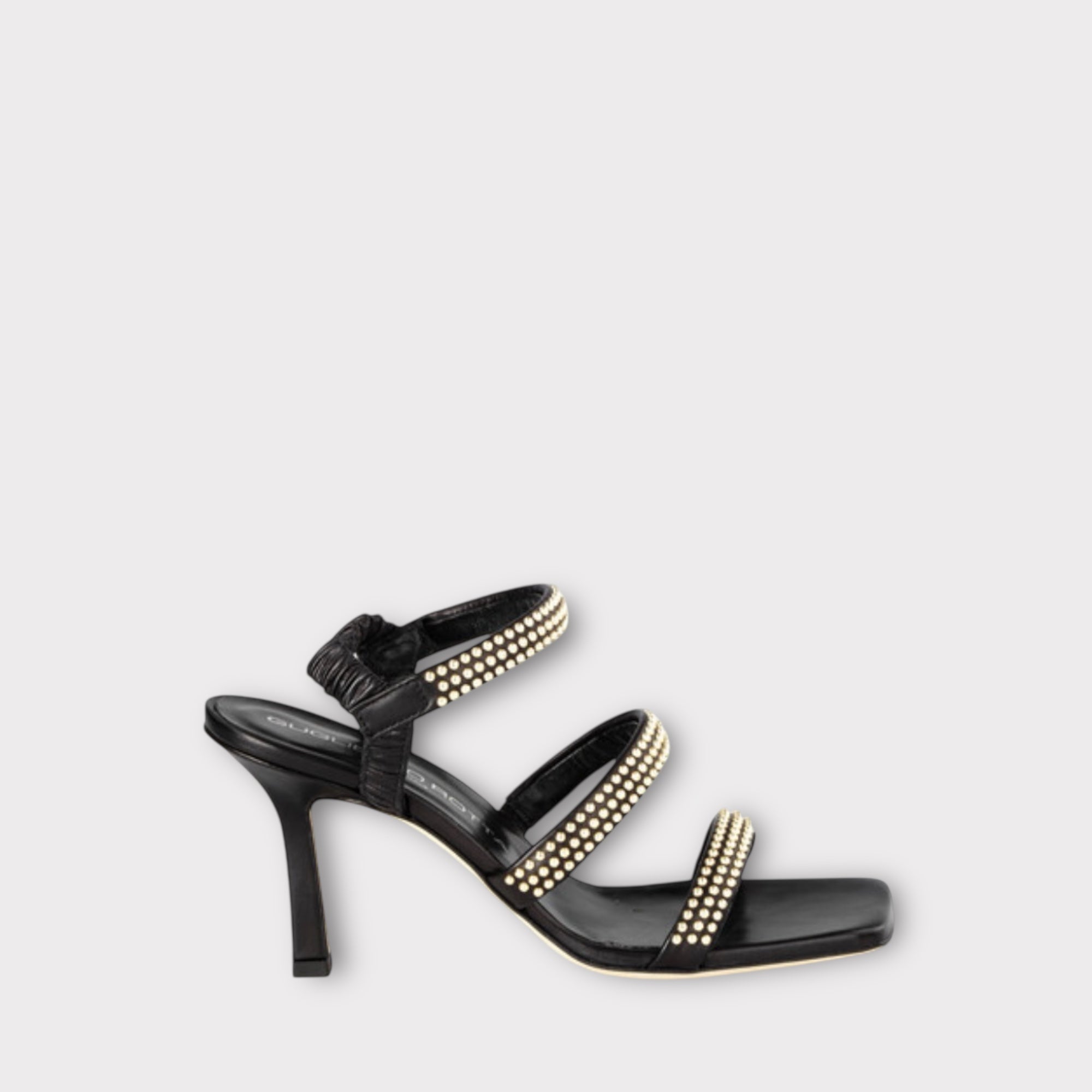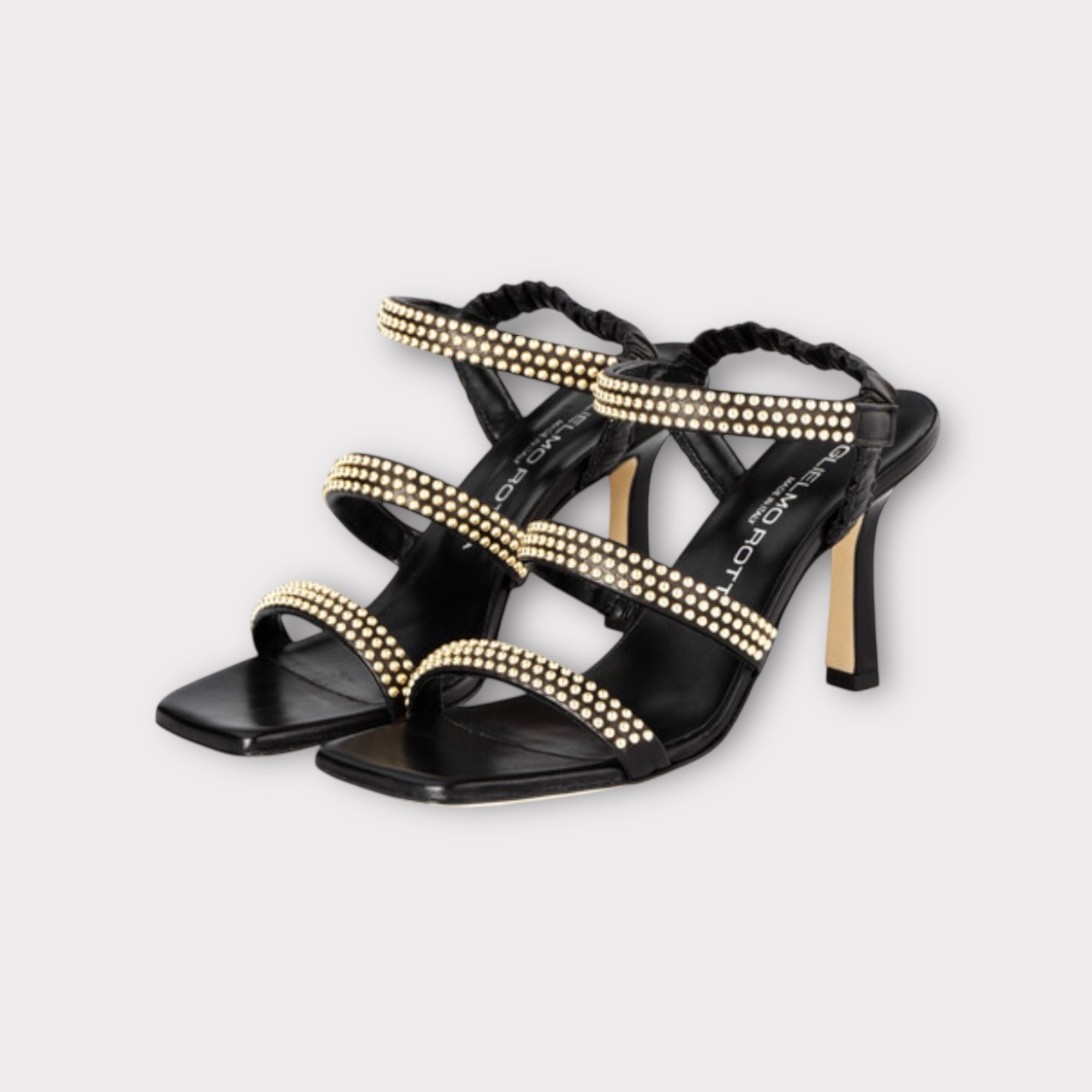 Zwarte sandaal met goudkleur studs en een bandje rond de enkel met elastiek aan de achterkant.