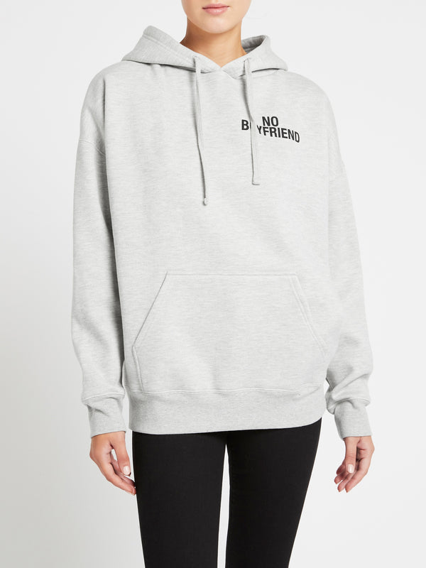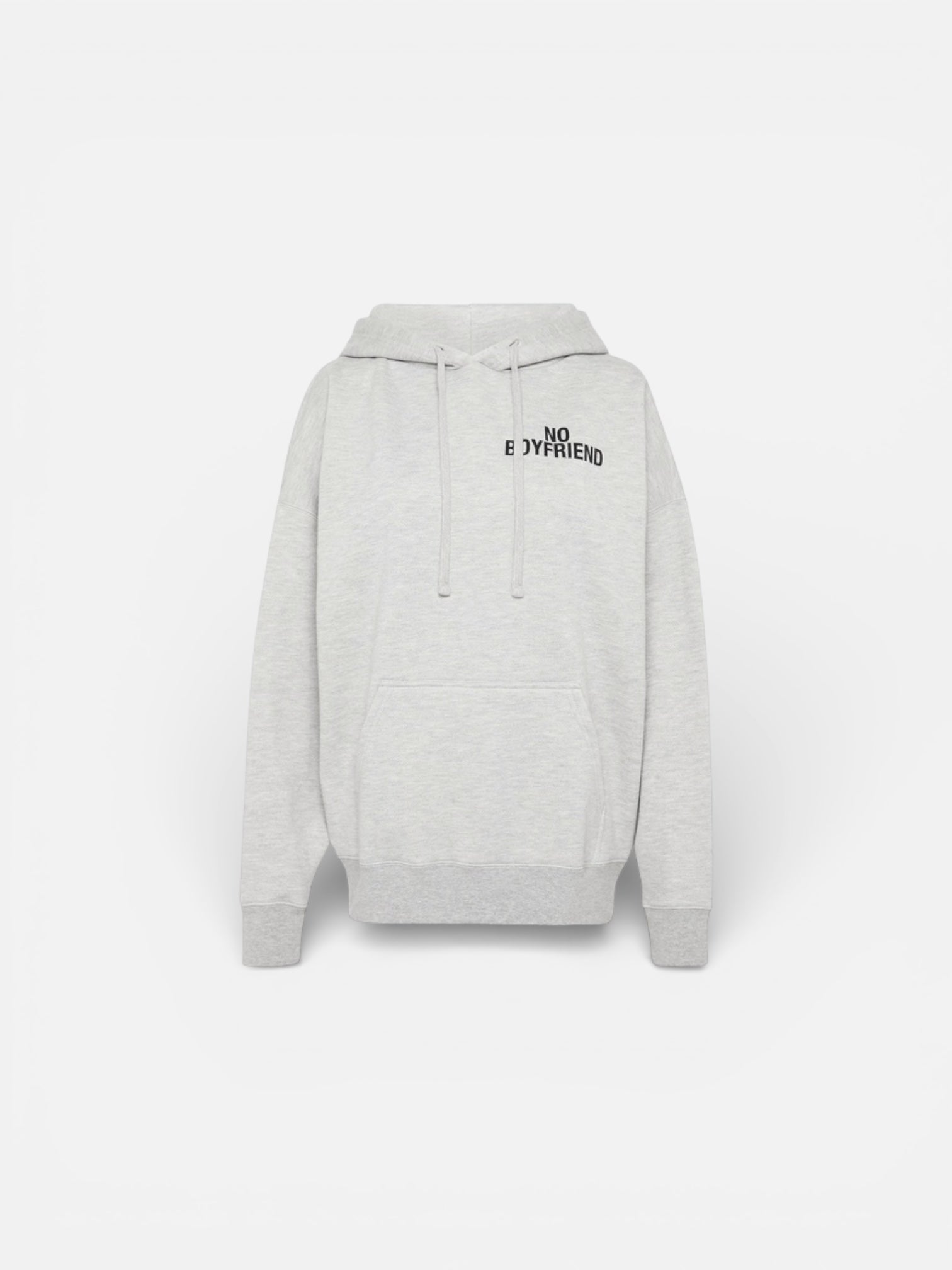 Oversized lichtgrijze hoodie met lange mouwen, zakken en tekst opdruk.