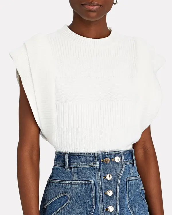 Zwarte top/trui met een kort mouwtje, ronde hals en is taps toelopend.