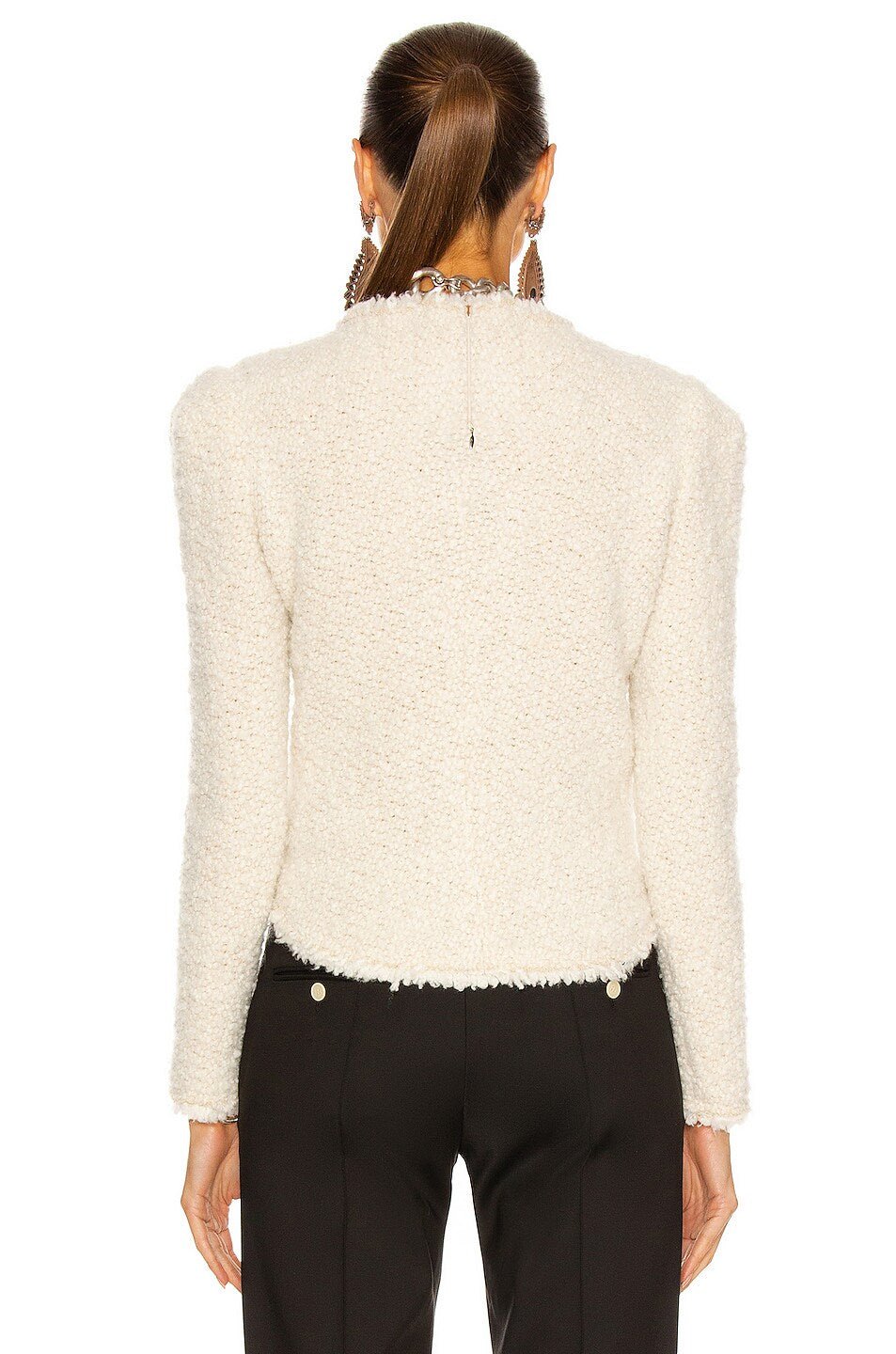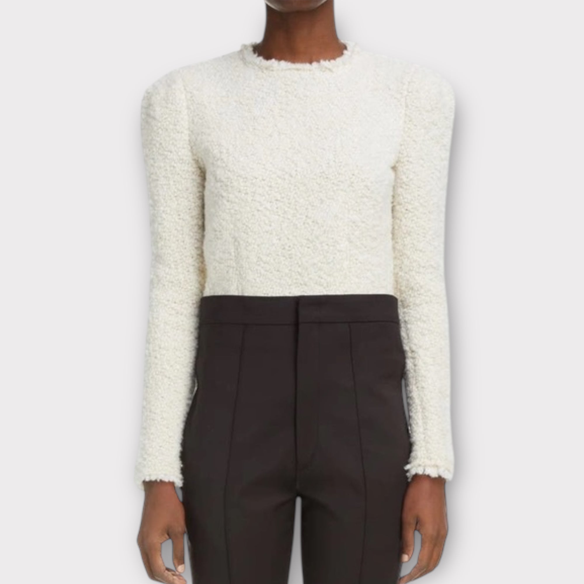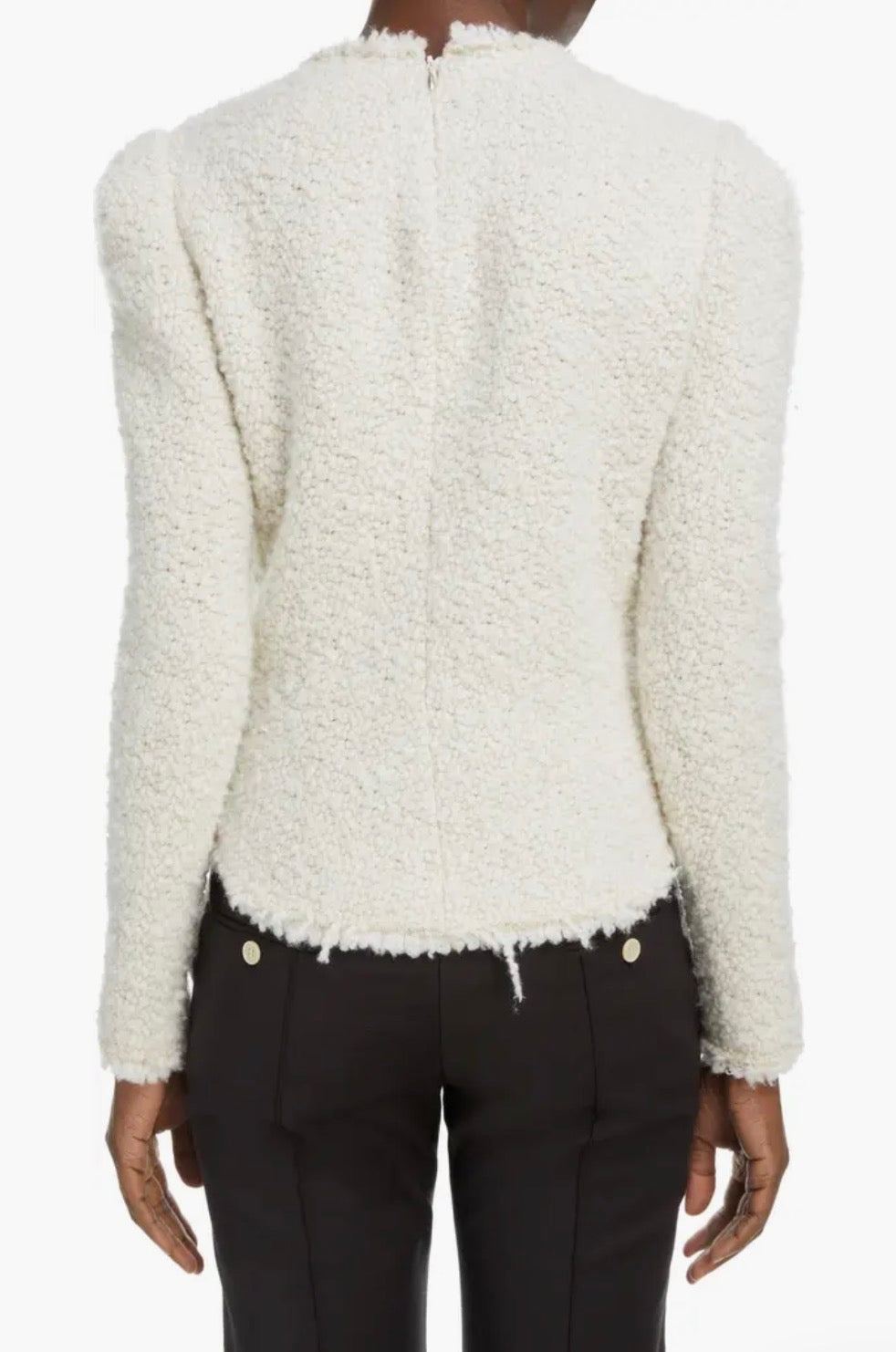 Crème kleur boucle top met lange pofmouwen, een ronde hals, rits aan de achterkant en zijkant en een aangesloten fit.