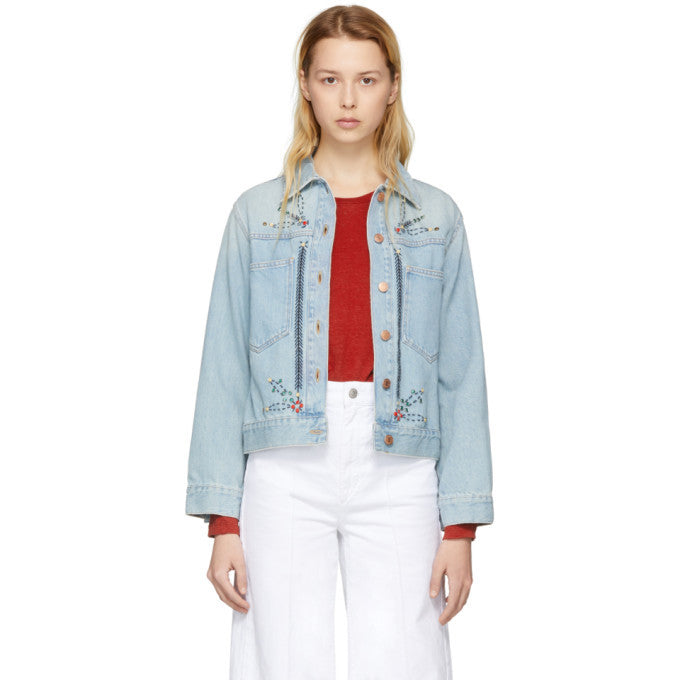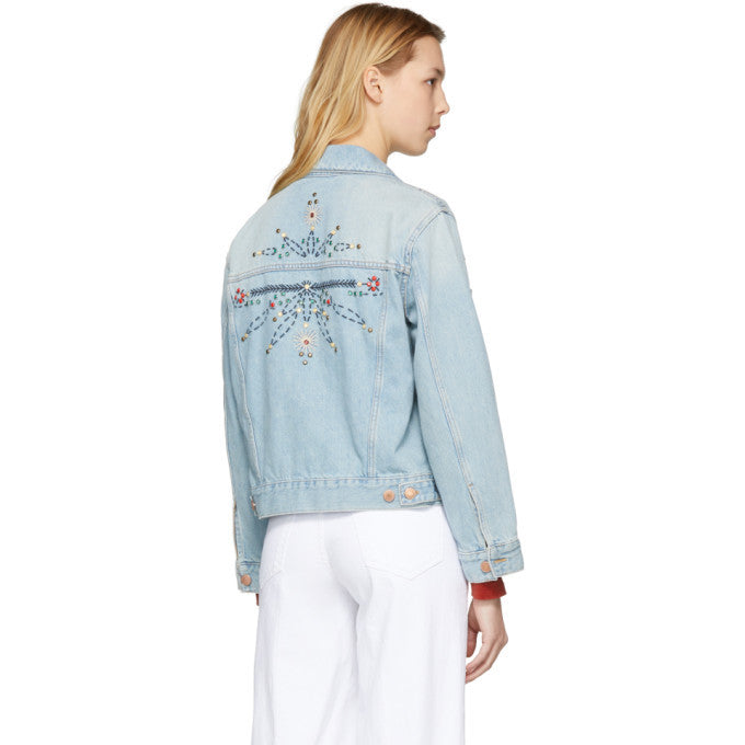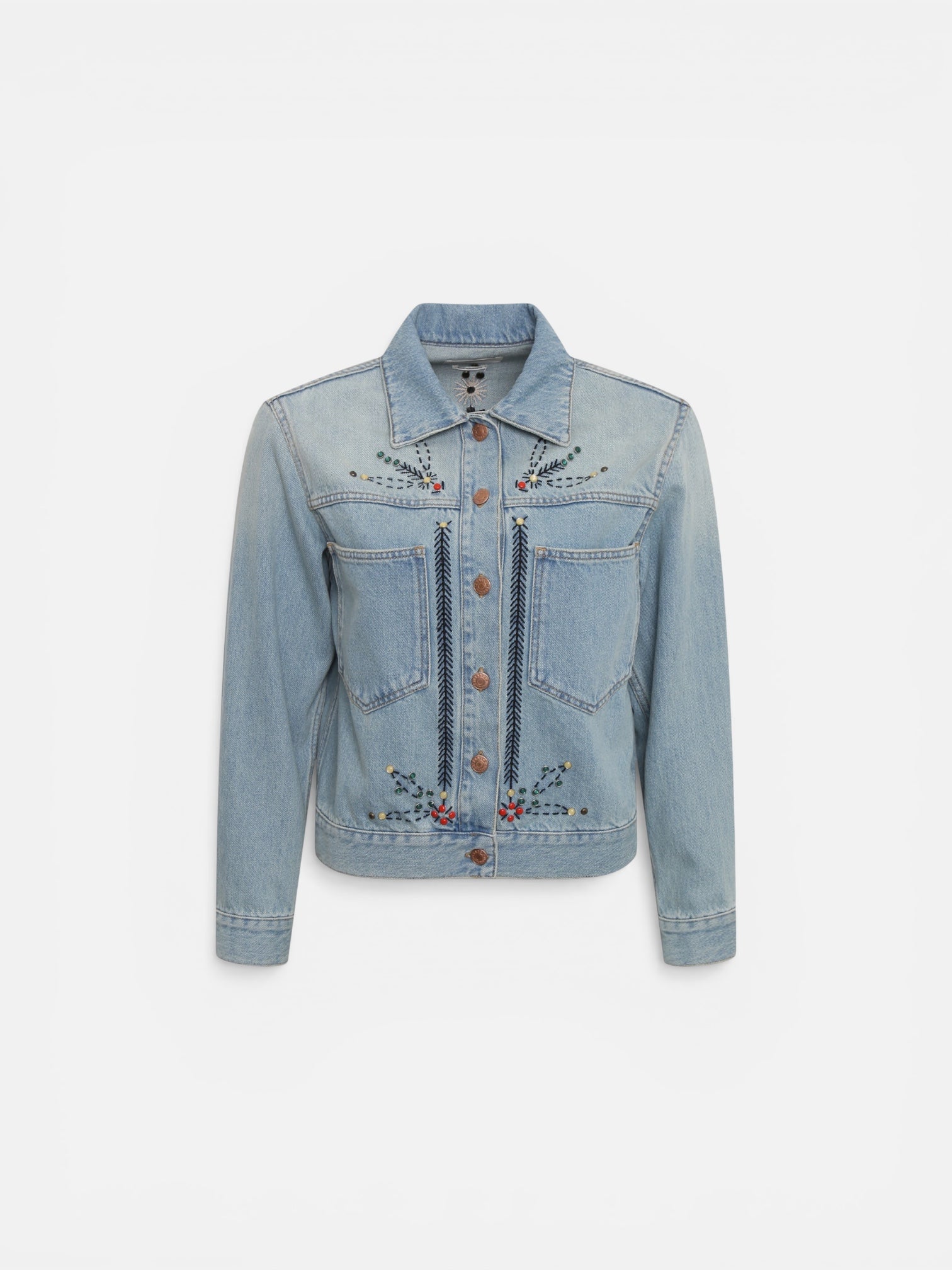 Lichtblauw denim jack met borduursels en studs. Lange mouwen, een knoopsluiting, kraag en borstzakken.
