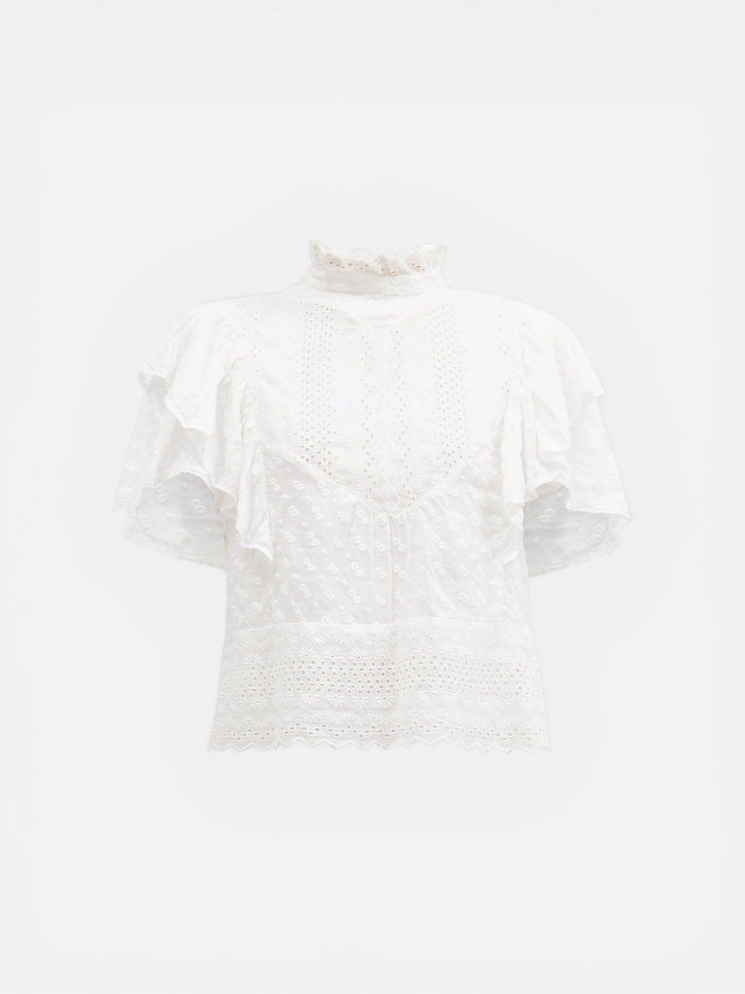 Broderie top met korte wijde mouwtjes, hooggesloten, loose fit en is licht transparant.