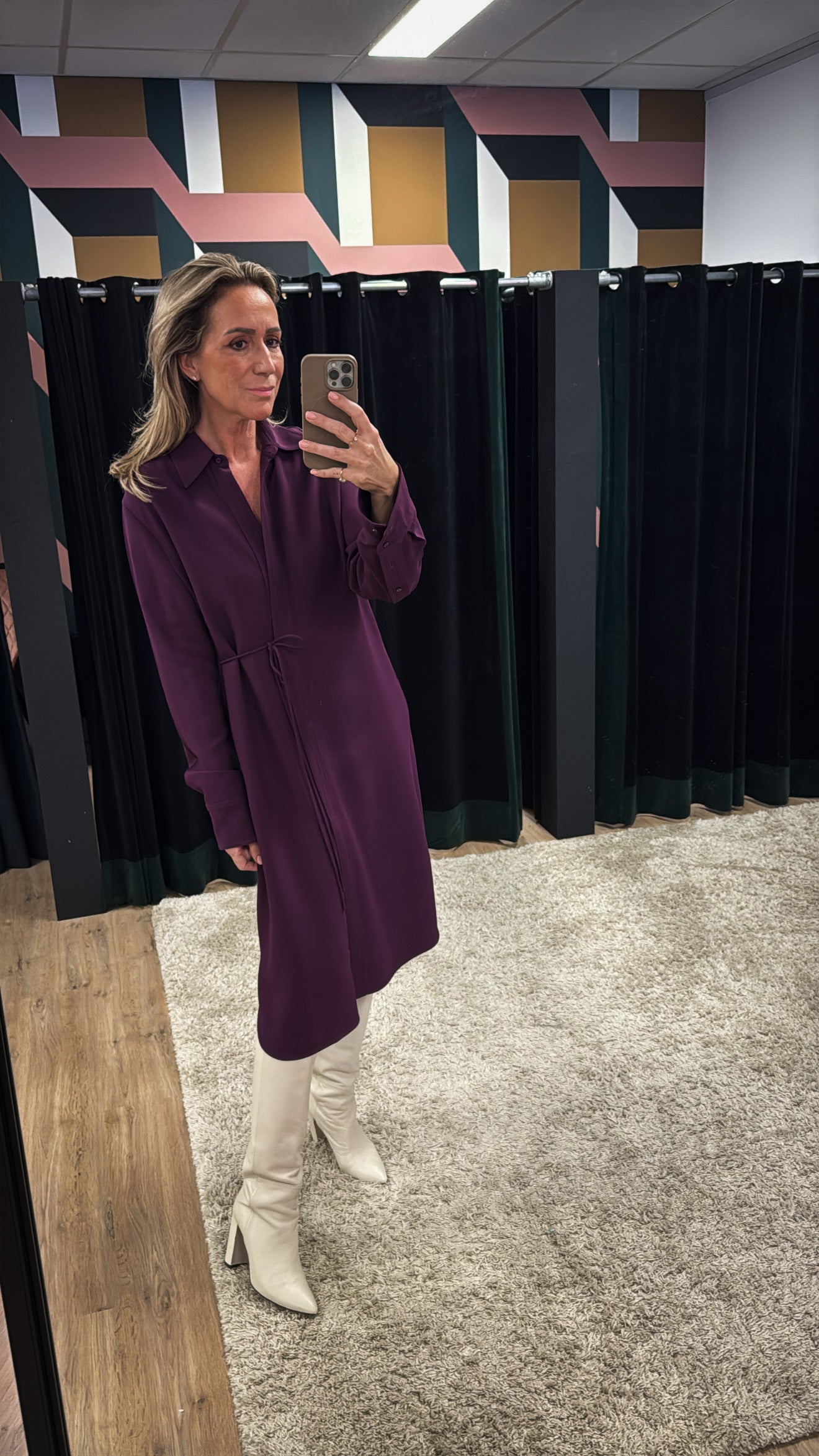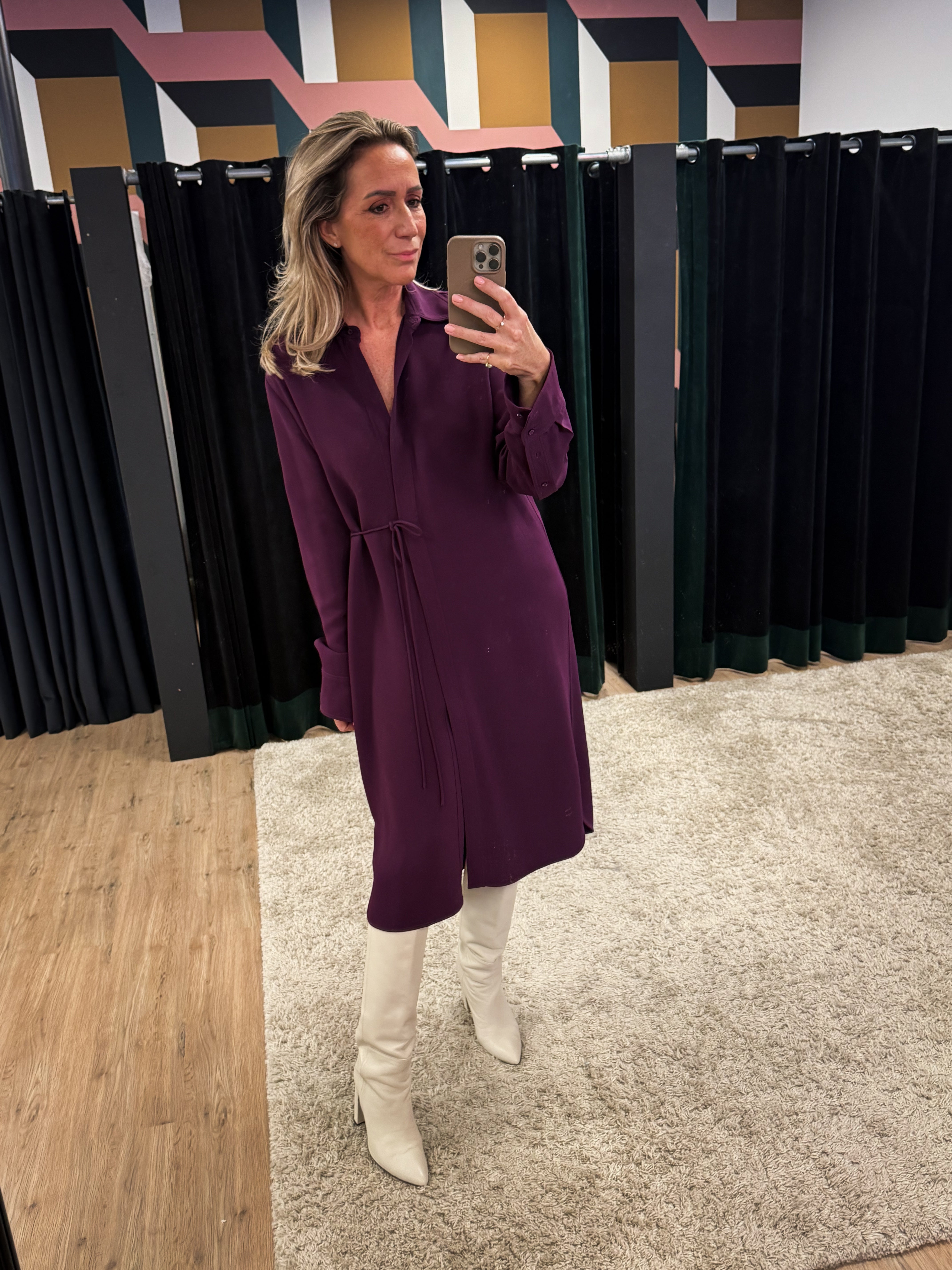 Donkerpaarse/bordeaux jurk met lange mouwen, een verborgen knoopsluiting, een kraag en een schuine sluiting.