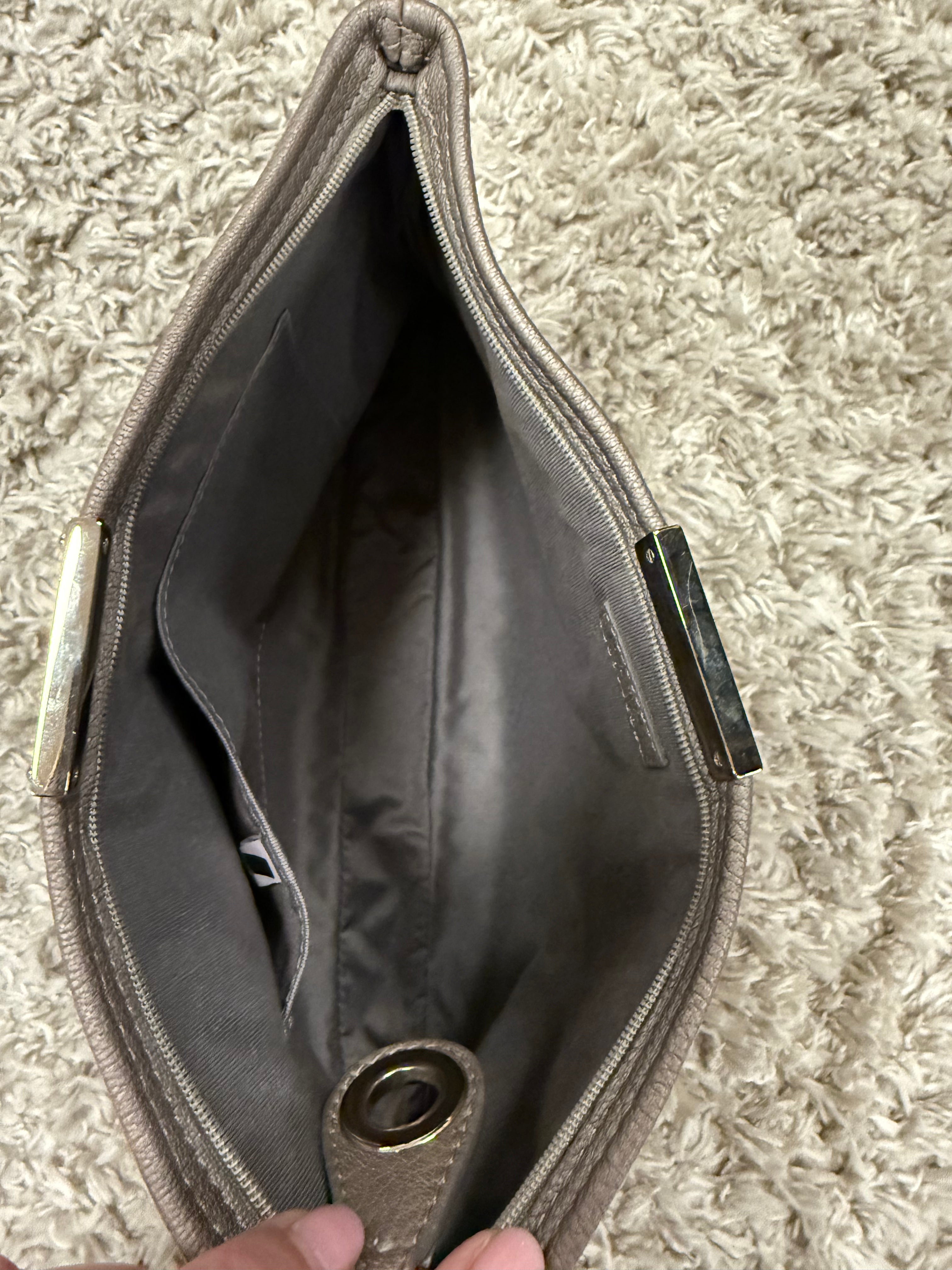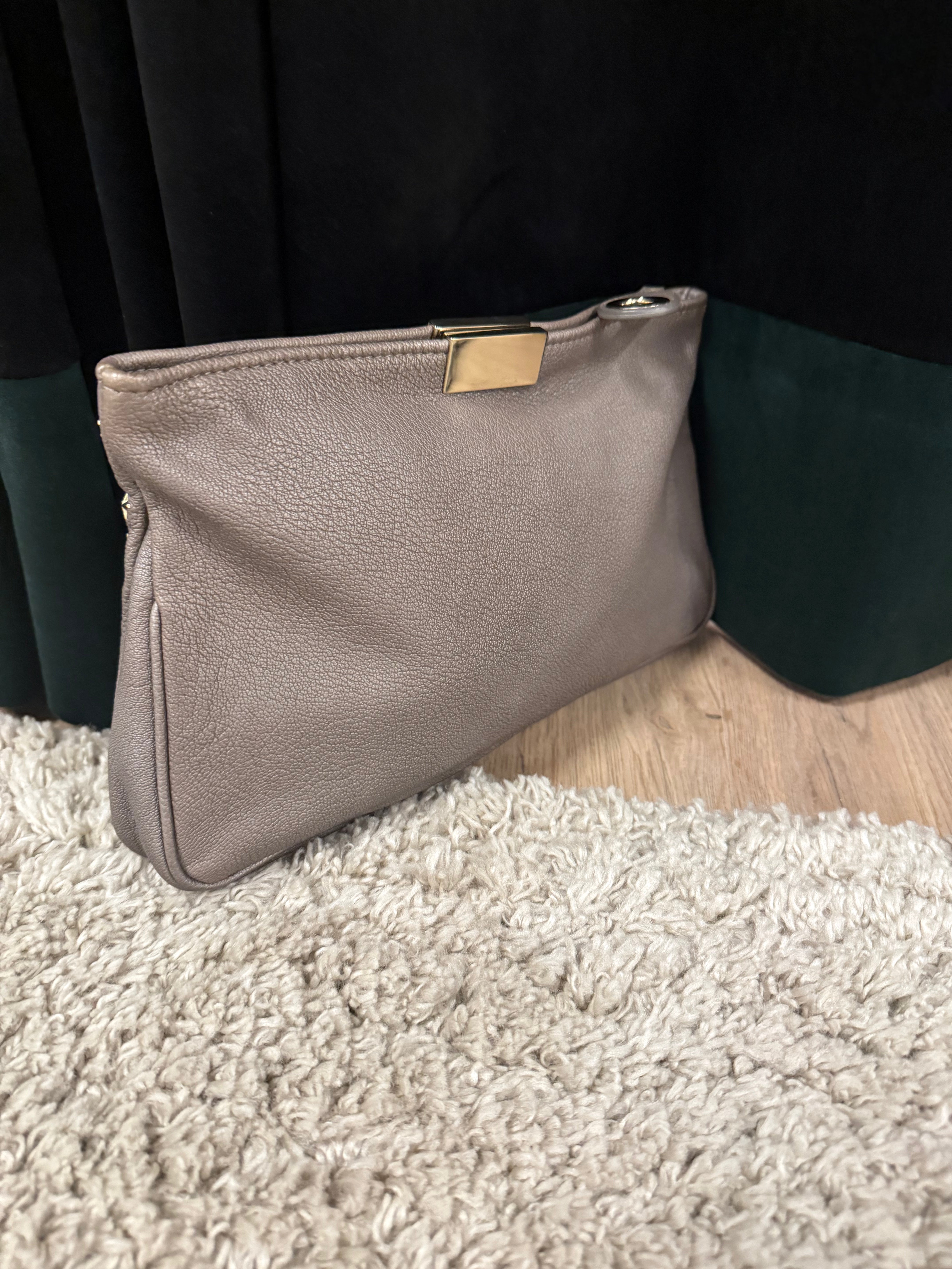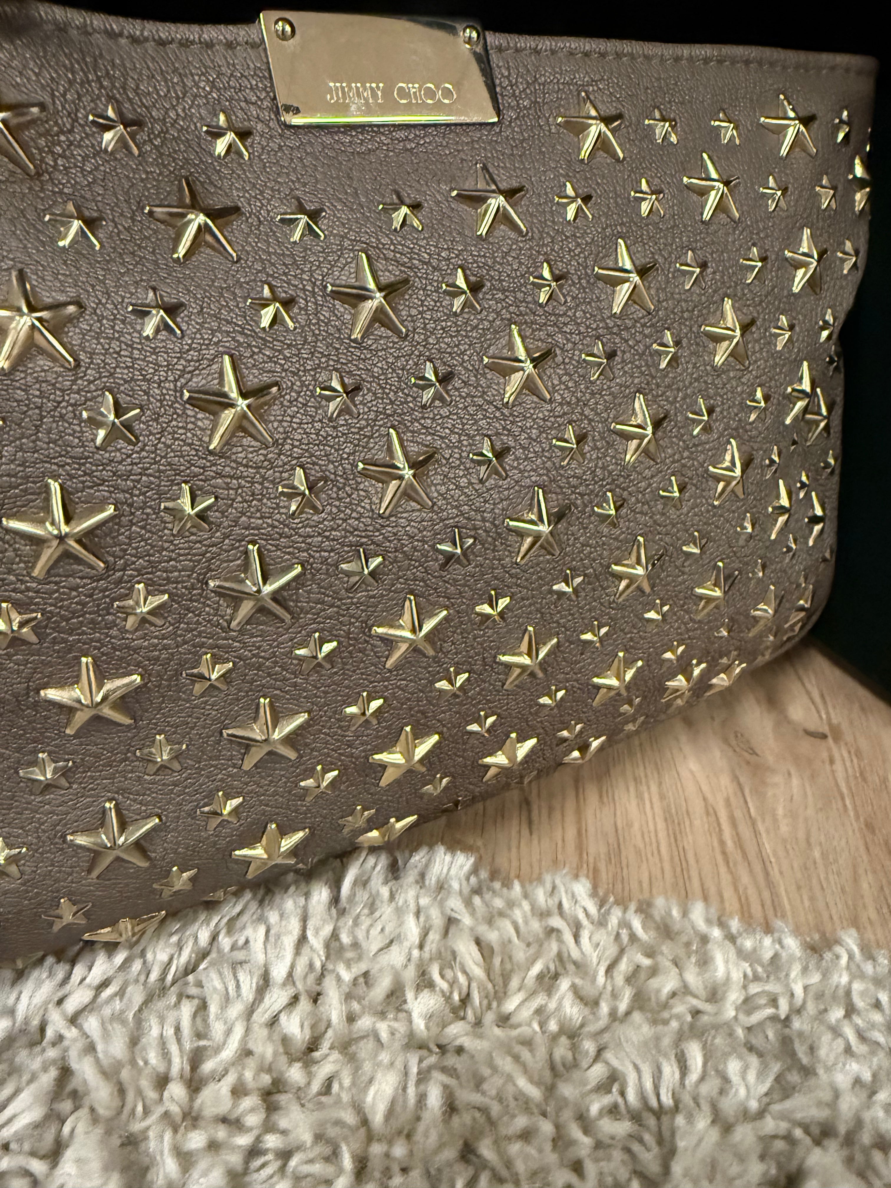 Taupe kleur clutch met een rits sluiting en goud kleur sterretjes en logo plaatje.