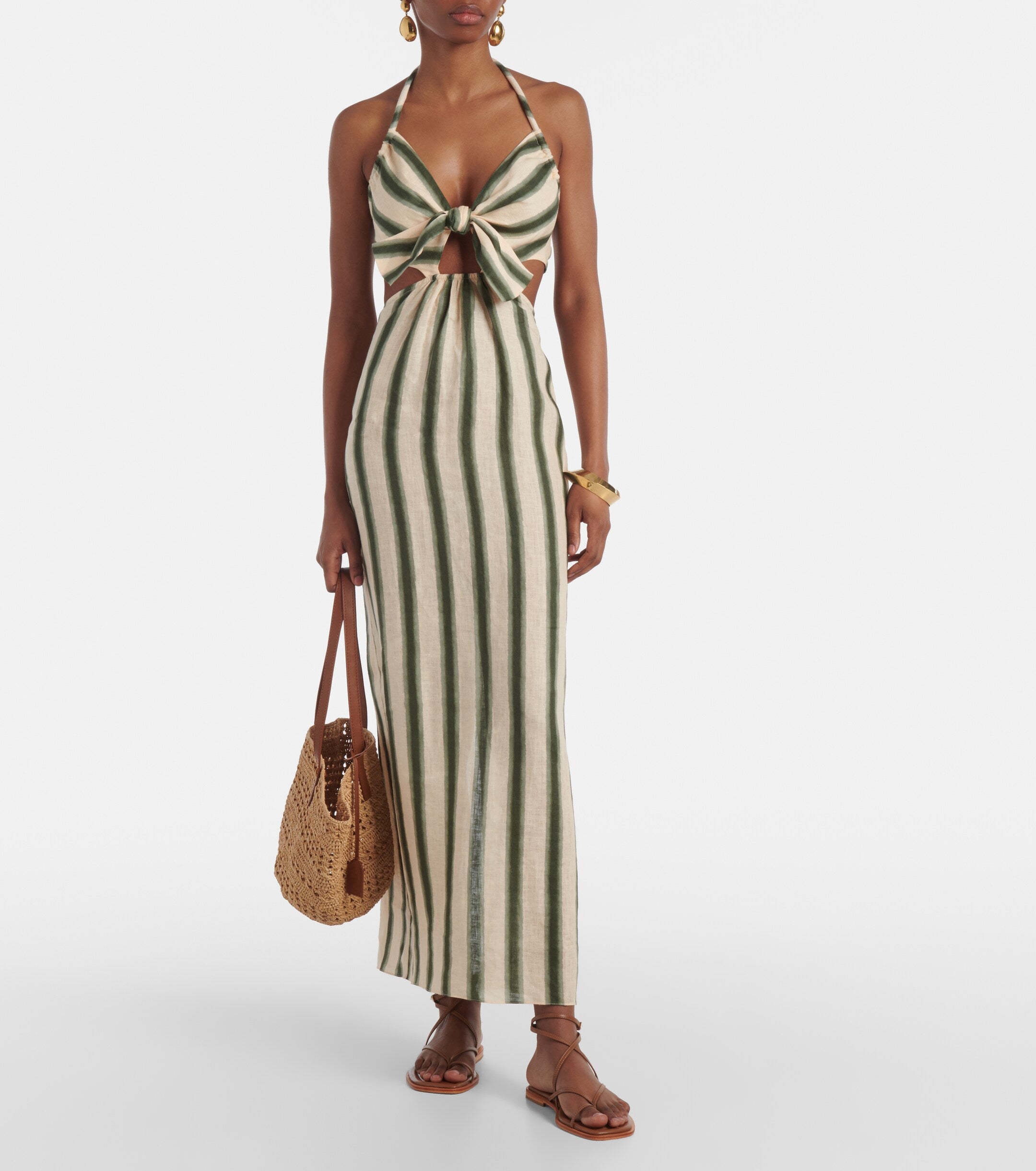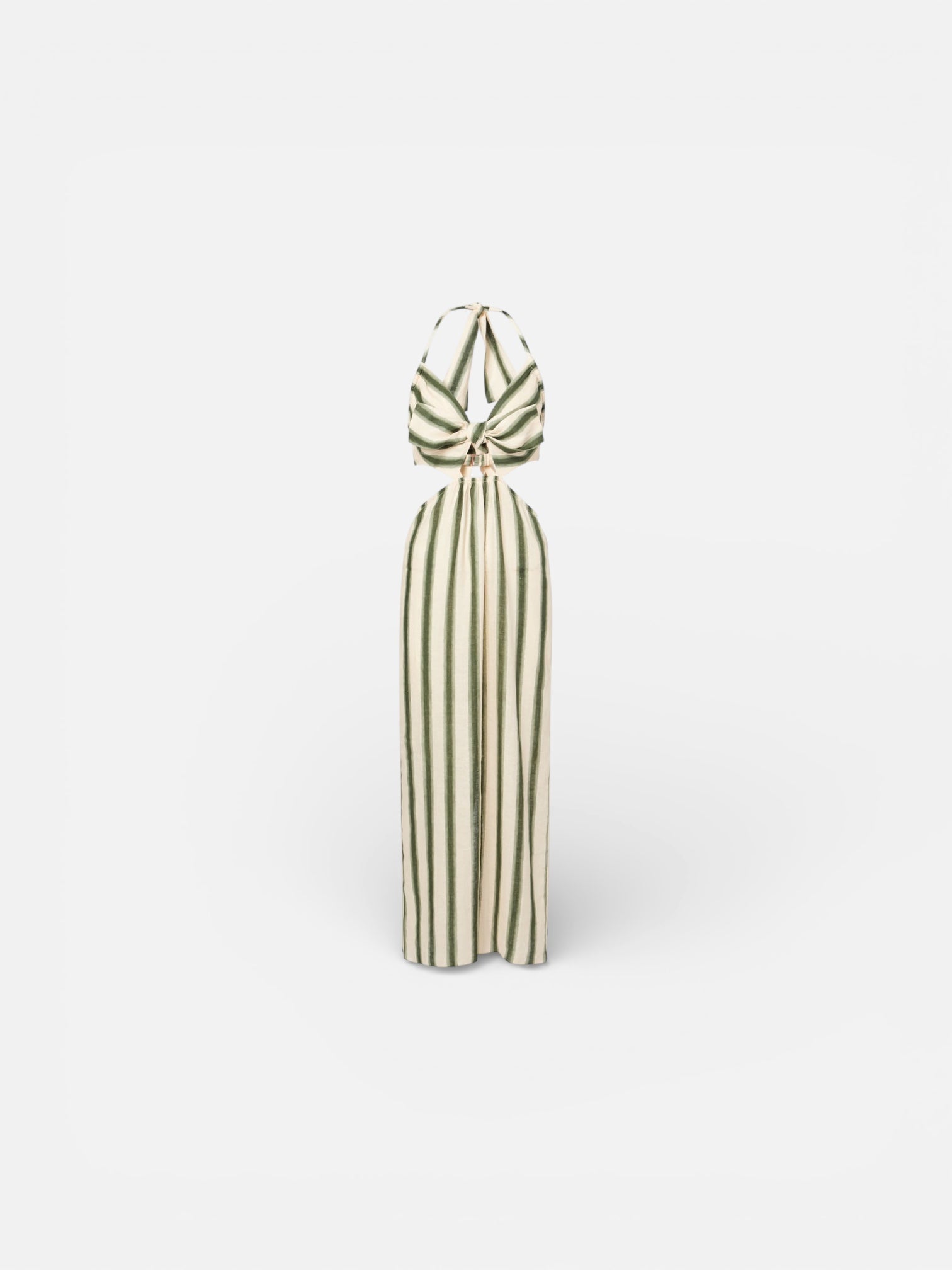 100% linnen jurk in ecru met groen, lage rug, elastische taille en cut-out details.
