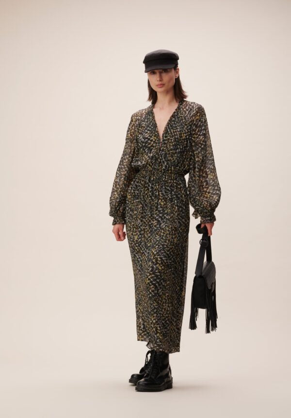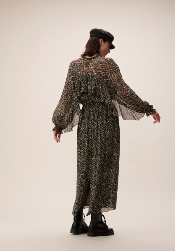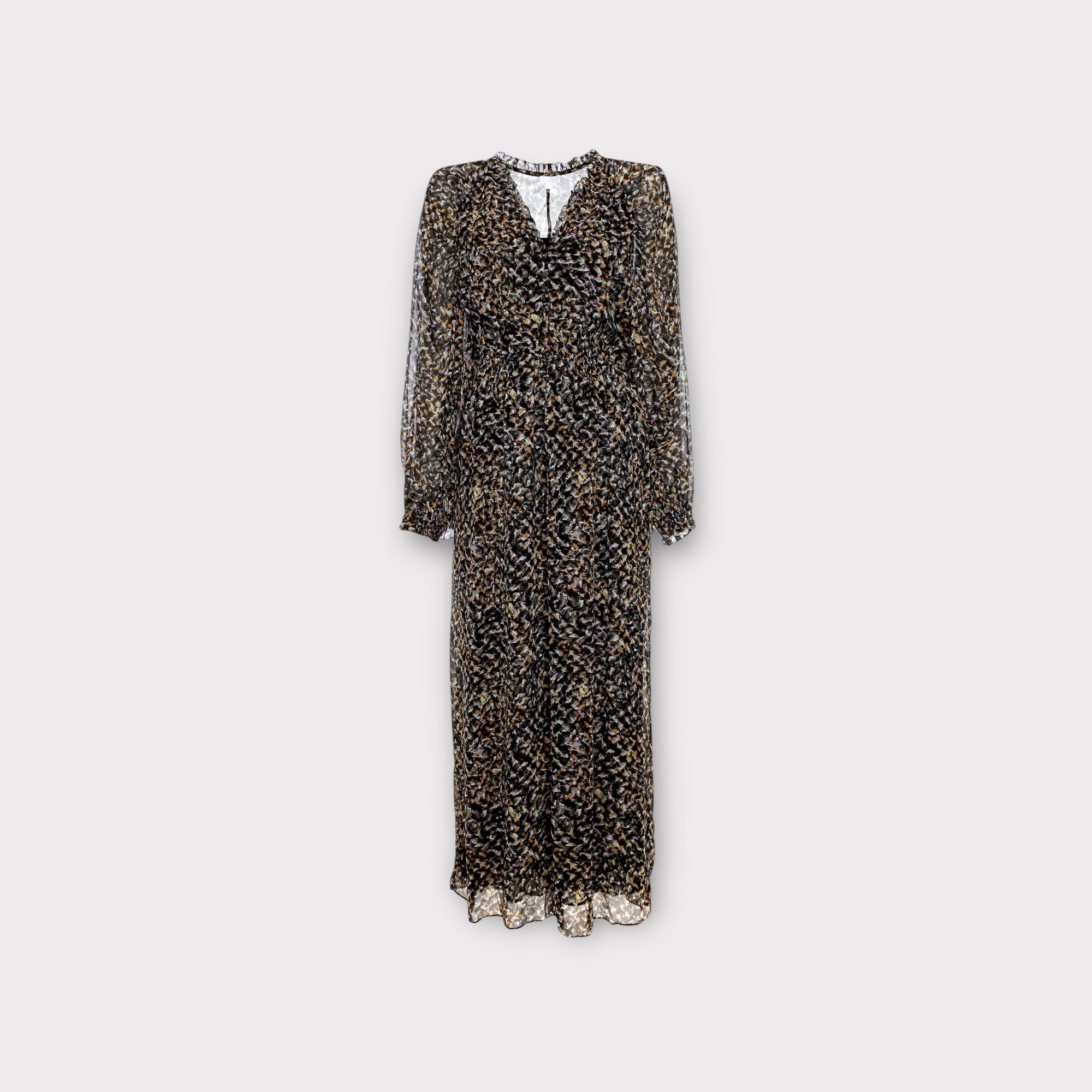 Lange jurk met transparante laag ingezette wijde mouwen, elastiek in de taille, een V-hals met knoopjes en is verder gevoerd.