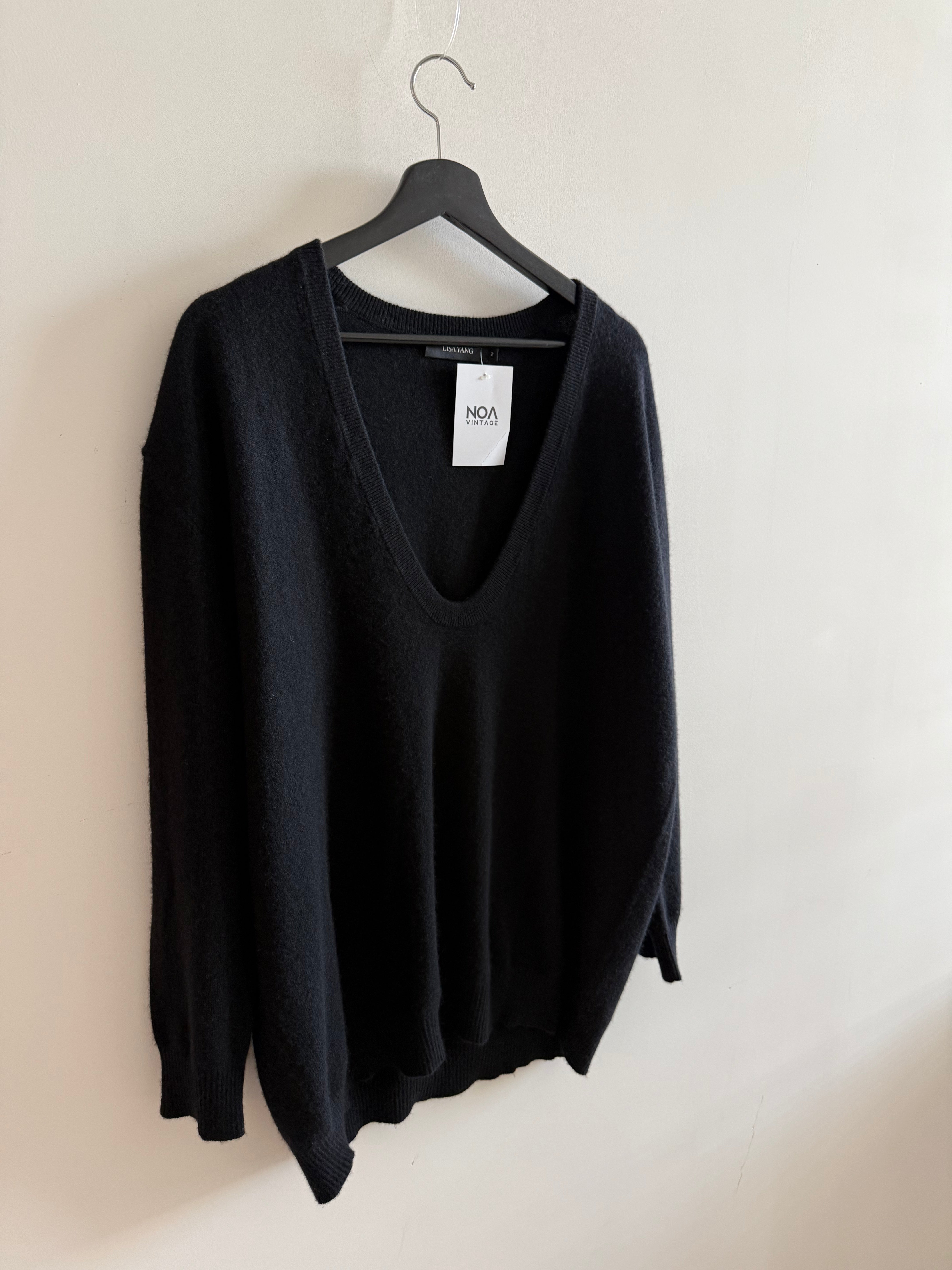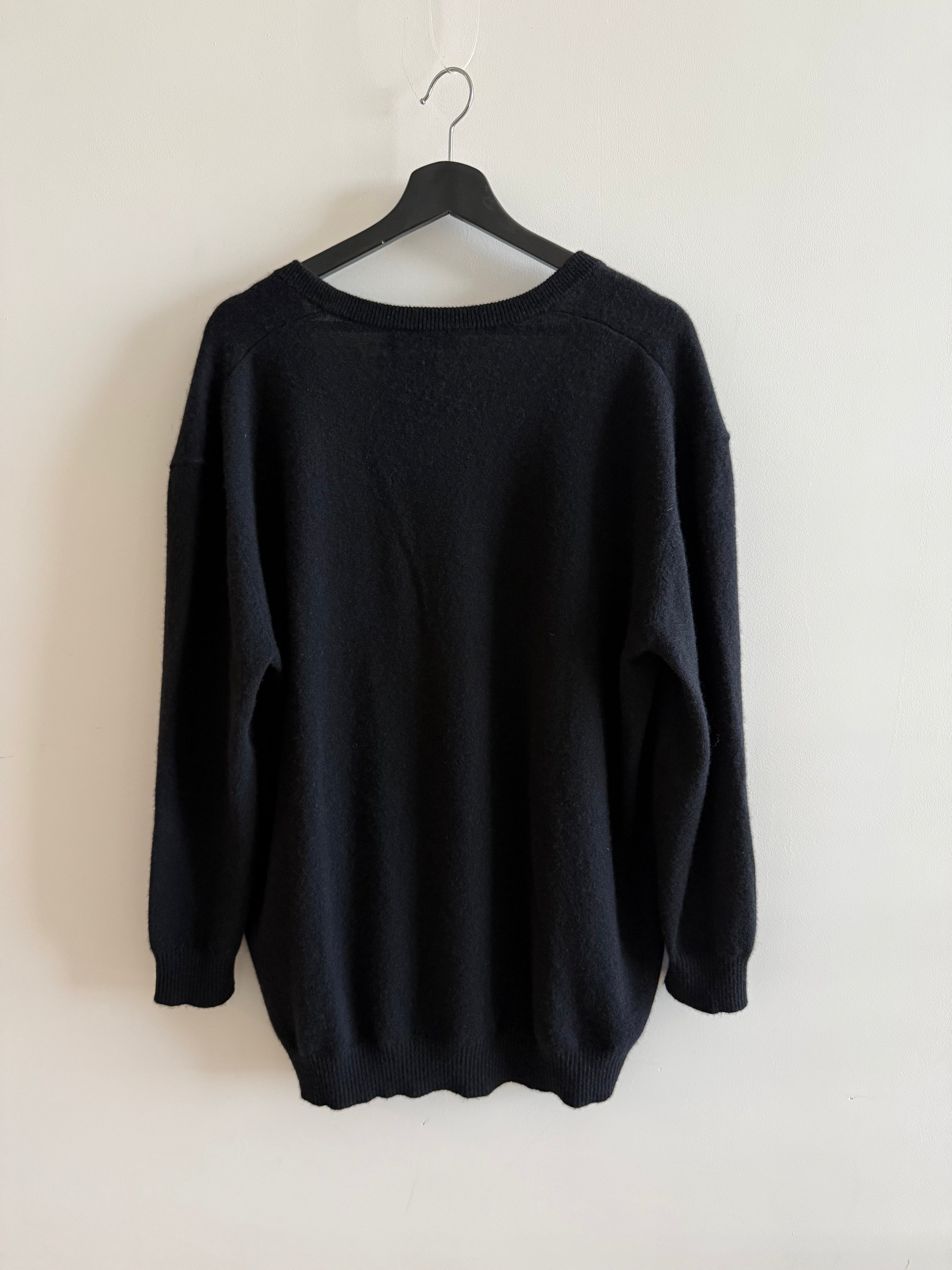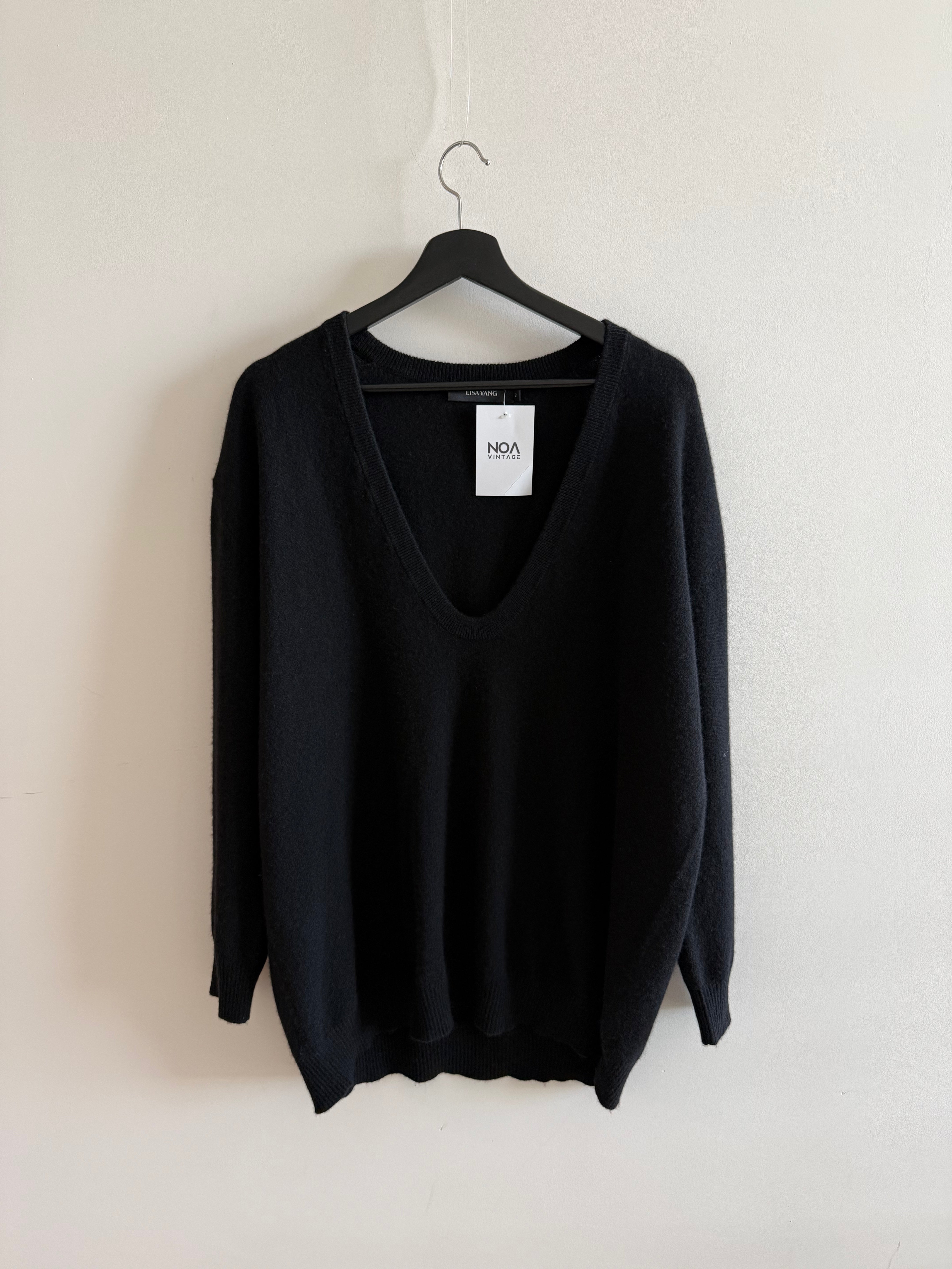 Zwarte lange 100% cashmere trui met een V-hals en lange mouwen.