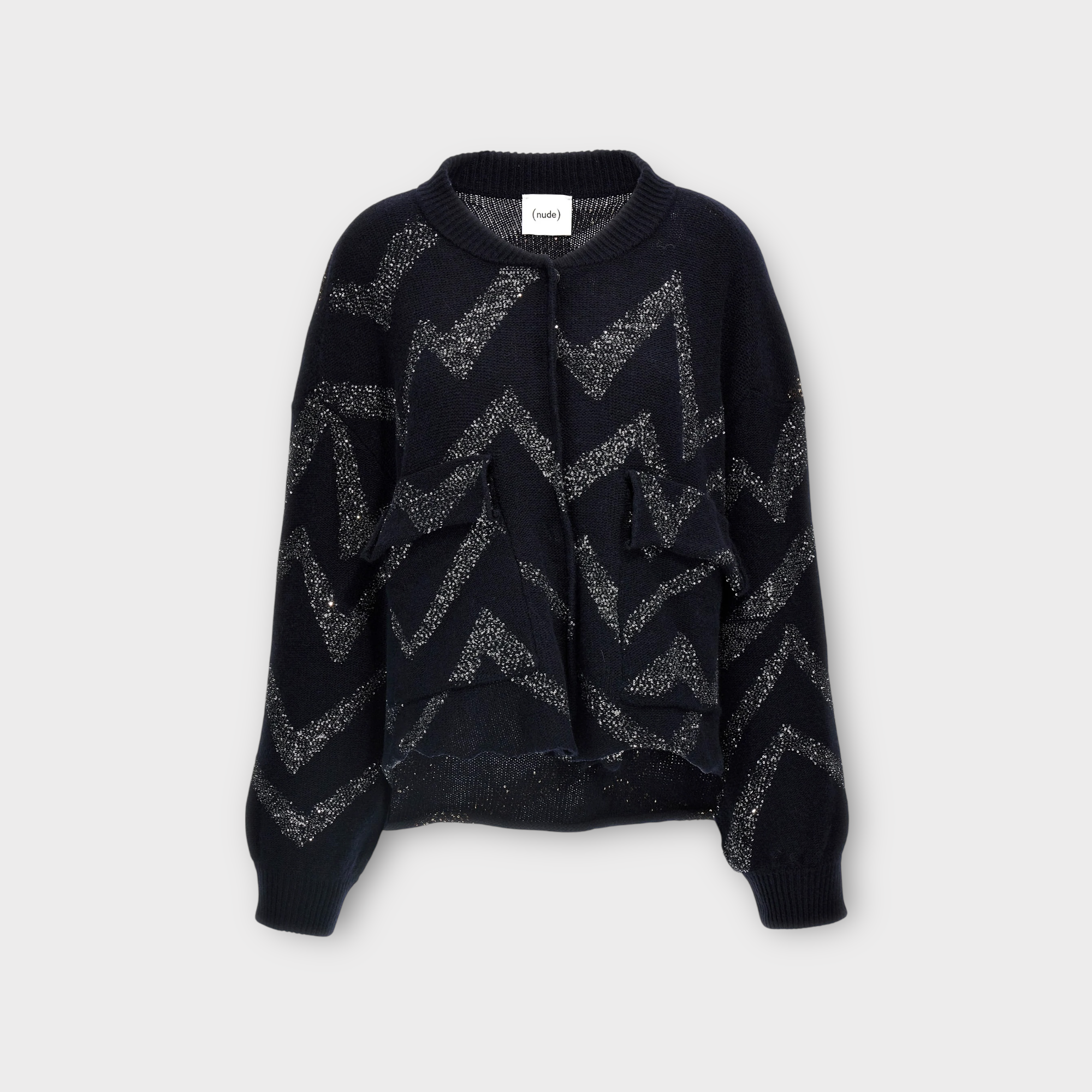 Donkerblauw sequin knit vest met lange mouwen, drukker sluiting, ronde hals, klepzakken en een iets korte wijde fit.