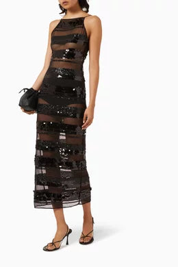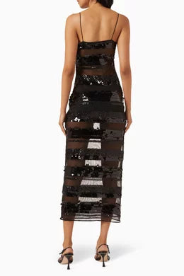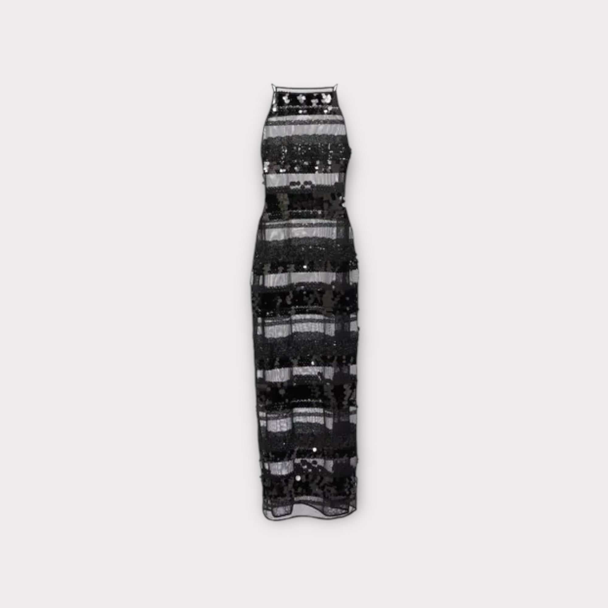 Zwarte aangesloten streep pailletten jurk met spaghettibandjes. Rits aan de zijkant.