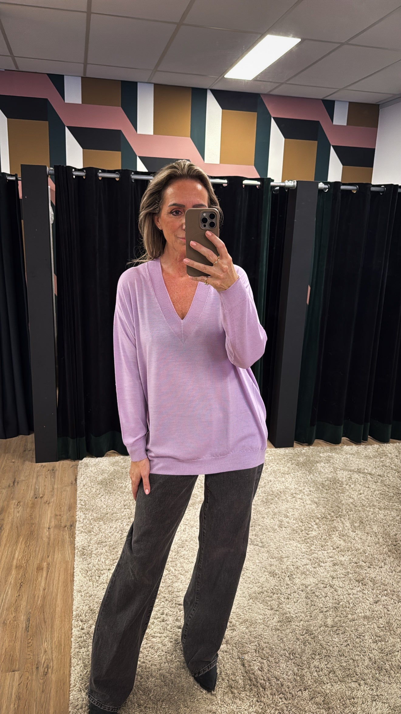 Lila oversized lange trui met lange mouwen en een V-hals.