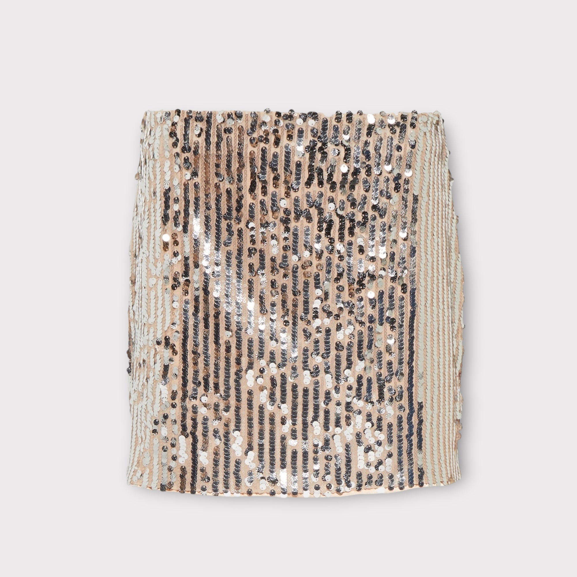 Pailletten minirok in nude/zilver met een splitje aan de zijkant en rits aan de achterkant.