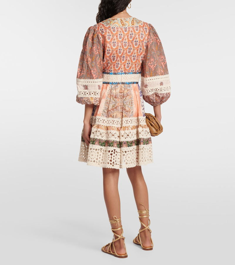 Paisley print minijurk met lange pofmouwen, A-lijn, gevoerd, V-hals, tailleband en blinde rits sluiting.