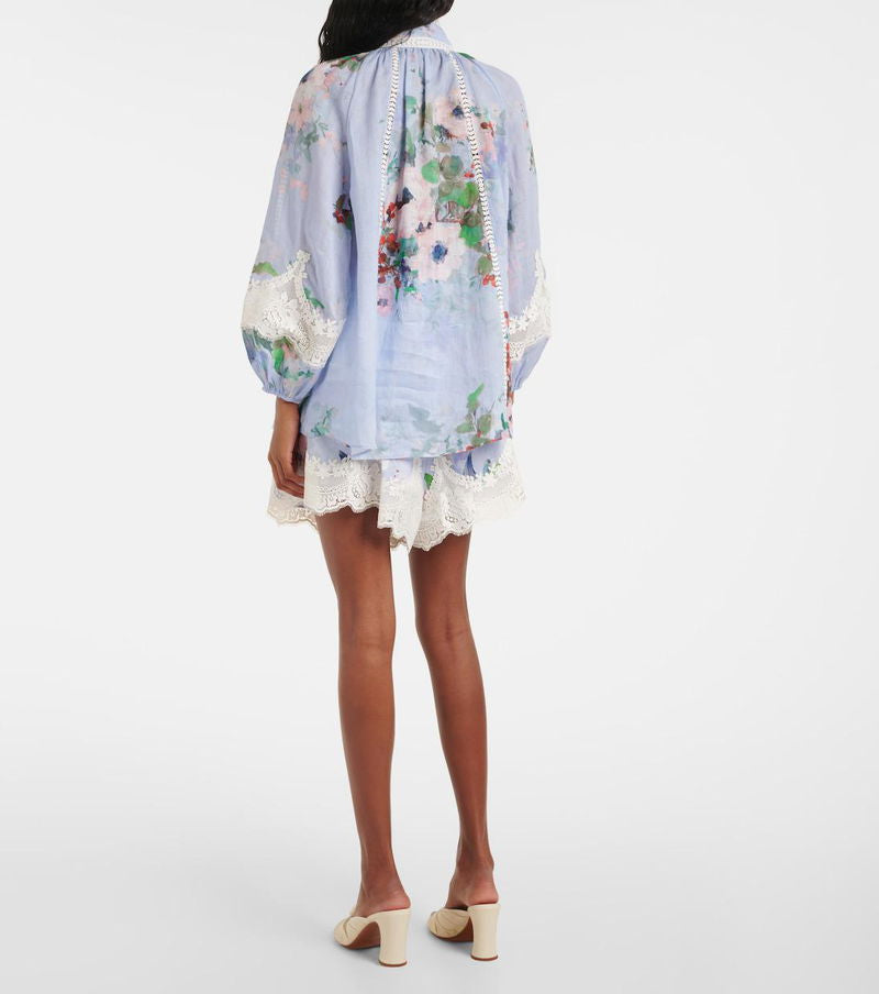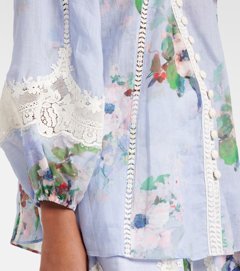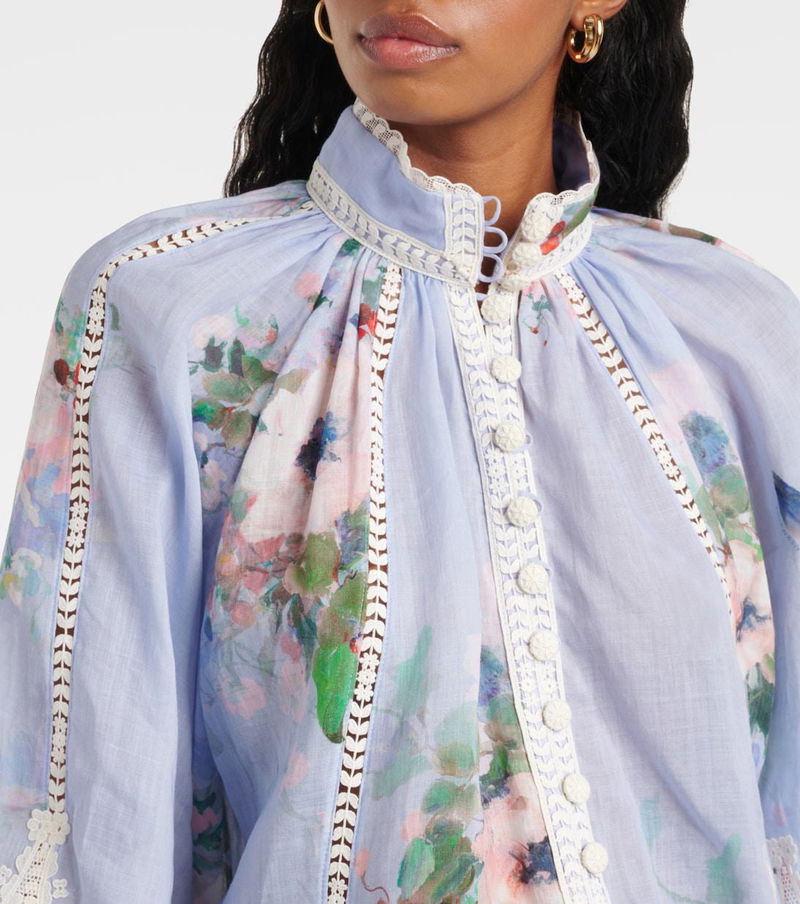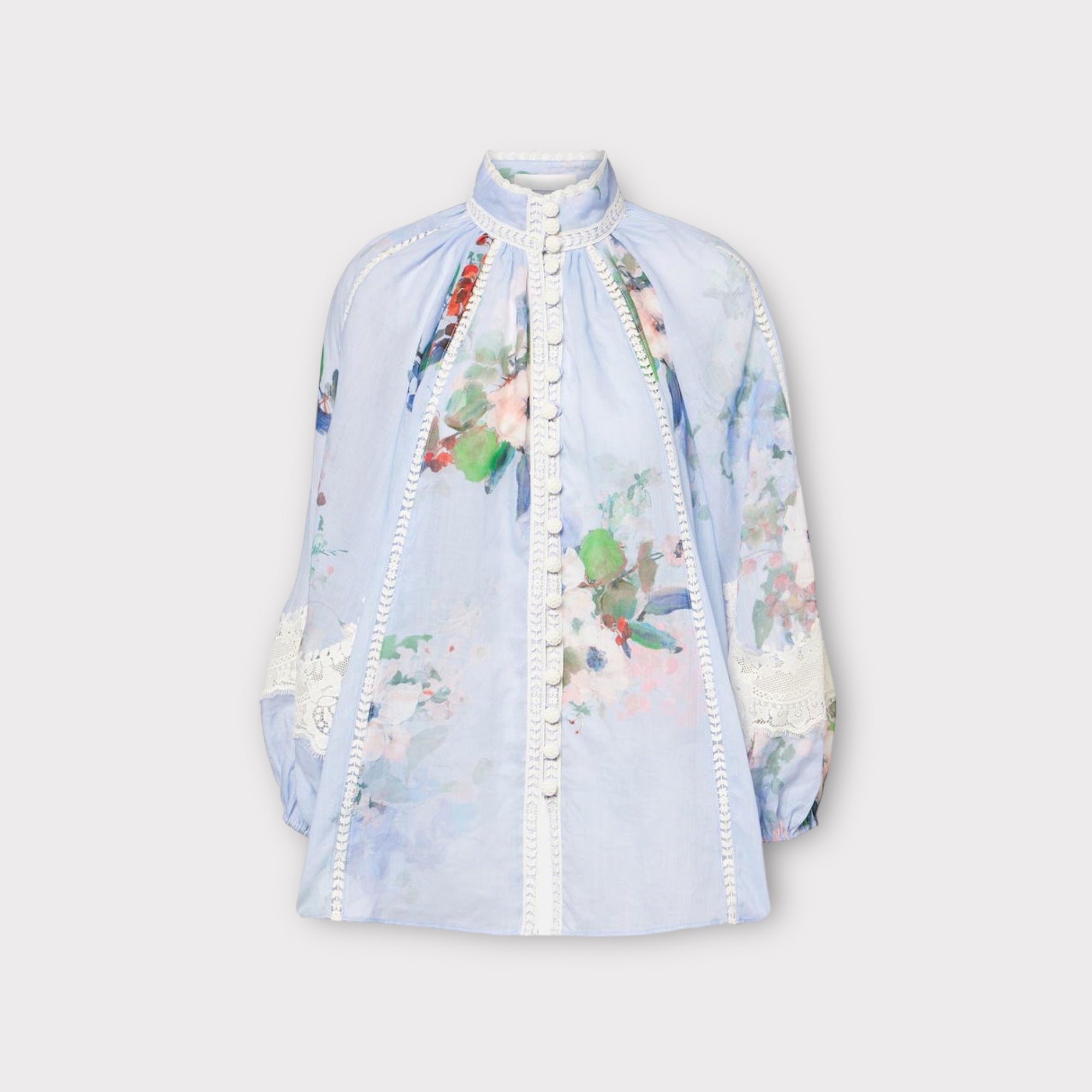 Lichtblauwe blouse met lange mouwen met elastiek aan de eindes, knoopsluiting, opstaande boord en bloemprint.