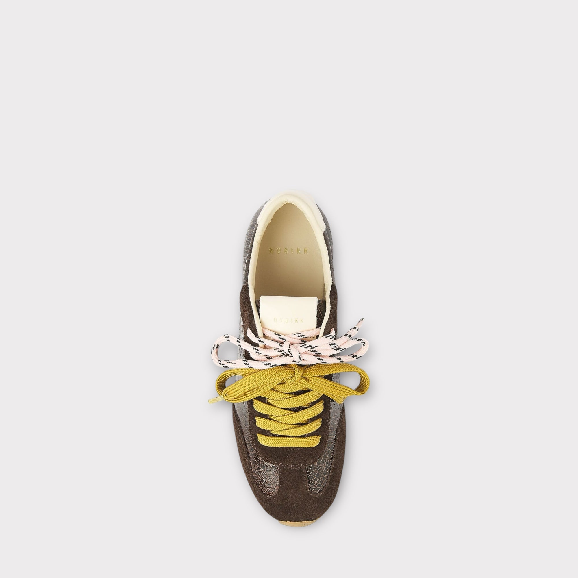 Donkerbruine lage sneakers van een combinatie van leer en suède, uitneembaar voetbed, lichtgewicht zool en gekleurde veters.