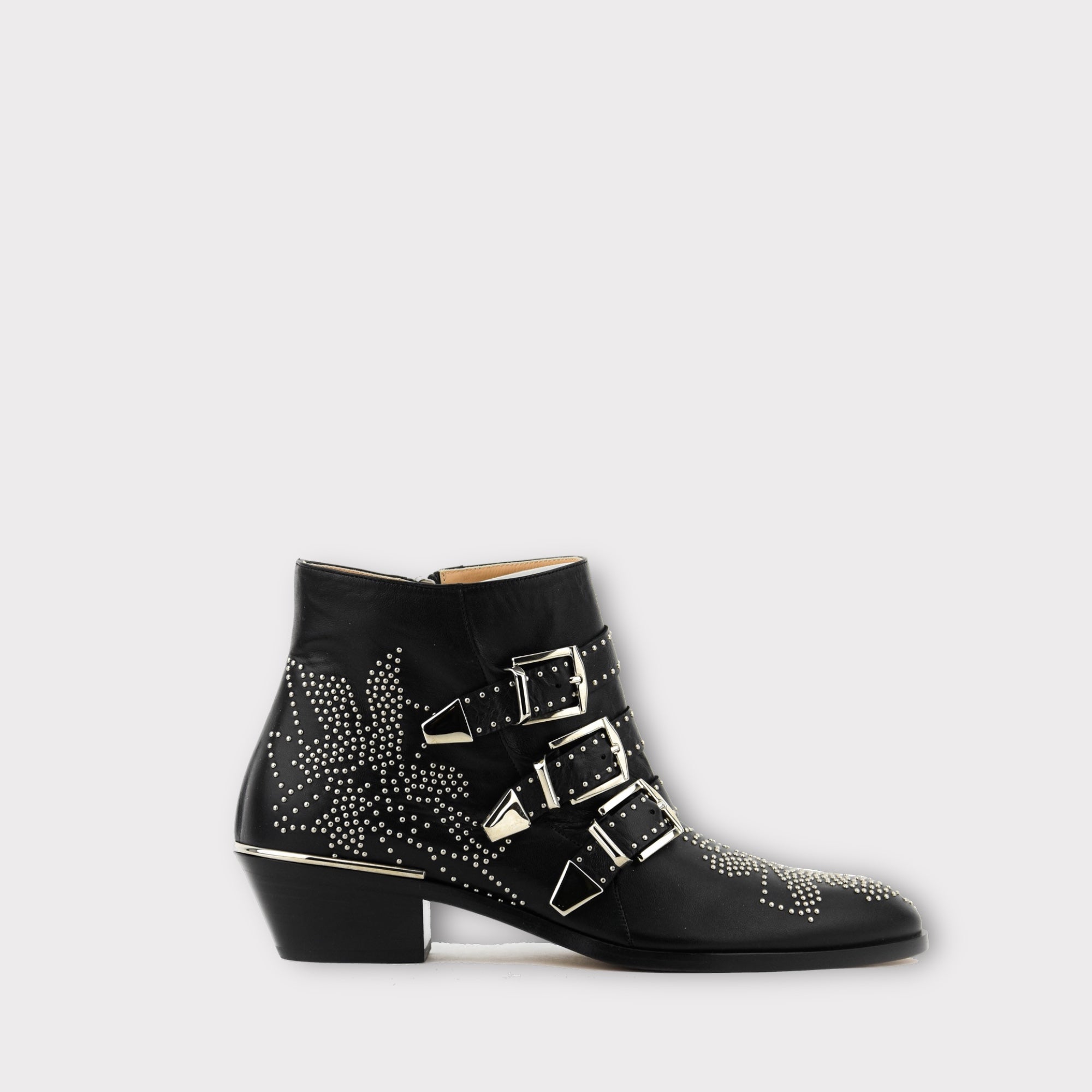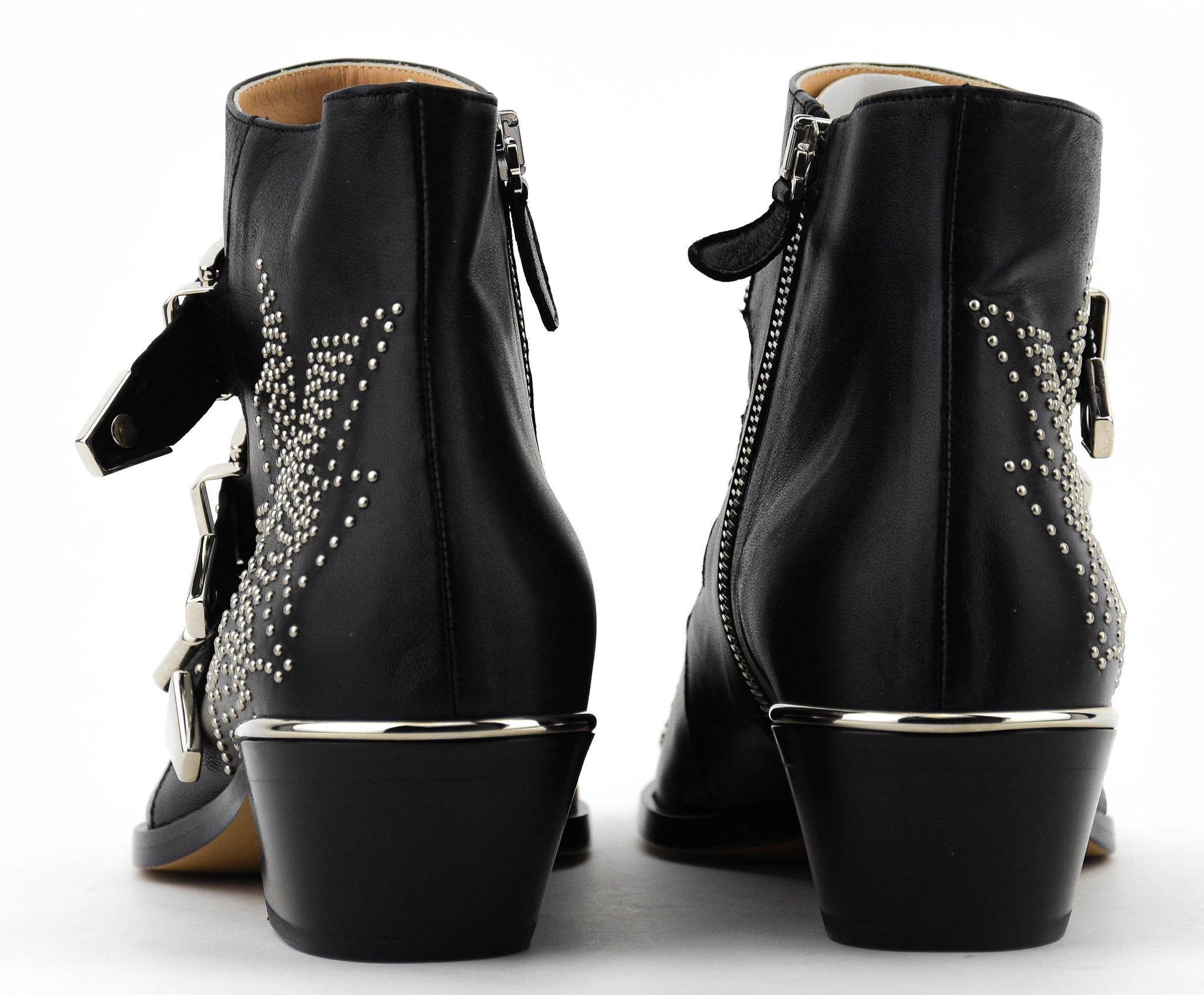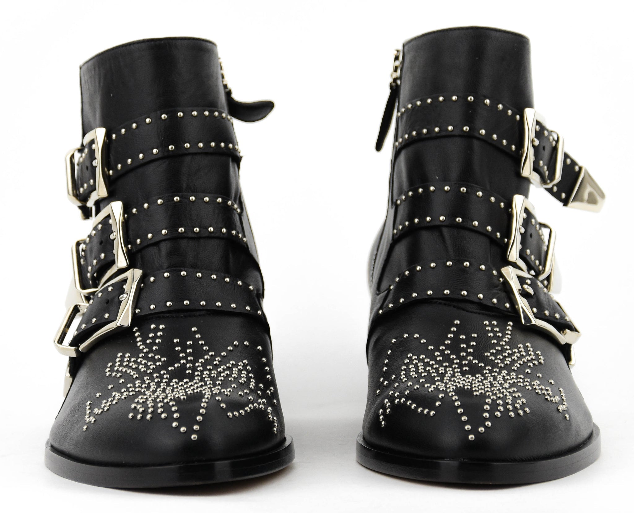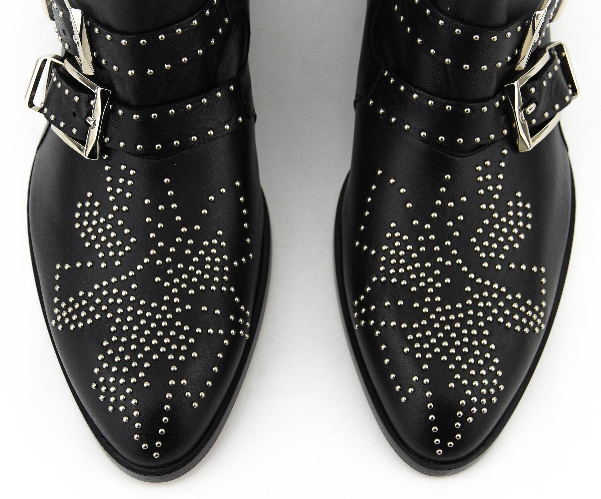 Zwarte enkellaars met zilverkleur studs, riempjes en een rits sluiting aan de binnenzijde.
