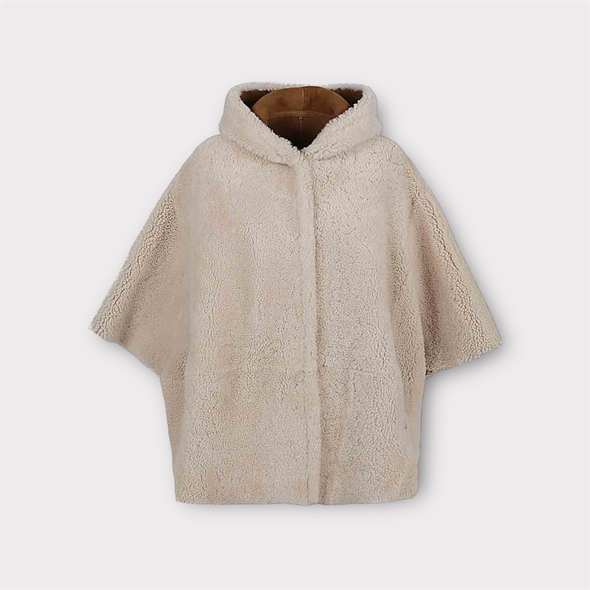 Jas/cape aan 2 kanten te dragen, teddy en suède met een drukker sluiting, capuchon, steekzakken en een oversized fit.