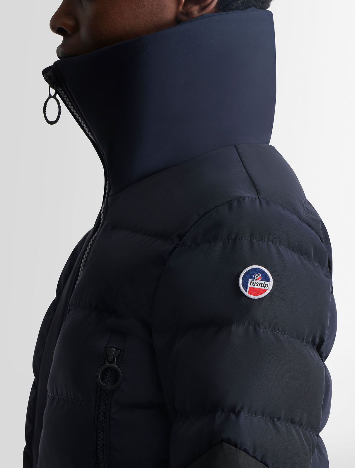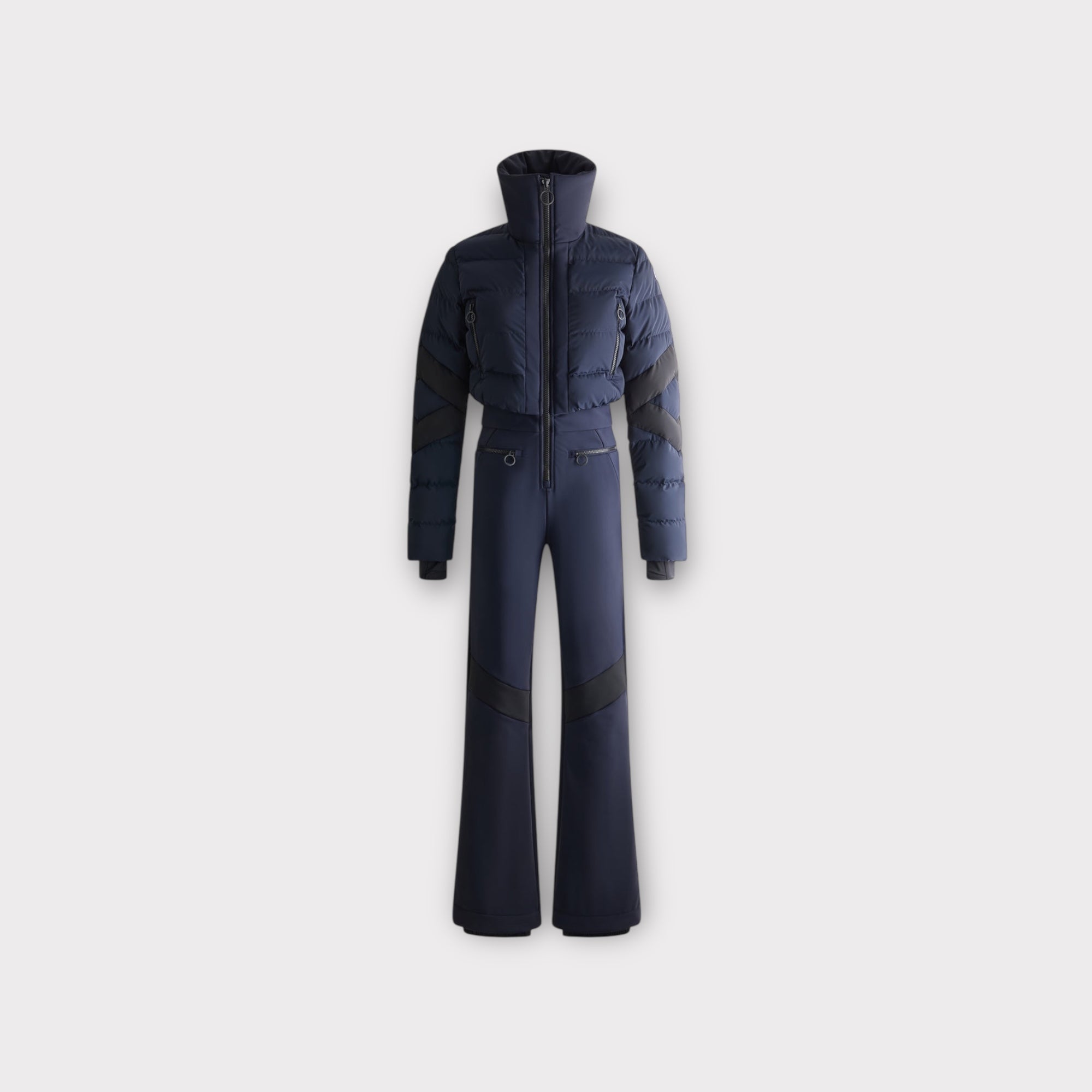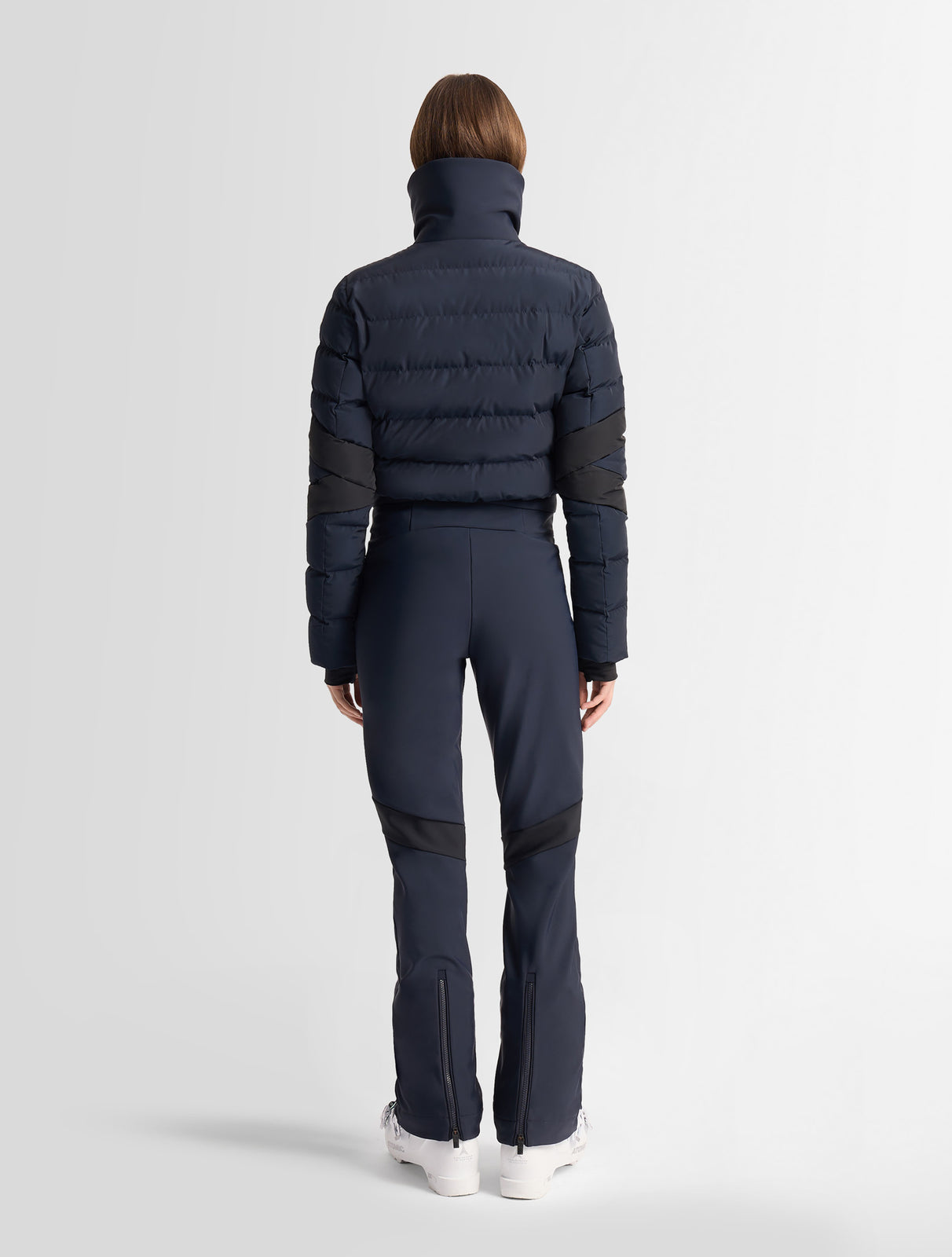 Diep donkerblauw (lijkt op zwart) skipak met logo op de mouw, opstaande kraag, rits sluiting, doorgestikte bovenkant, zakken en is water afstotend.
