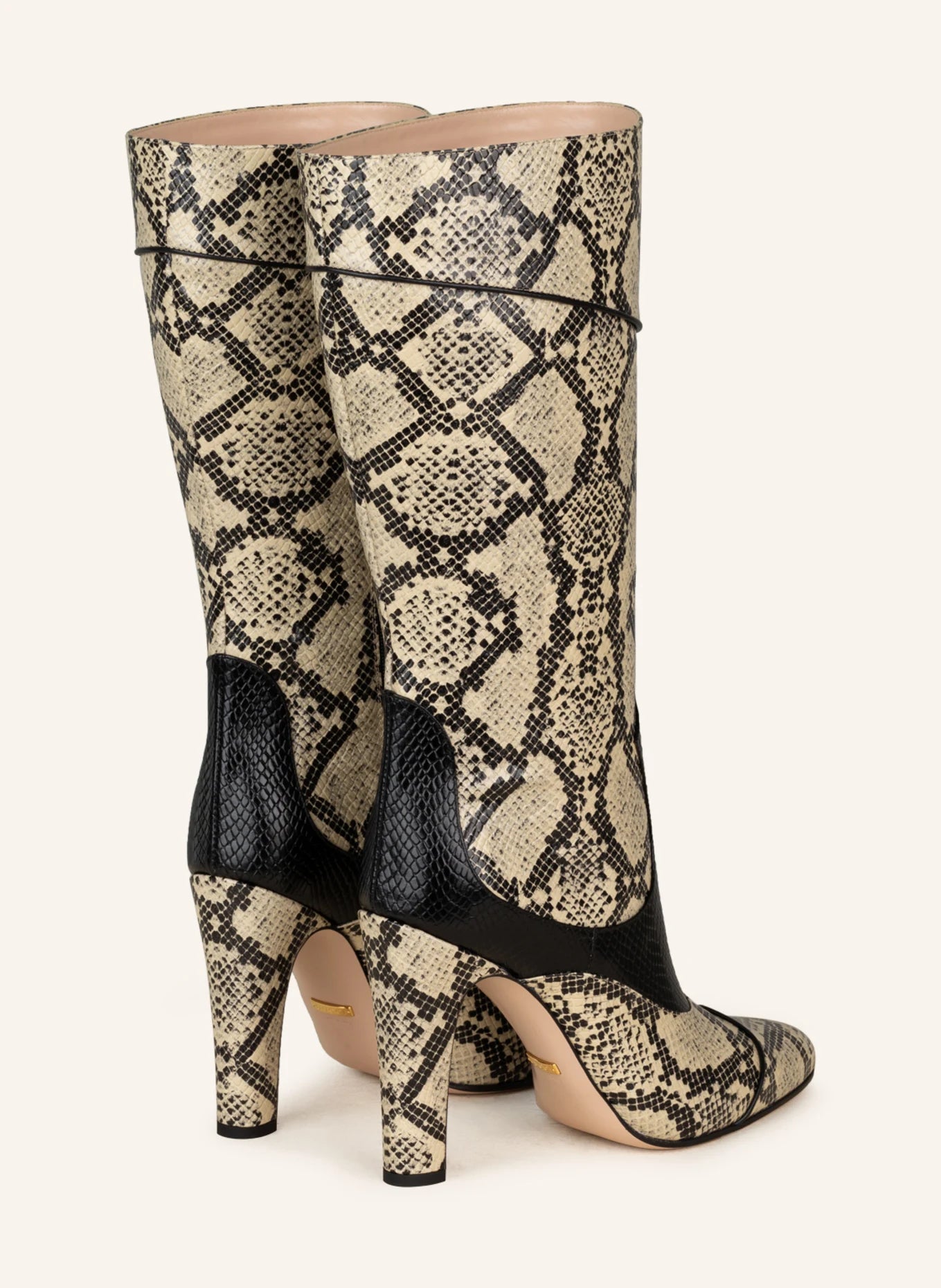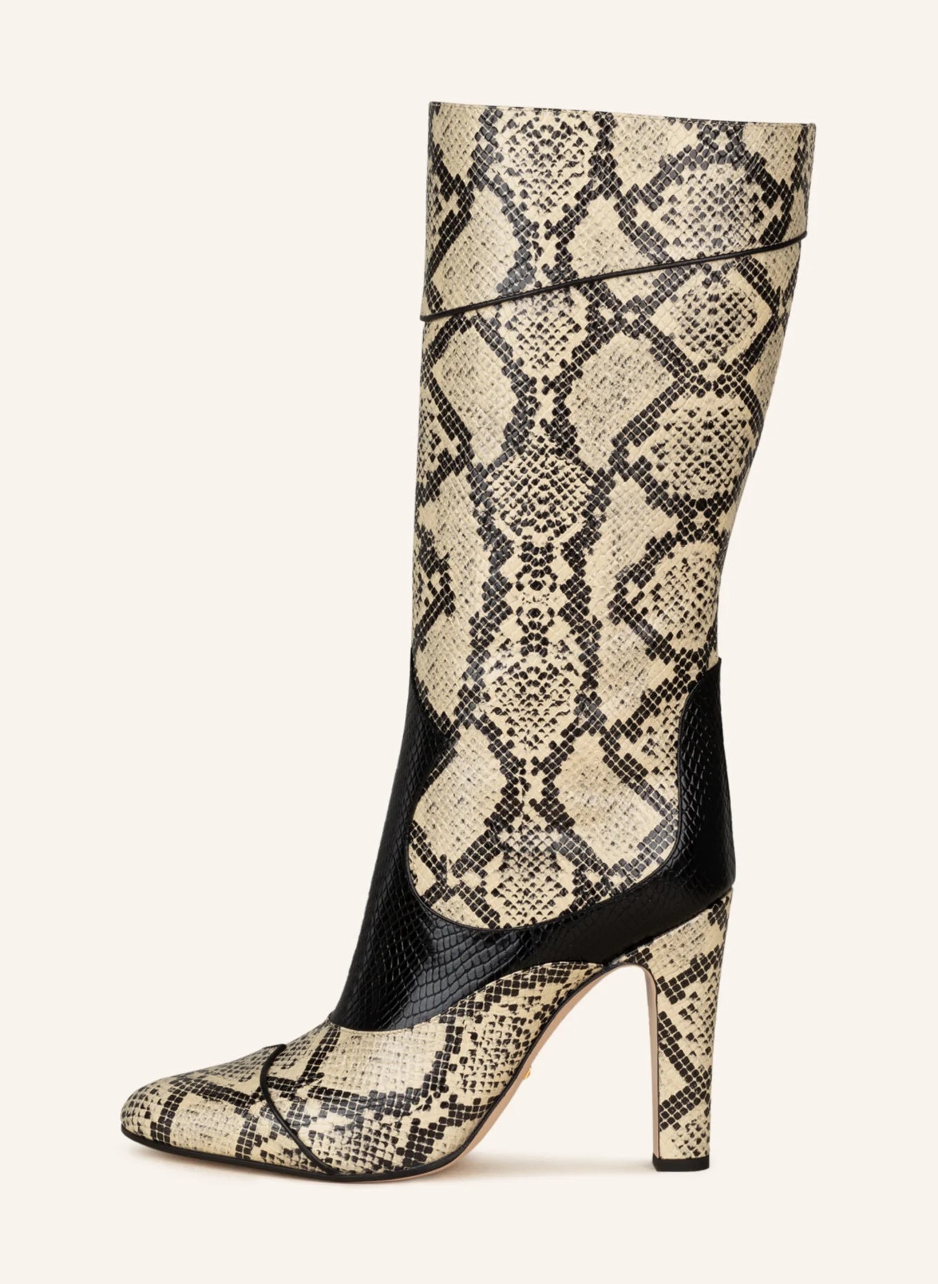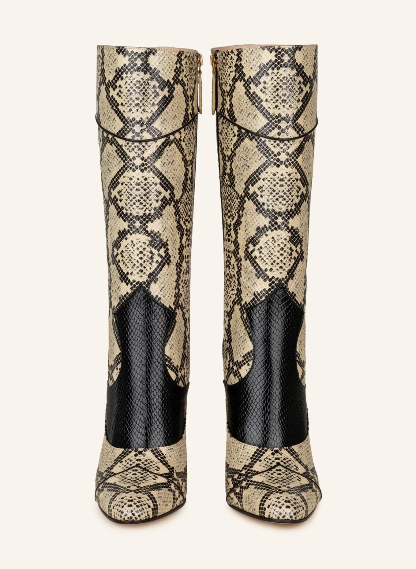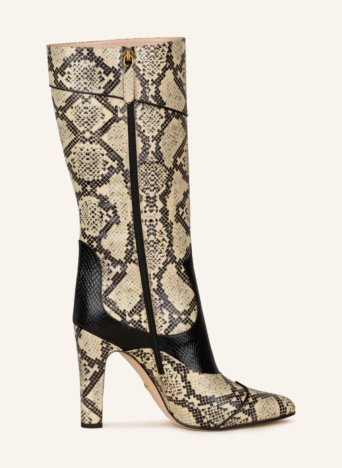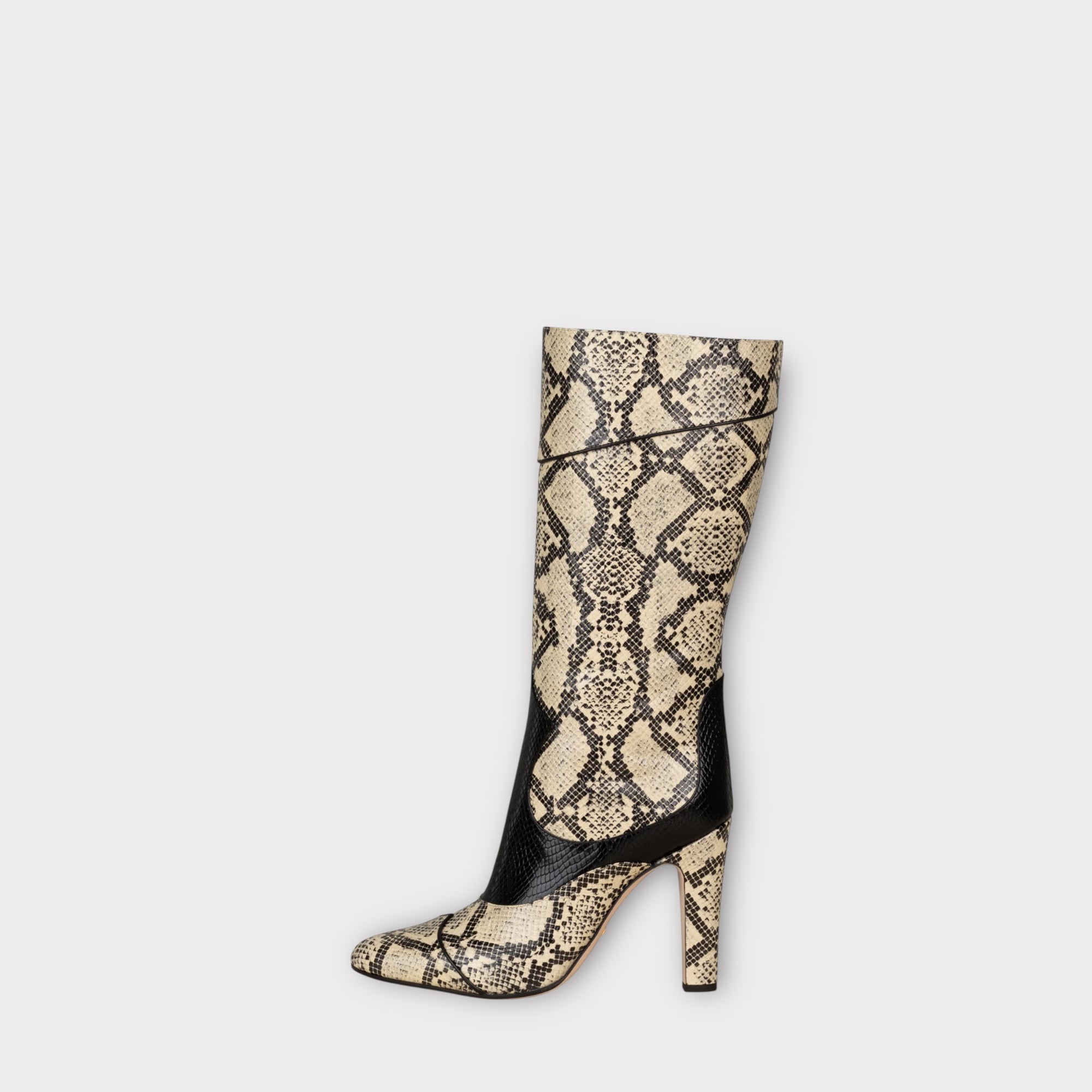 Zwart met beige leren laars met reptielstructuur, goudkleur details, rits sluiting aan de zijkant, puntige neus en hak in dezelfde kleur.