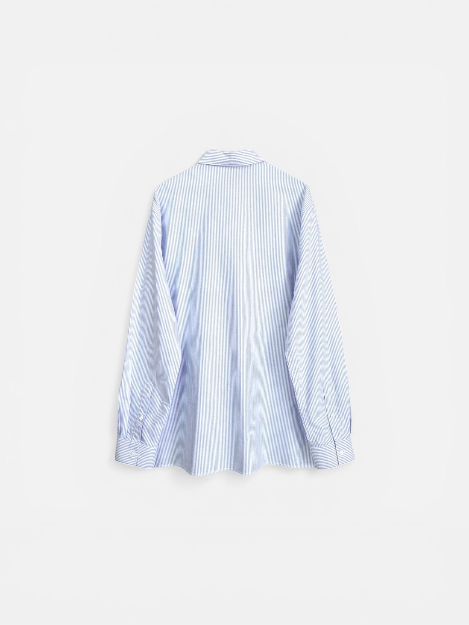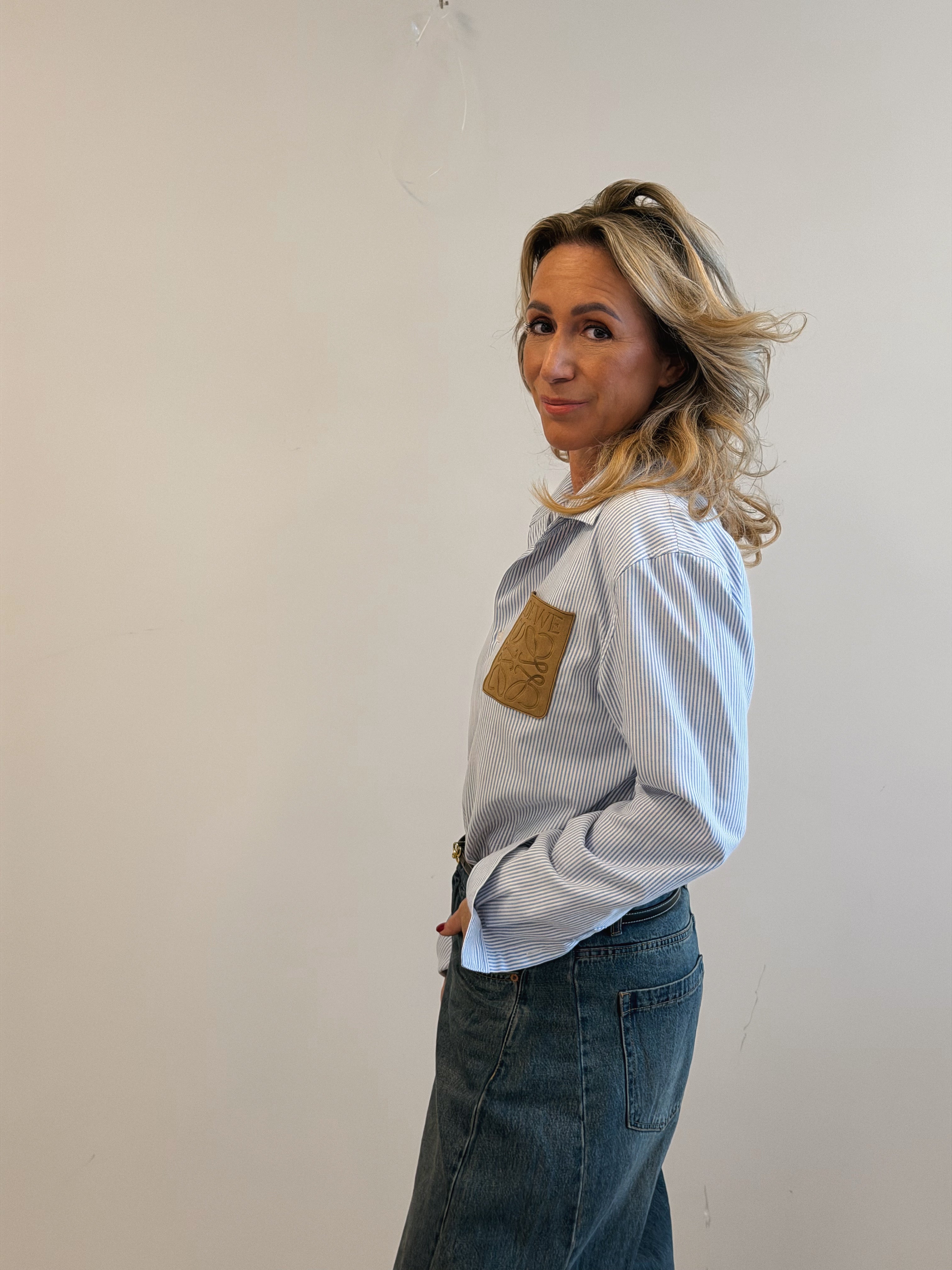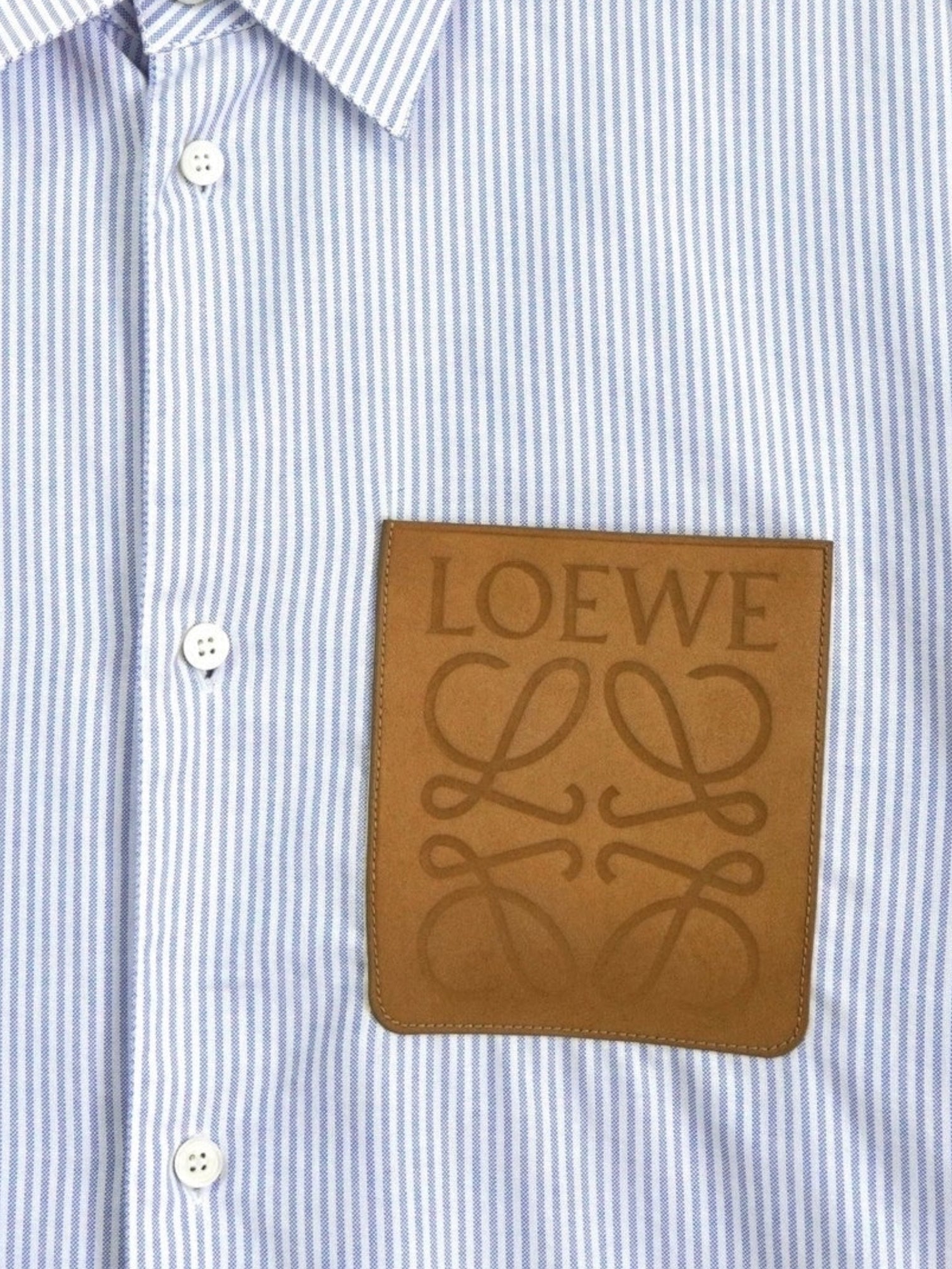 Blauw met wit gestreept overhemd met lange mouwen, knoopsluiting, kraag en Loewe logo patch op de voorzijde. De blouse valt loose fit.