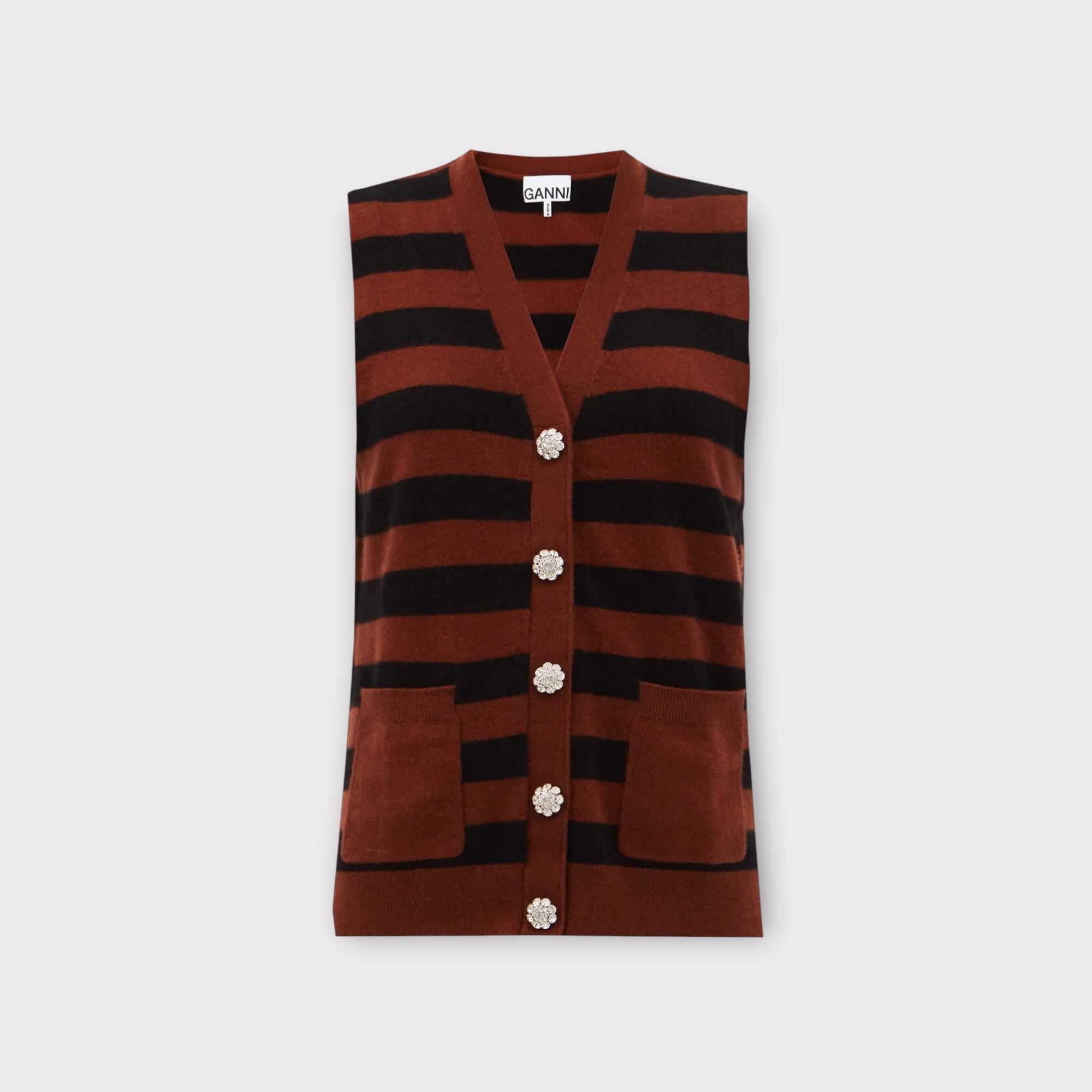 Mouwloos vest in een zwart met donkerbruine streep, glitter drukkers en zakjes.