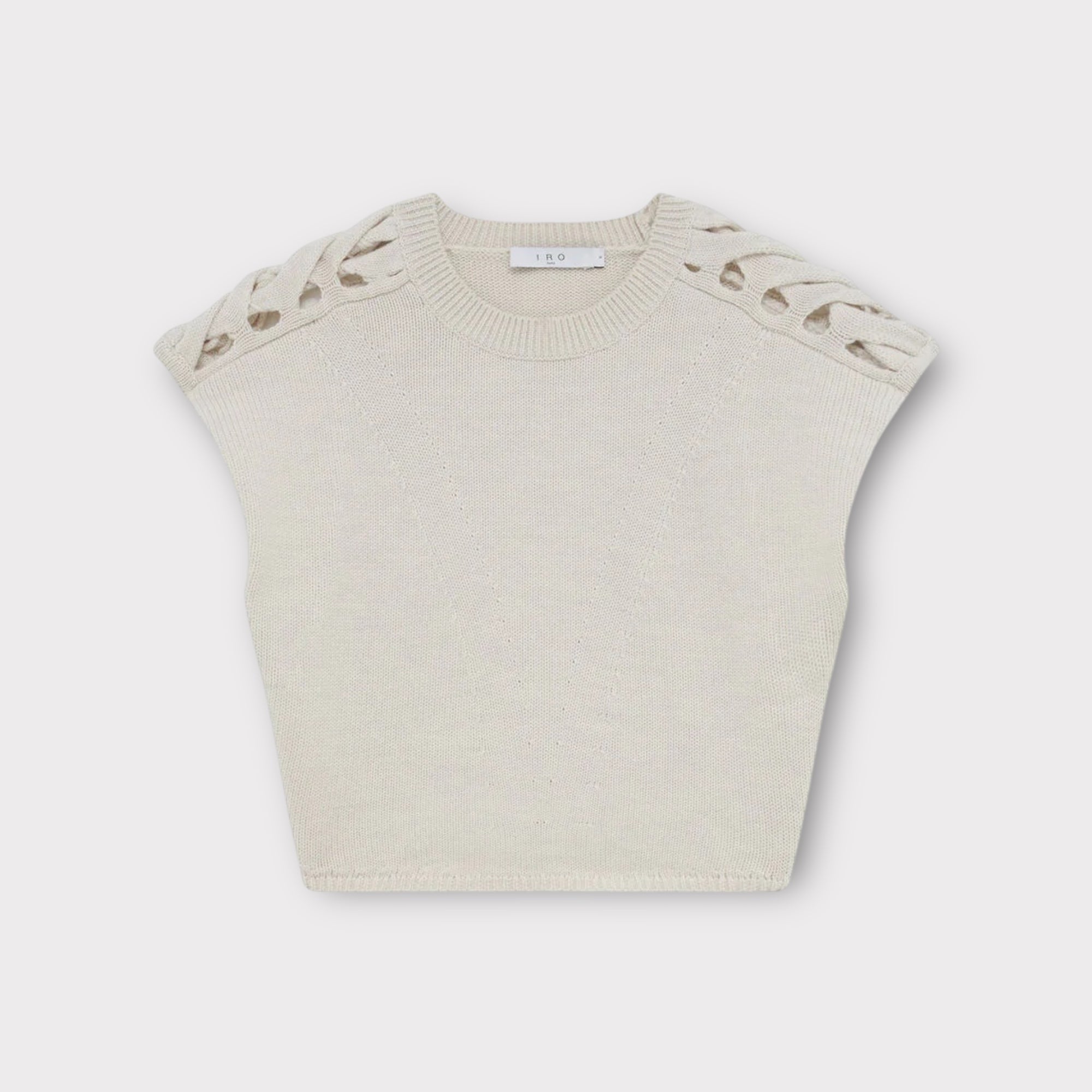 Mouwloze sweater van wol met een ronde hals, wijde armsgaten en gevlochten details.