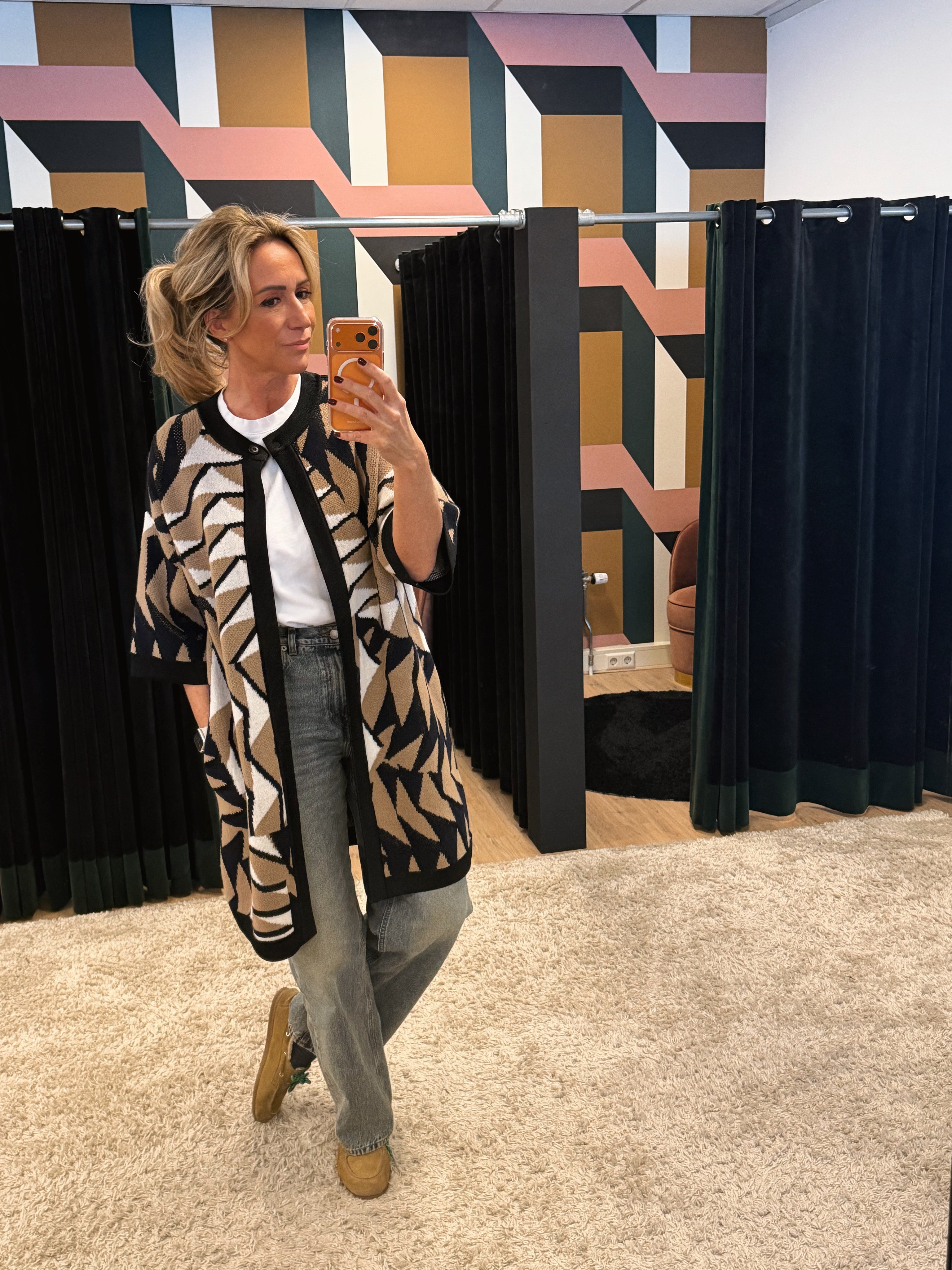 Halflang vest in een beige, zwart wit dessin met zijzakken, een drukker sluiting aan de bovenkant, ronde hals en 1/2 mouwlengte.
