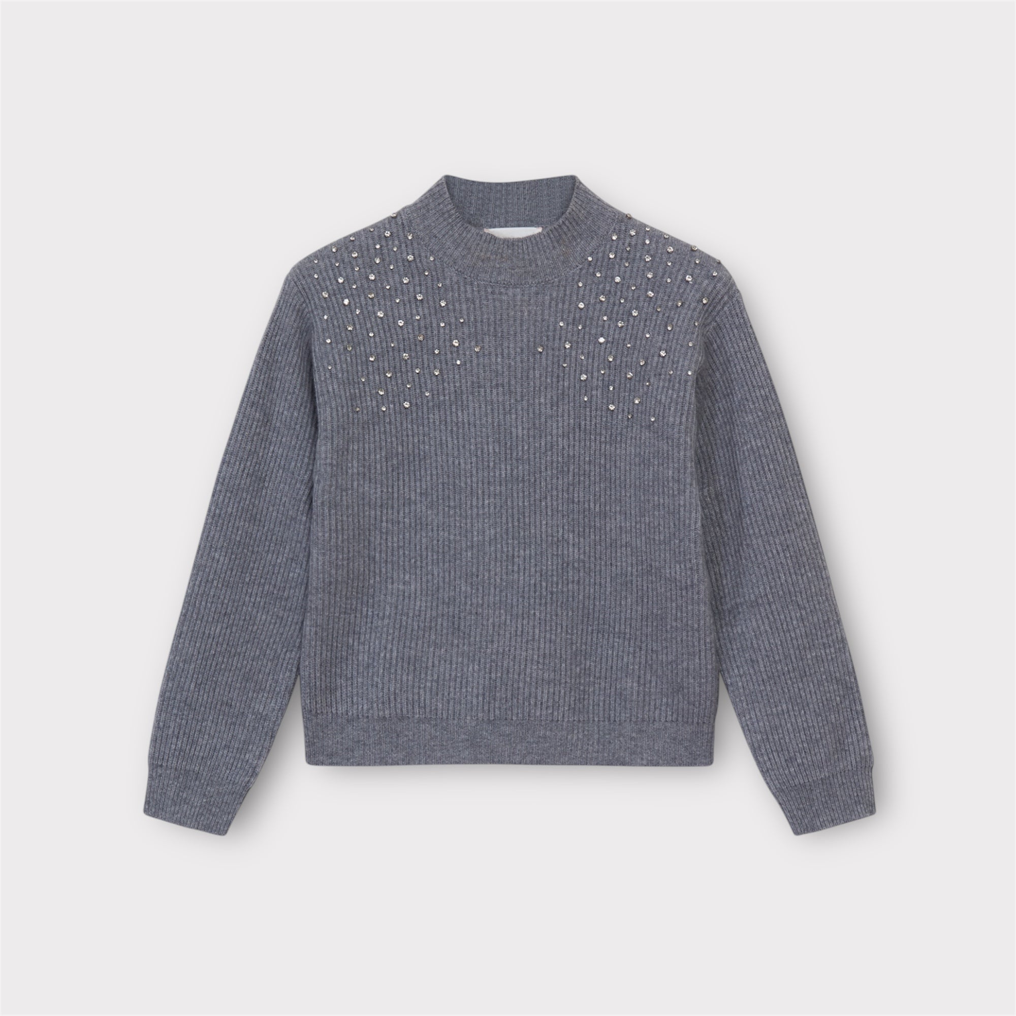 Wol mix trui met zilverkleur glitter, lange mouwen en een opstaande boord.