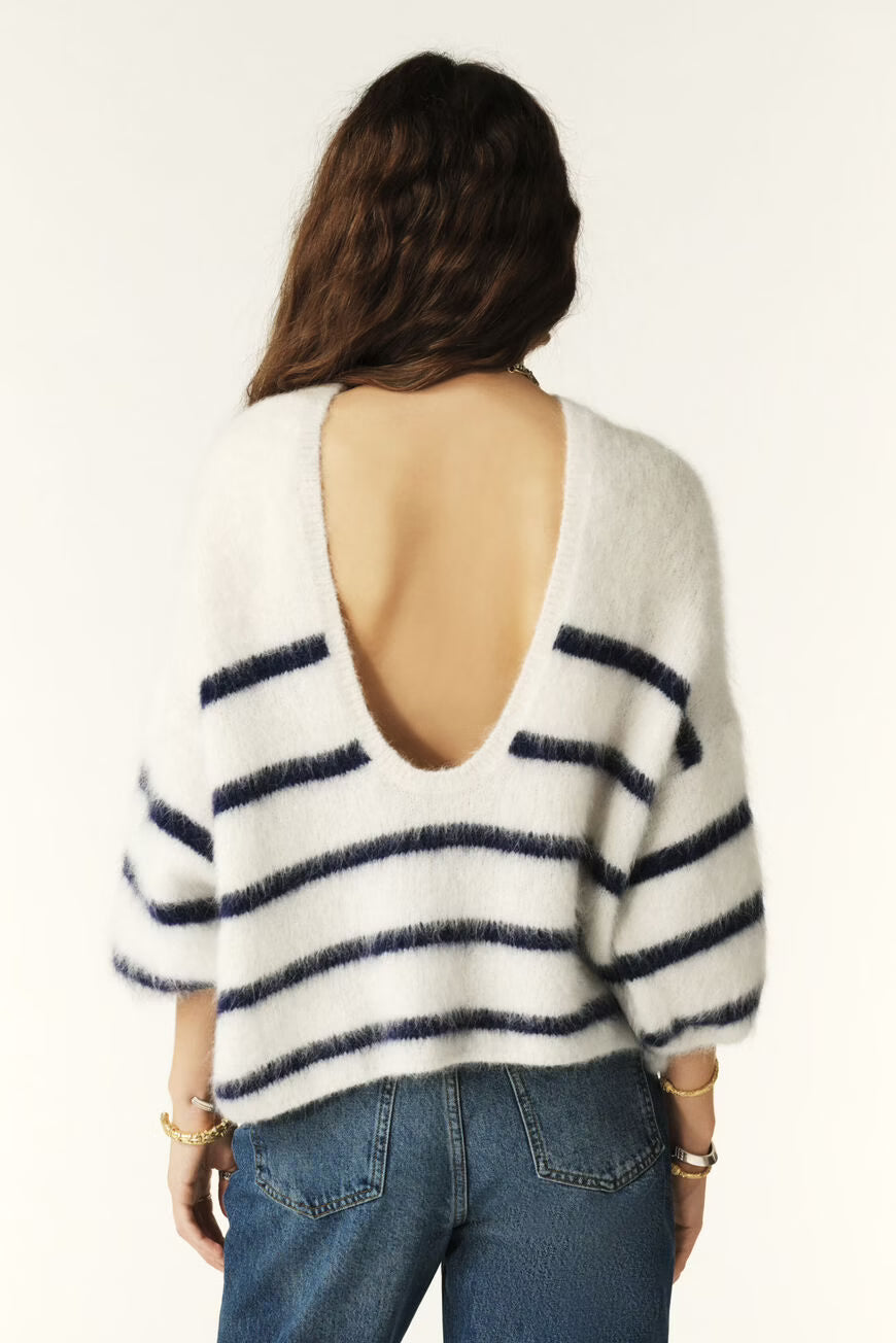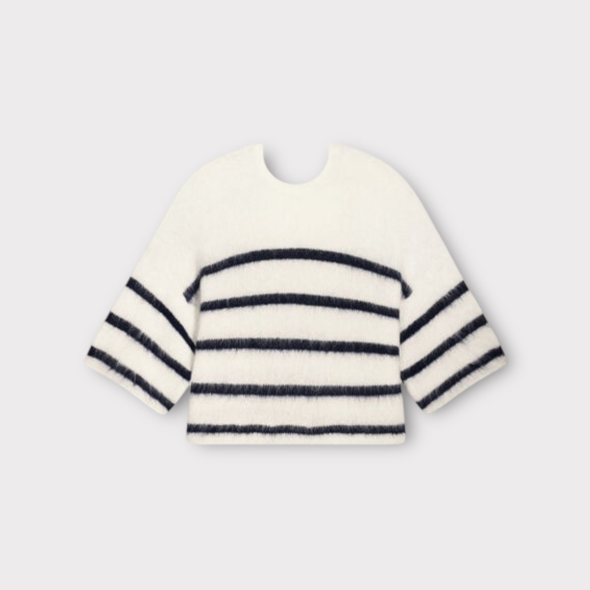 Boxy knit met een ronde hals, v-hals aan de achterkant, gestreept patroon en 3/4 mouwen.