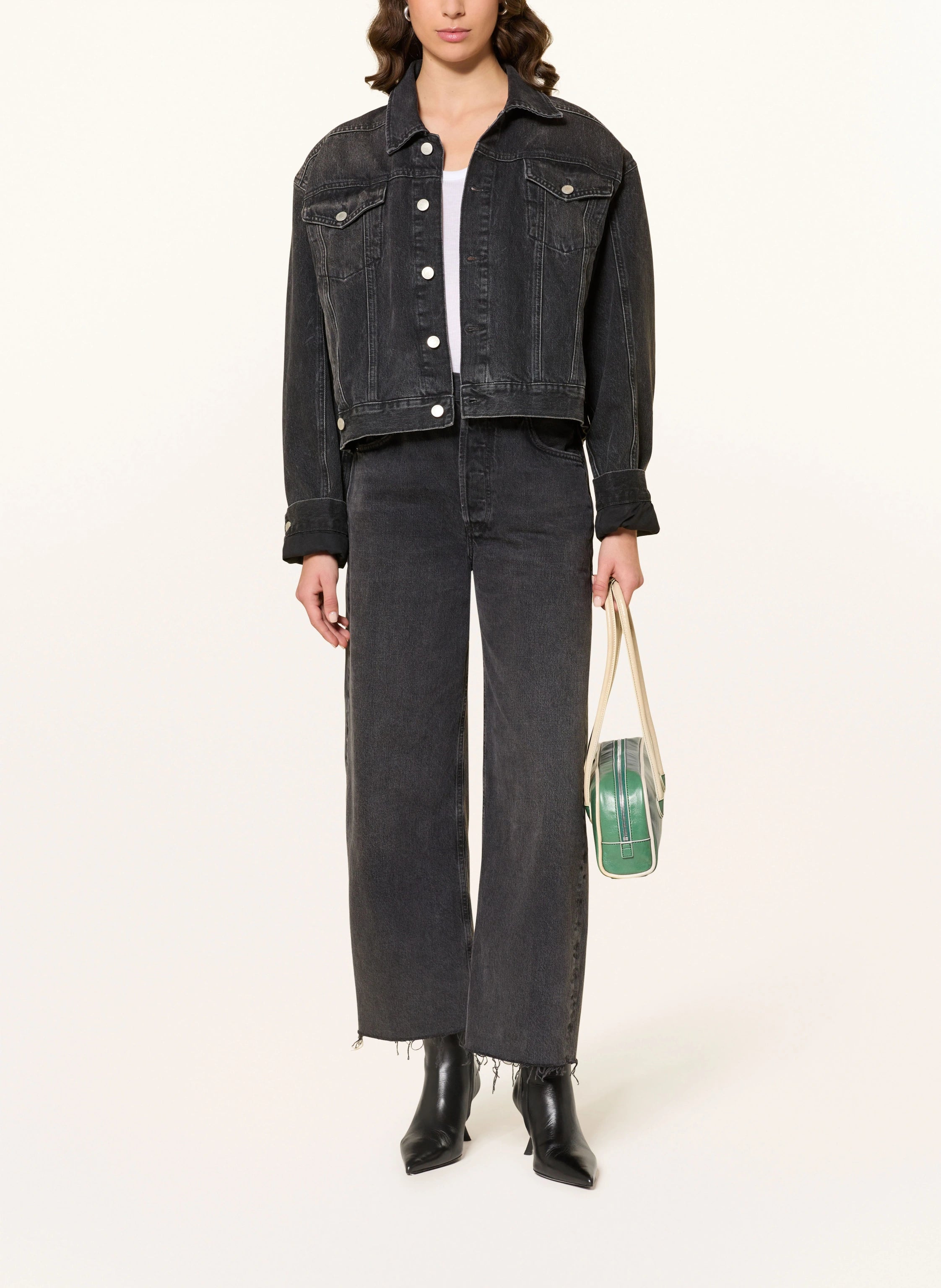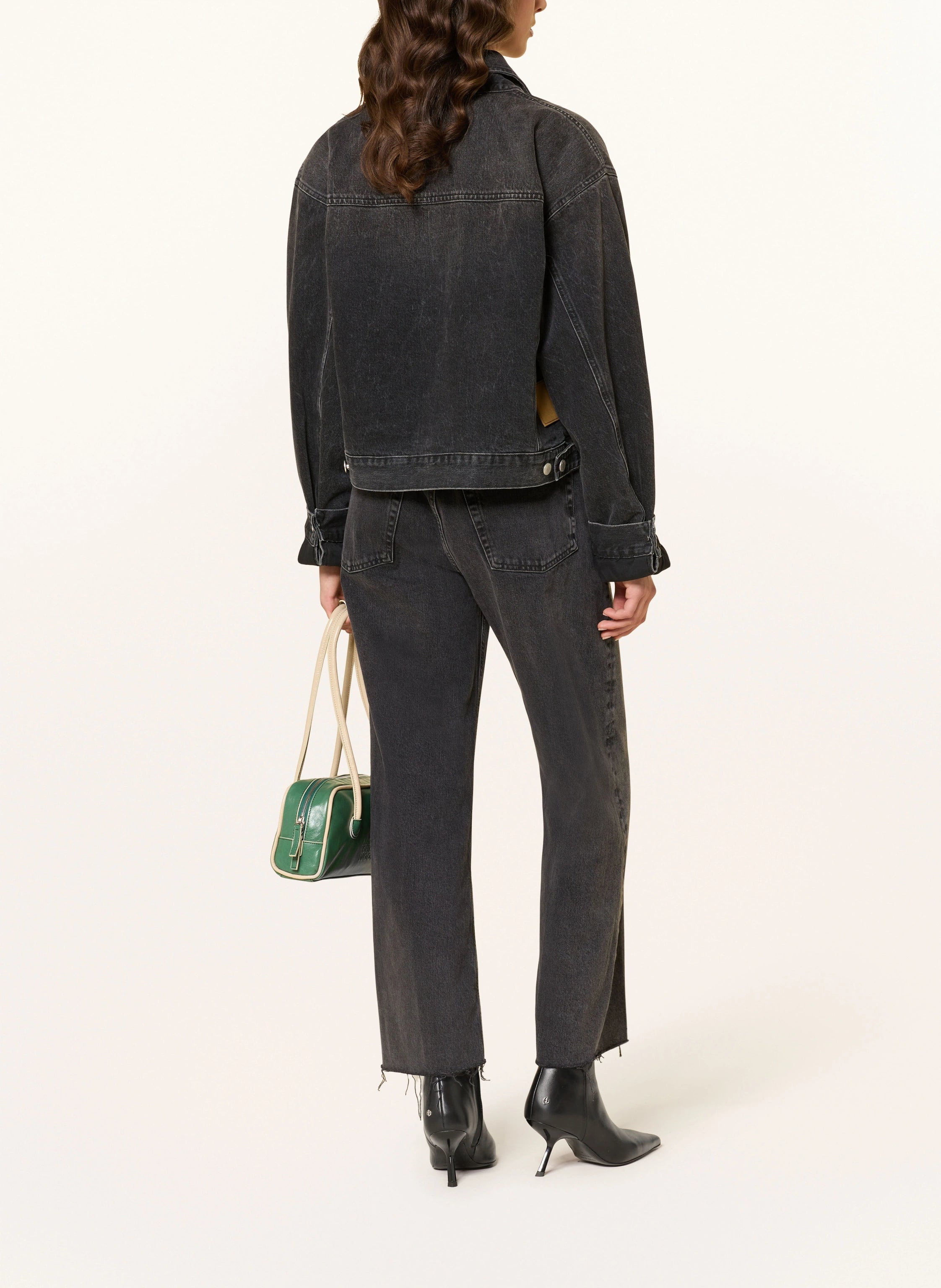 Donkergrijze jeans met een mid waist, relaxed fit, verkorte wijde been, knoopsluiting, 5 pocket, franjes aan de onderkant van de pijpen en leren badge op de tailleband.